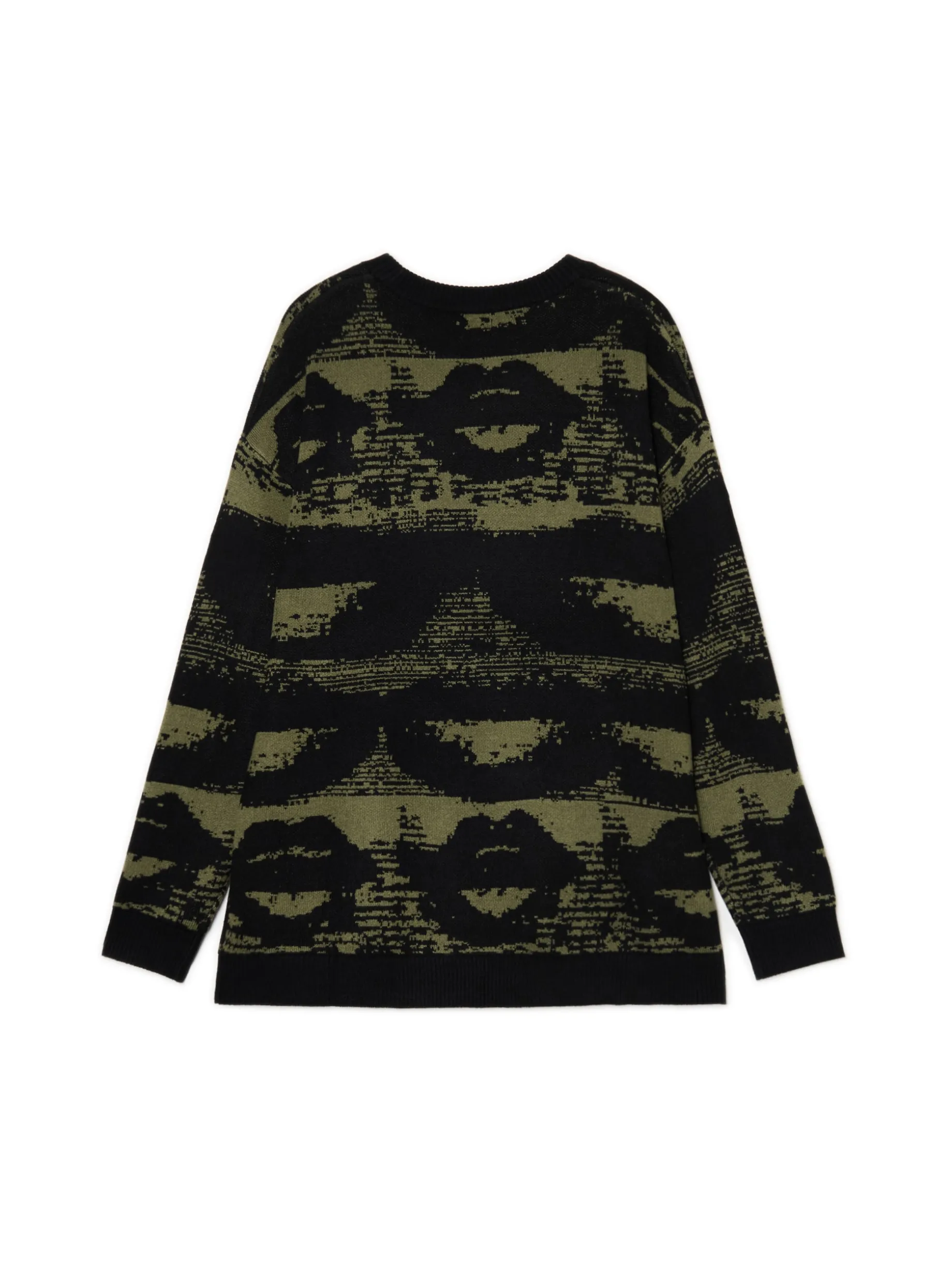 Sweter o kroju oversize uszyty z dzianiny w czarnym kolorze. Na całej powierzchni artystyczny nadruk z motywem ust. Ten item jest przyjemny w dotyku, więc otuli Cię w chłodne wieczory! uszyty z dzianiny o drobnym splocie krój oversize okrągły dekolt z lamówką dół i rękawy wykończone prążkowanym ściągaczem delikatny efekt sprania oryginalny print