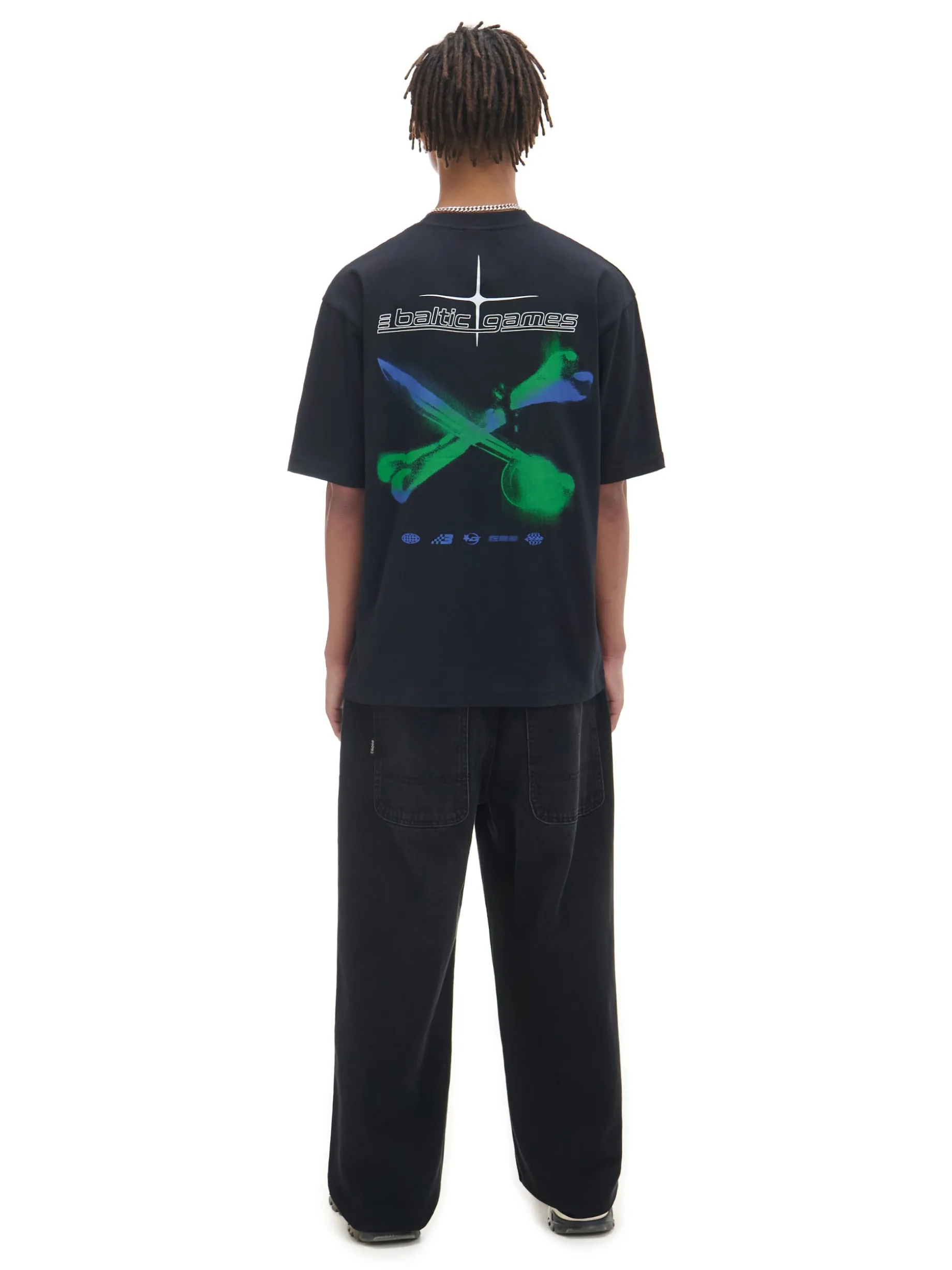 Czarna męska koszulka, uszyta w 100% z bawełny. wygodny krój comfort krótkie rękawy z przodu i z tyłu nadruki Baltic Games