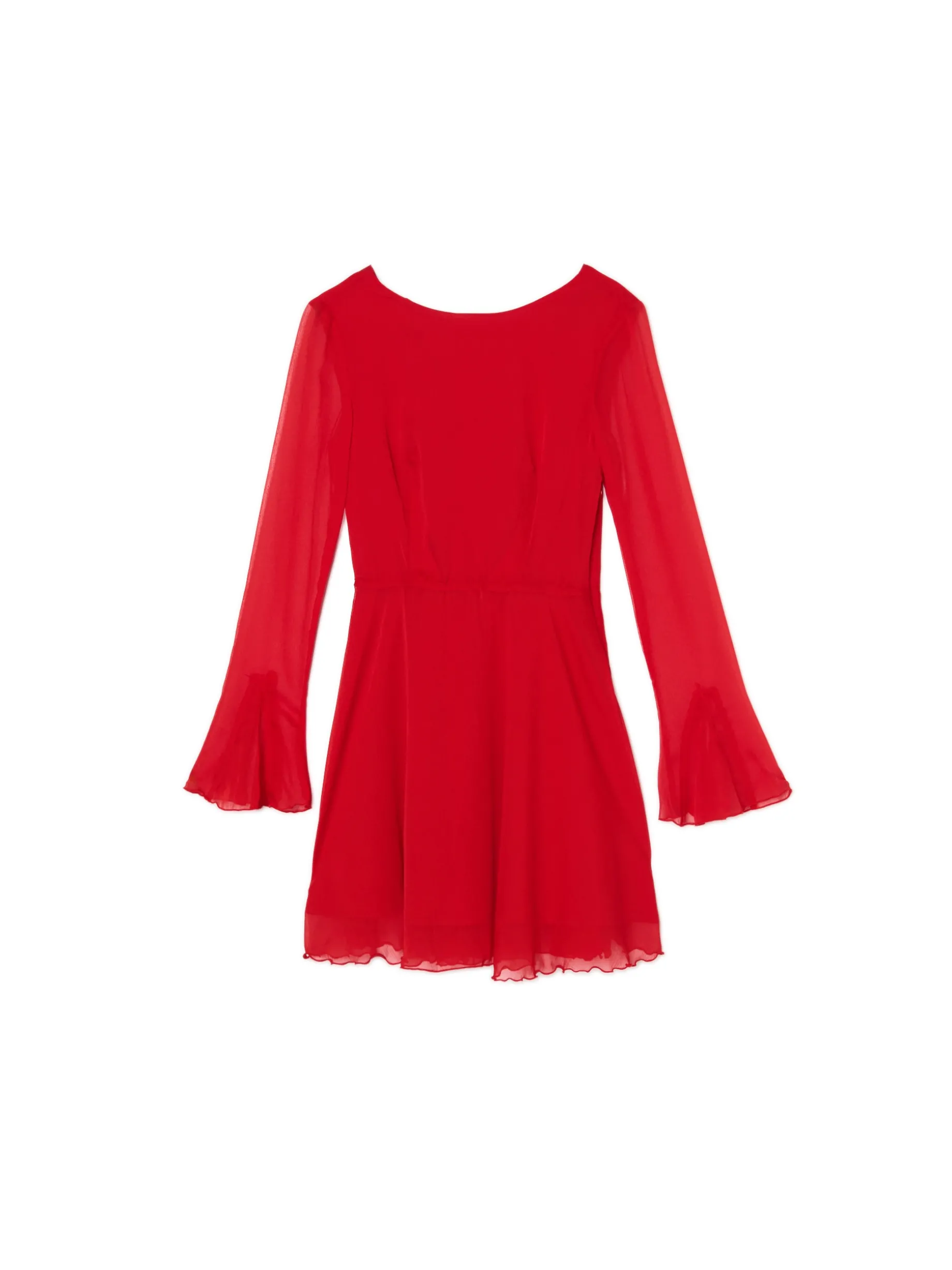 Łap szyfonową damską sukienkę z delikatnymi falbanami na dole i przy rękawach. Ten wyrazisty czerwony kolor będzie wyglądał sztosowo podczas świątecznych meetingów z rodziną i nie tylko. uszyta z szyfonowej tkaniny długość mini i dopasowany krój lekko rozkloszowany dół odcięcie w talii zapięcie na kryty zamek z boku dekolt w łódkę rękawy z gumką i efektowną falbanką ozdobne wiązanie na plecach ozdobne marszczenia