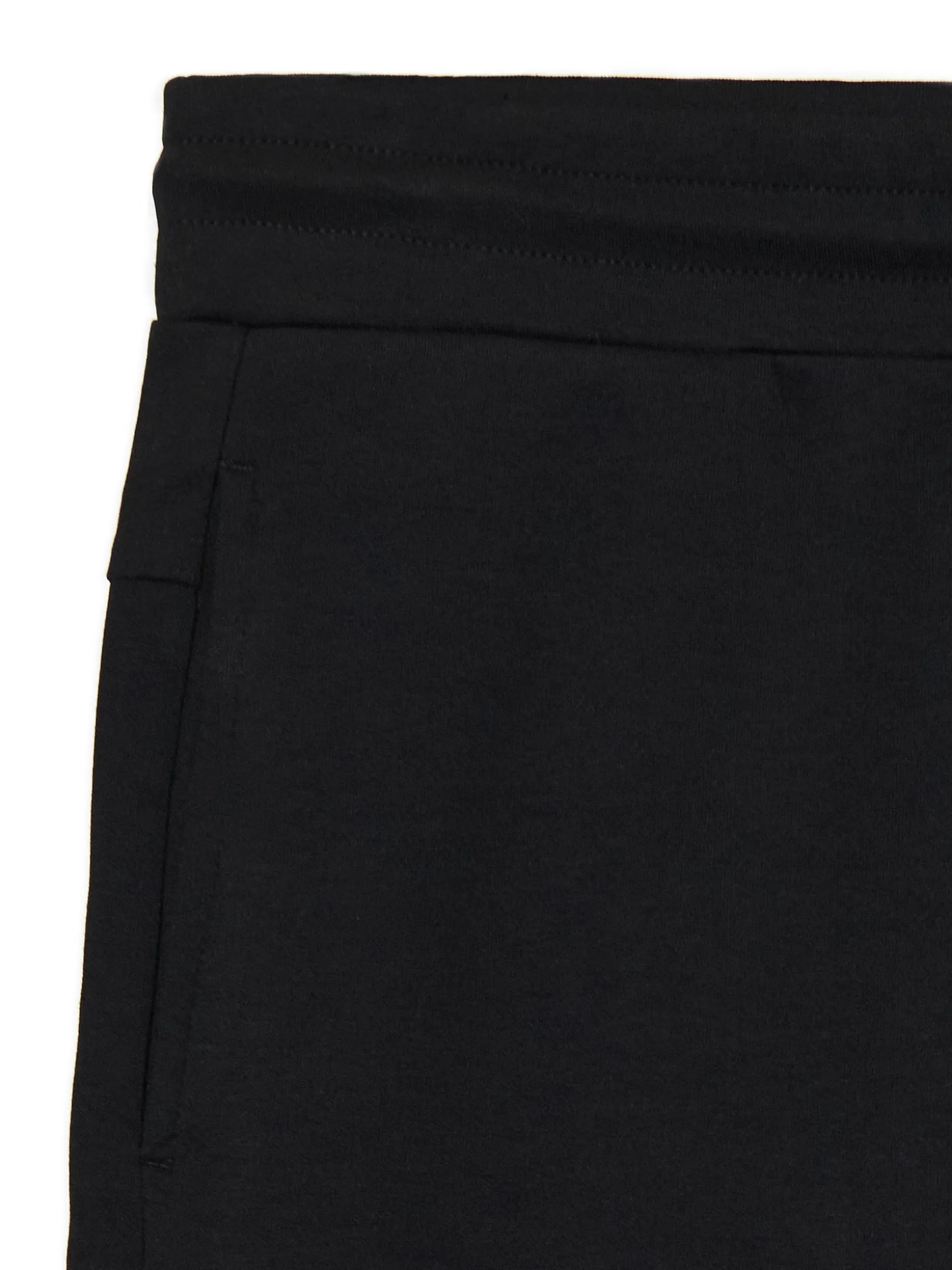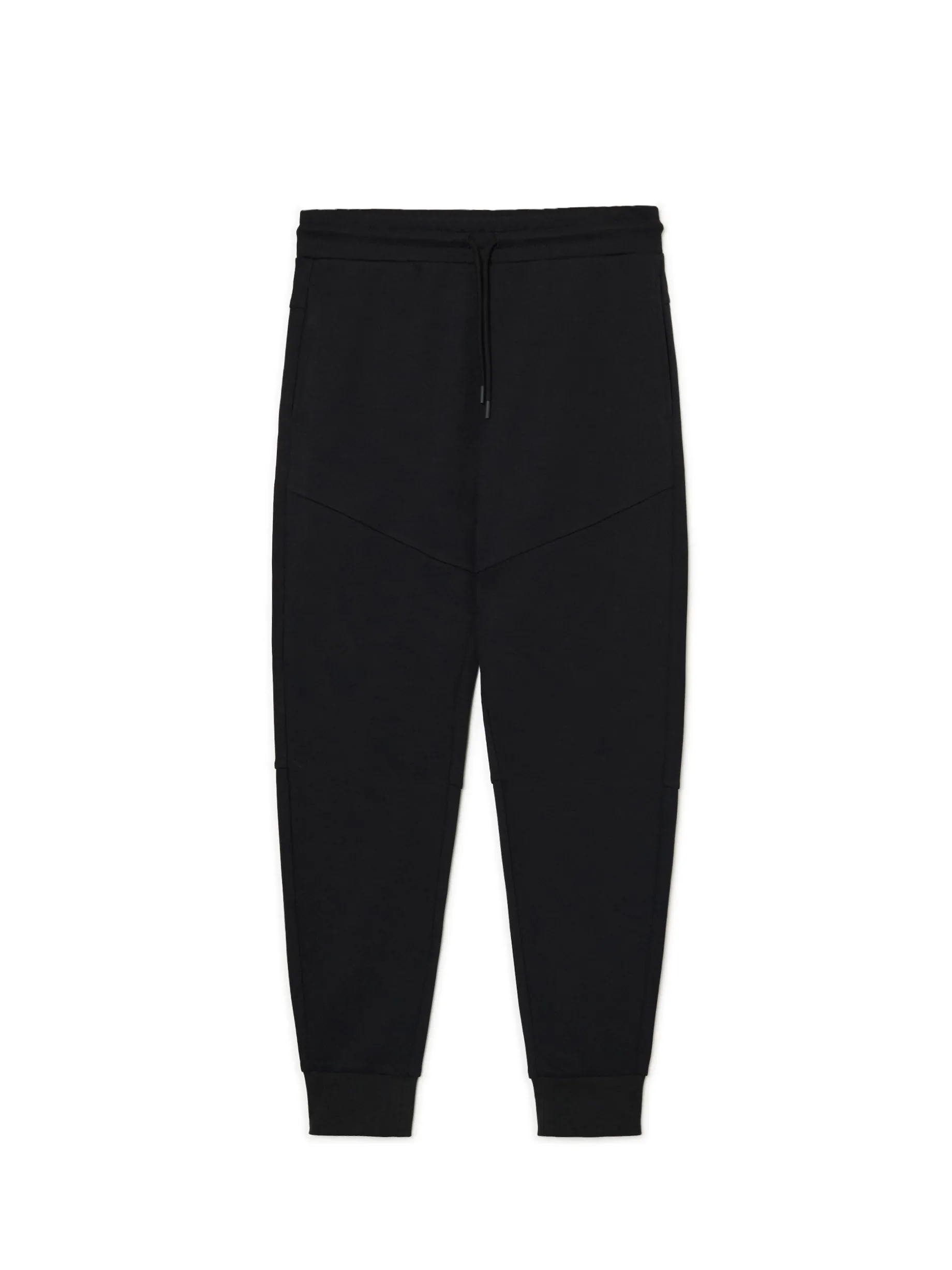 Czarne męskie spodnie typu jogger o kroju regular, uszyte z solidnej, dżersejowej dzianiny zawierającej bawełnę. Dzięki kieszeniom na zamek, Twoje rzeczy będą bezpieczne podczas różnych aktywności. dresowe spodnie typu jogger dzianinowy materiał z bawełną regularny stan gumka w pasie ze sznurkiem do regulacji długie. swobodne nogawki zakończone ściągaczem kieszenie boczne z zamkami ozdobne przeszycia
