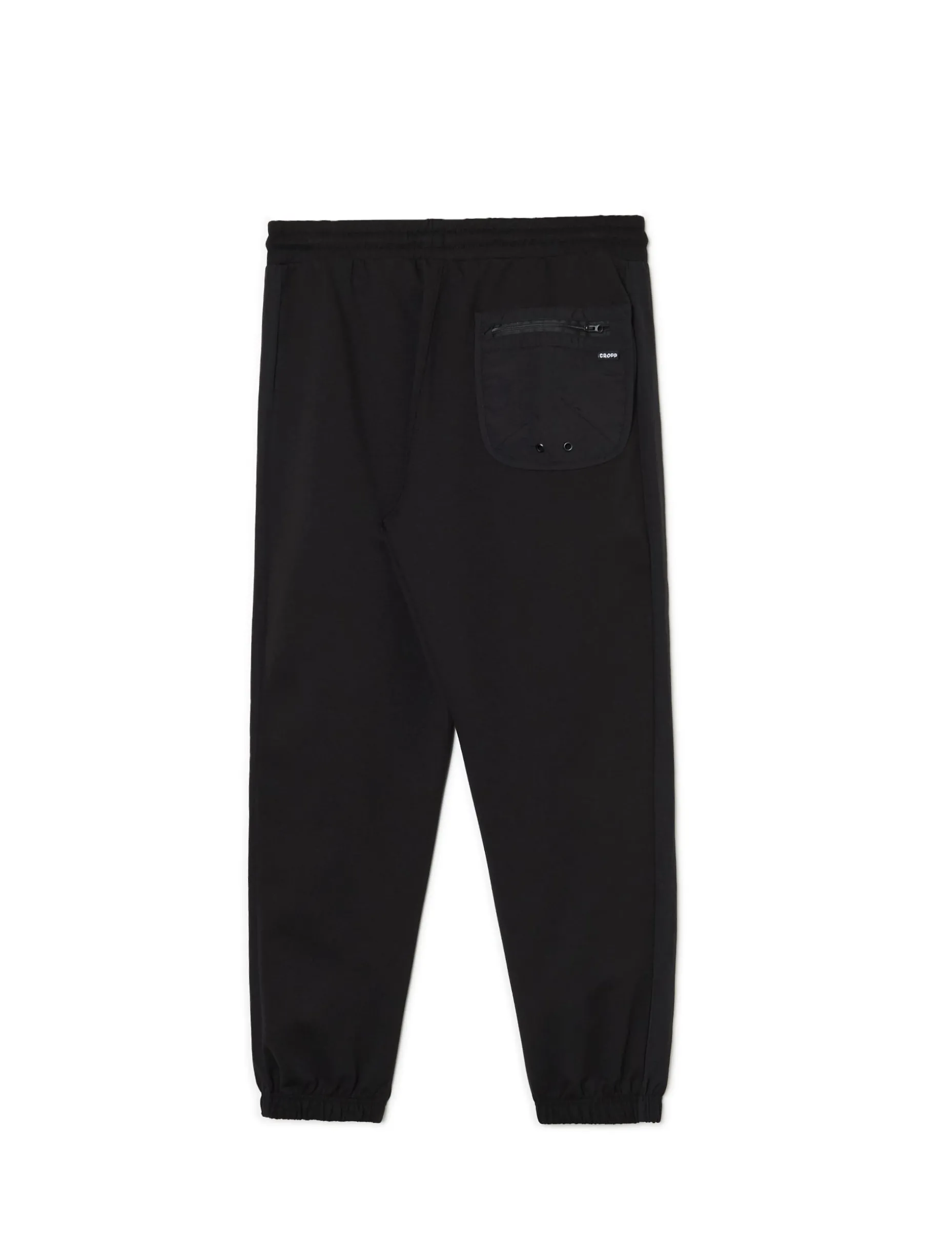 FUnkcjonalne męskie dresy w neutralnym, czarnym kolorze. Solidna, dżersejowa dzianina zawierająca bawełnę zapobiega przetarciom i rozciąganiu się materiału. Ciekawym dodatkiem jest metalowa pętelka do zawieszania, np. kluczy czy otwieracza do piwa. dzianina z dodatkiem elastycznych włókien wygodny krój comfort guma w pasie ze sznurkiem do regulacji podwójne sznurowanie w pasie długie nogawki wykończone ściągaczem dwie kieszenie z przodu z tyłu kieszeń z zamkiem dodatkowa metalowa szlufka z nadrukiem naszywka z napisem Cropp