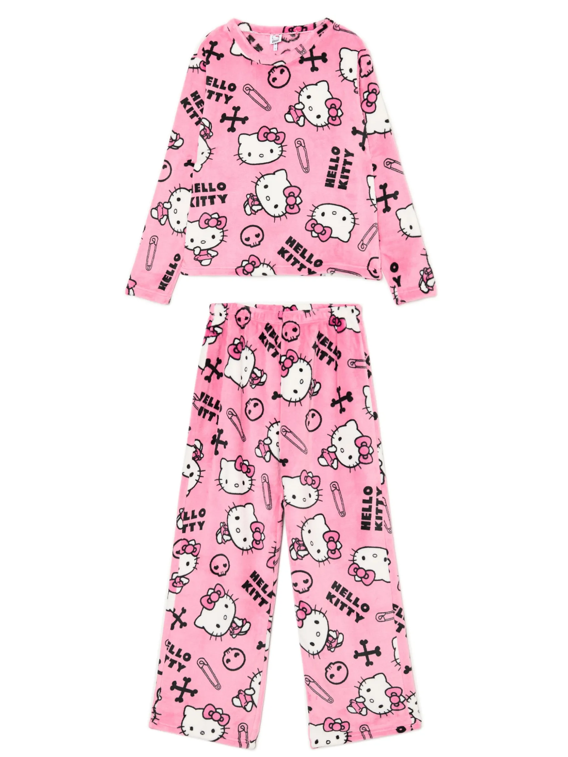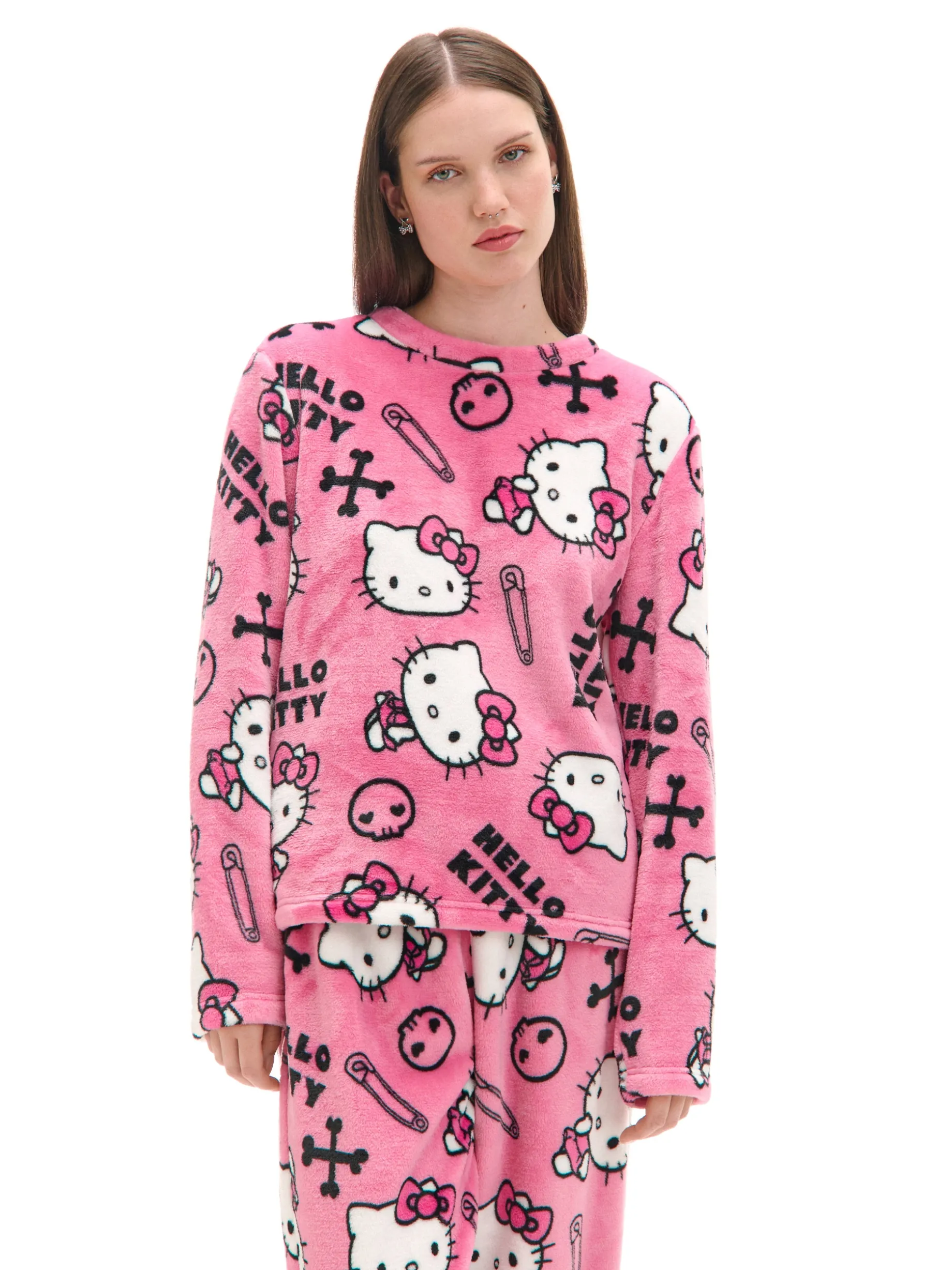 Ciepła damska piżama uszyta z miękkiej w dotyku, pluszowej dzianiny. Wszyta powłoka elektrostatyczna zapobiega elektryzowaniu się i gnieceniu materiału. Na całości licencjonowany nadruk z uroczym kotem Hello Kitty. Ten item otuli Cię w chłodne noce! uszyta z miękkiego, pluszowego materiału koszulka longsleeve o regularnym kroju okrągły dekolt z lamówką długie, luźne rękawy spodnie o regularnym kroju elastyczna gumka w pasie długie, swobodne nogawki nadruk z motywem Hello Kitty Tworzy zestaw z modelem: 708AU-30X . © 2024 SANRIO CO., LTD.