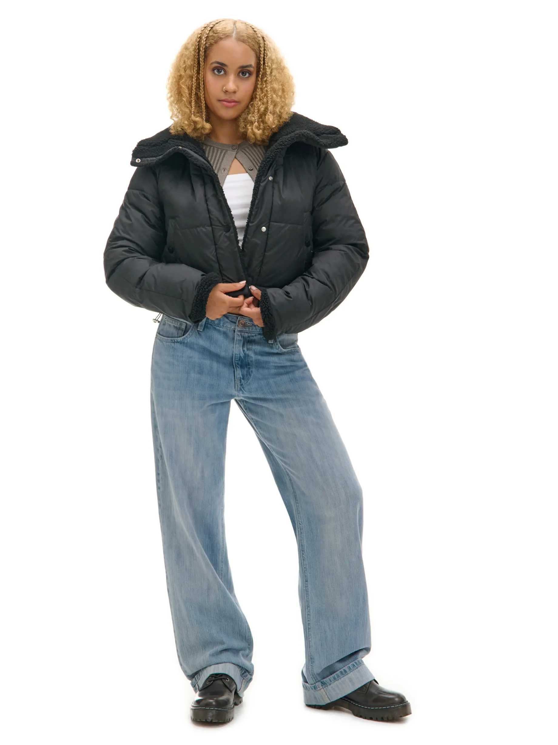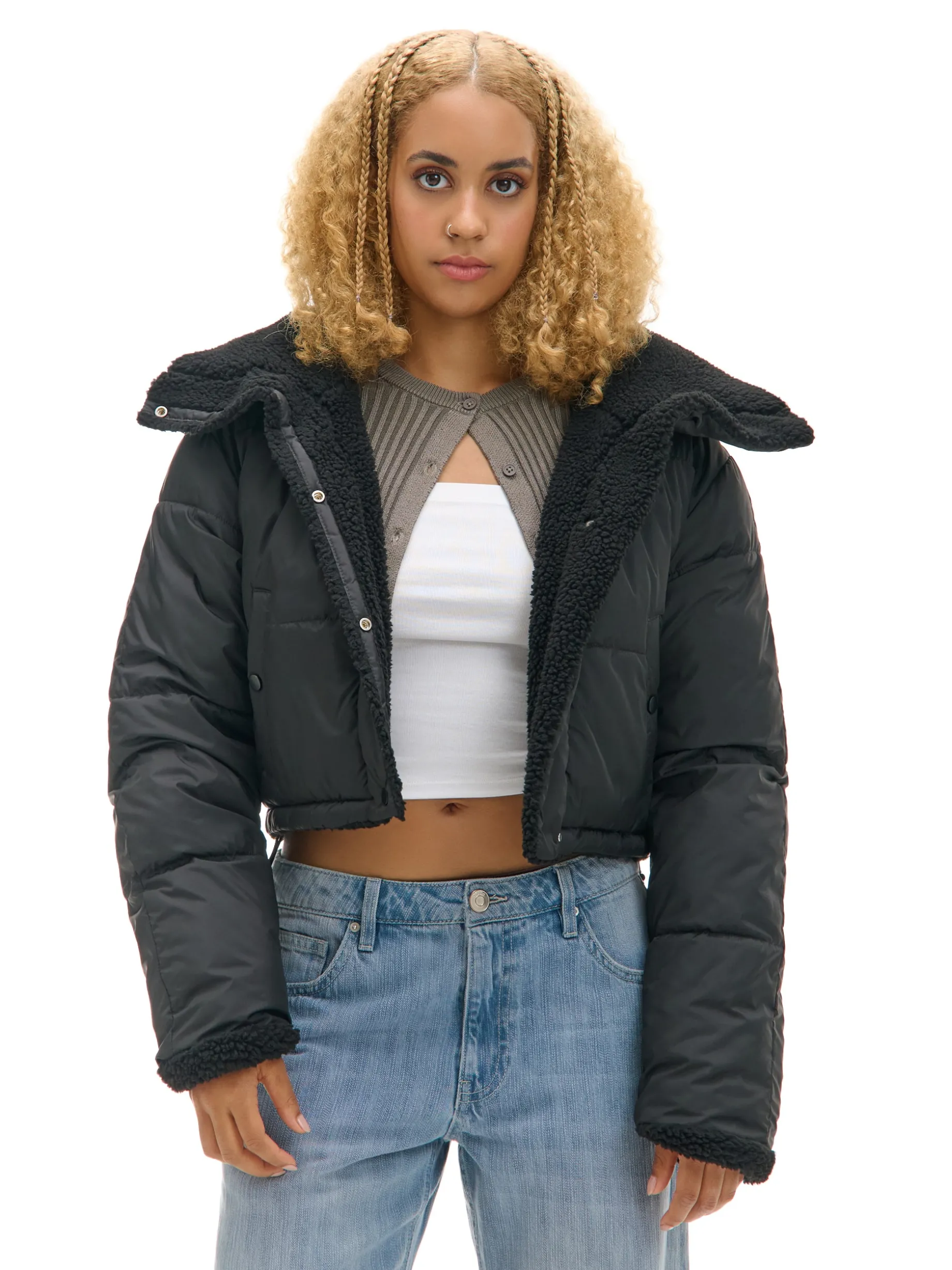 Dwie różne kurtki w jednym modelu! Hitowy damski model pufferki uszyty z jednej strony z lekkiej, trwałej tkaniny, a z drugiej z imitacji baranka. W zależności od nastroju i pomysłu na wyjątkową stylizację – wybierz odpowiednią stronę. przejściowa kurtka sherpa krój oversize pikowanie na całości zapięcie na zatrzaski na całej długości wykończenie na podszyciu ze sztucznego baranka kołnierz z szerokimi klapami boczne kieszenie z zatrzaskami dostępna w dwóch kolorach