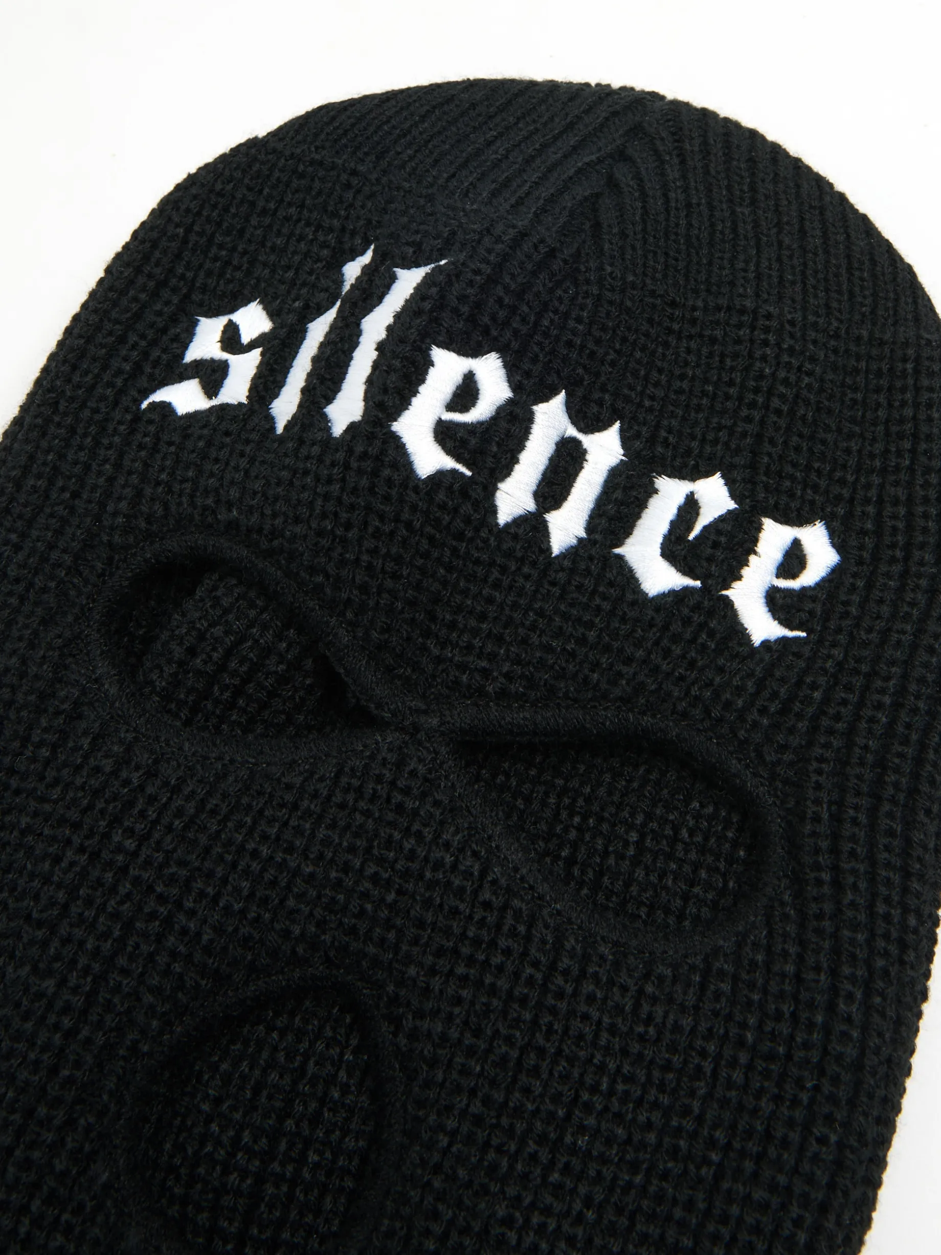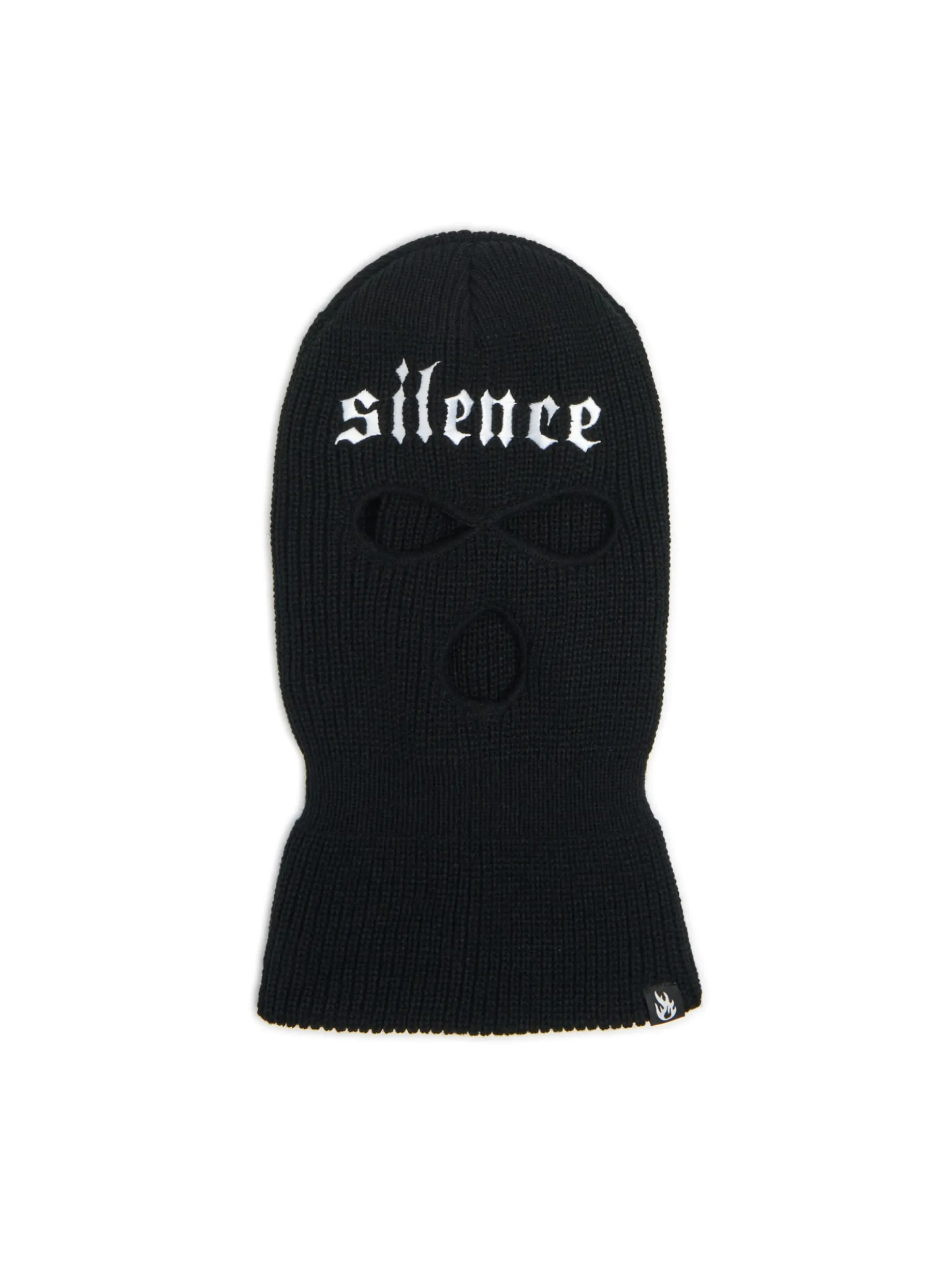 Sztosowy dodatek zimowych stylizacji! Męska kominiarka uszyta z czarnej, przyjemnej w dotyku, mieszanki dzianin. Wyposażona w wygodne otwory na oczy i usta. Dodatkowo na przodzie naszywki w kształcie płomienia i napisu 'silence’.