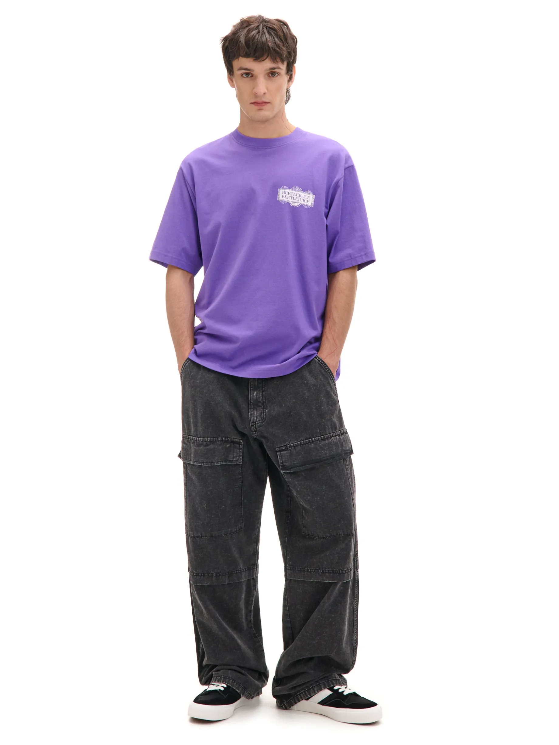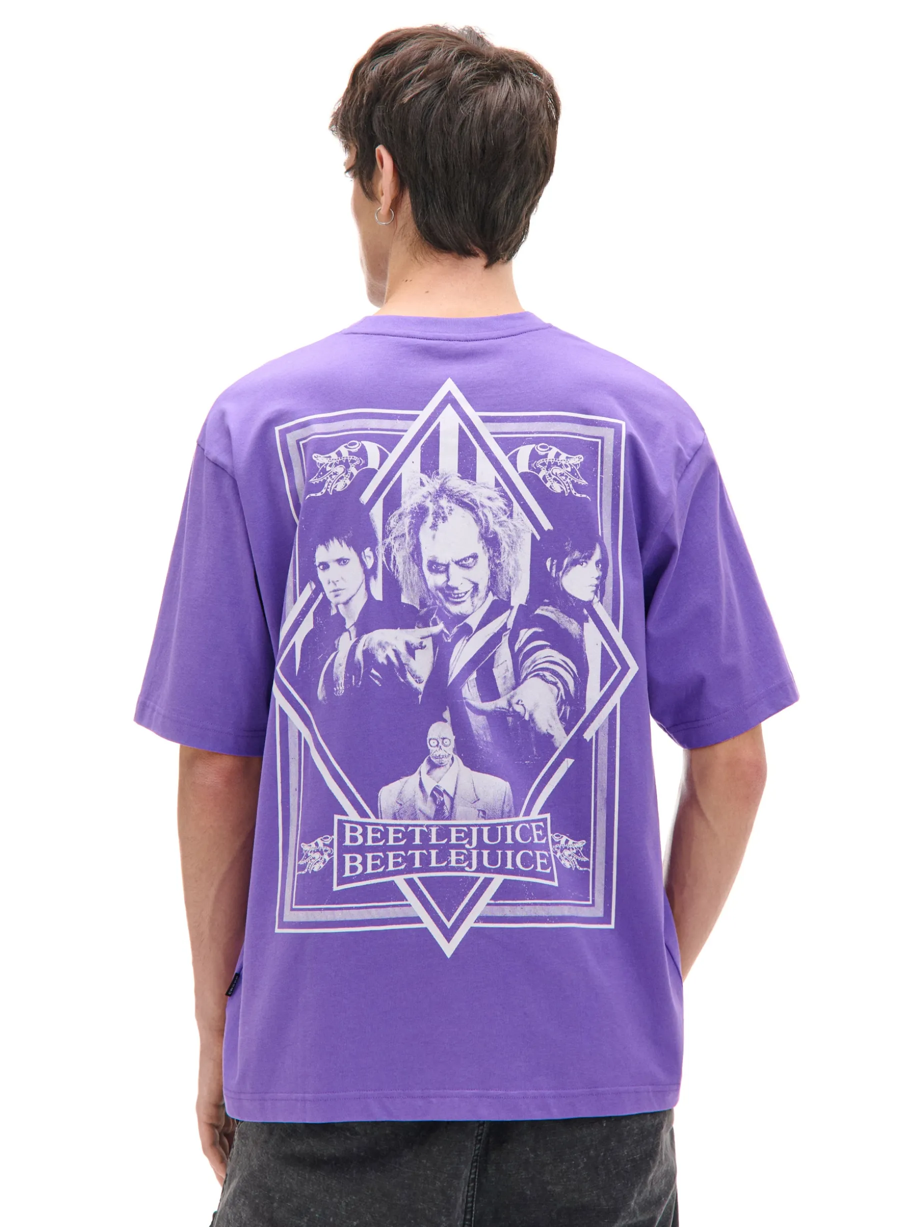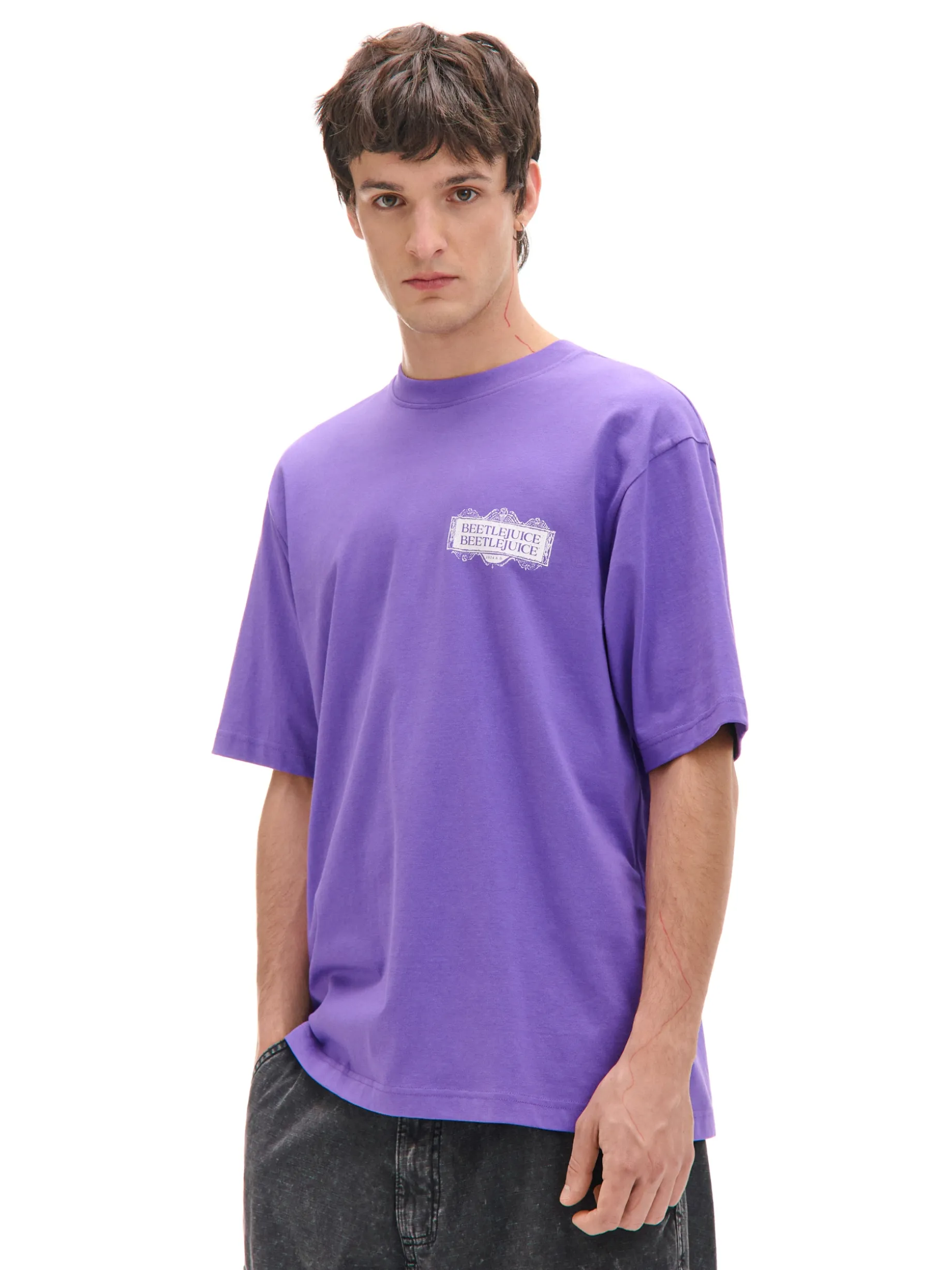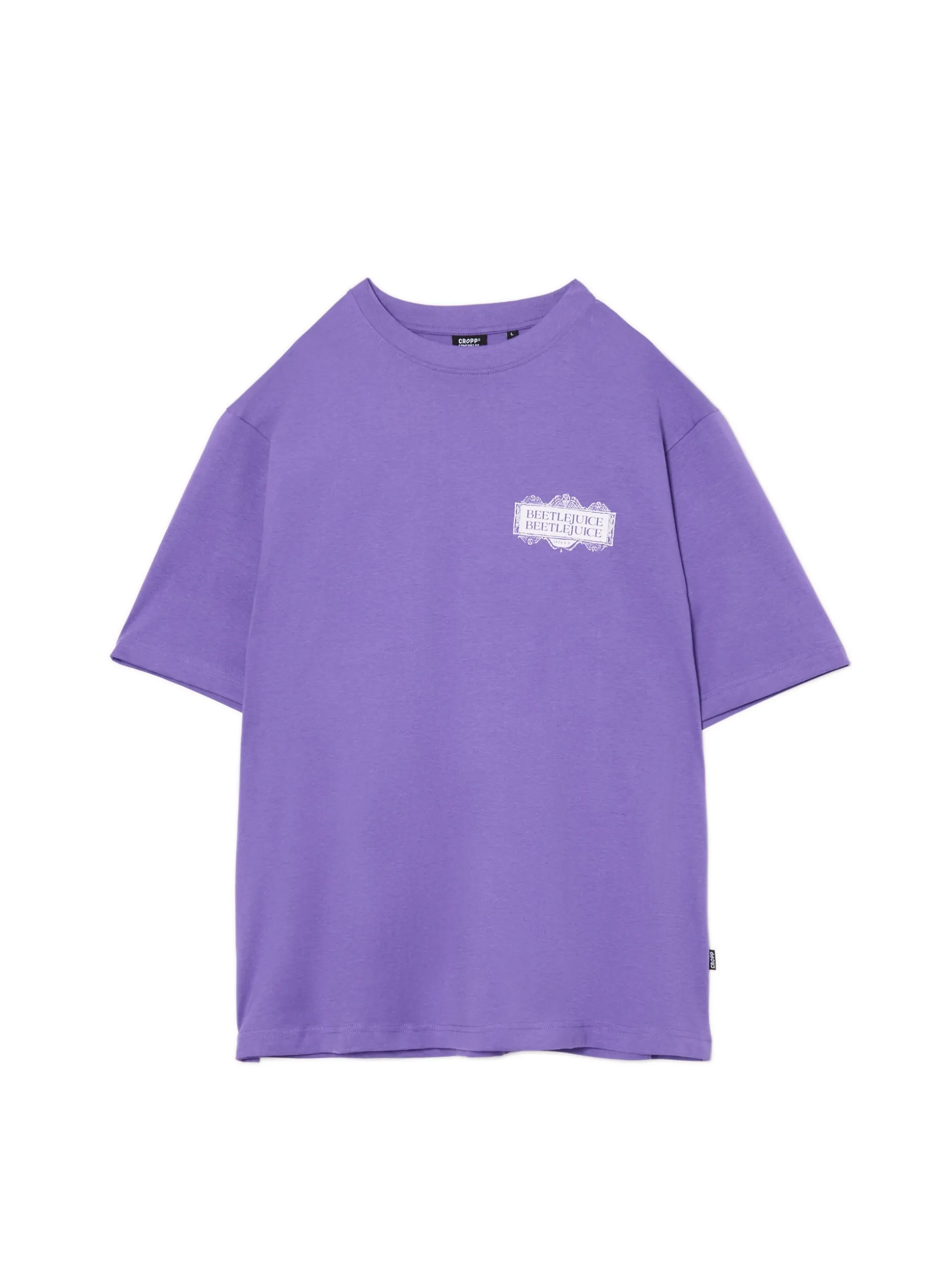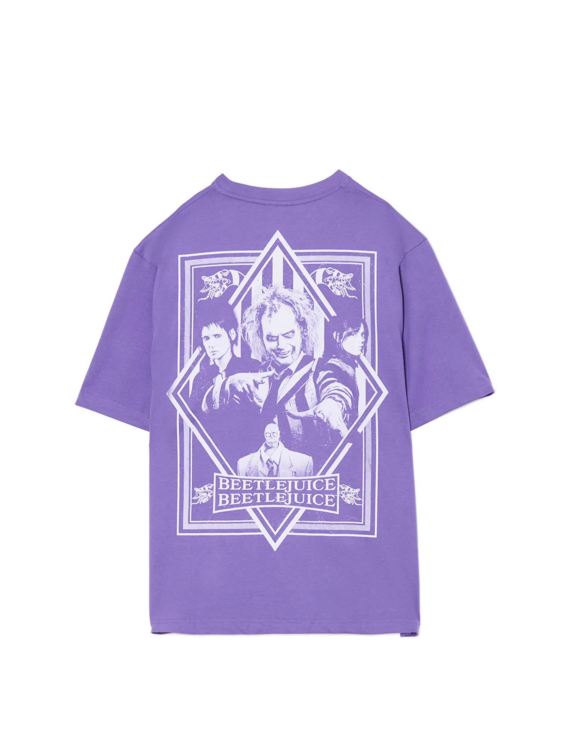 Męski T-shirt z krótkim rękawem uszyty z bawełnianej dzianiny w kolorze fioletowym. Nadruki po obu stronach z motywem i postaciami z filmu Beetlejuice, Beetlejuice… klik i do koszyka! 100% bawełny wygodny krój comfort okrągły dekolt z lamówką krótkie, swobodne rękawy nadruk z motywem Halloween BEETLEJUICE BEETLEJUICE and all related characters and elements © & TM WBEI. (s24)