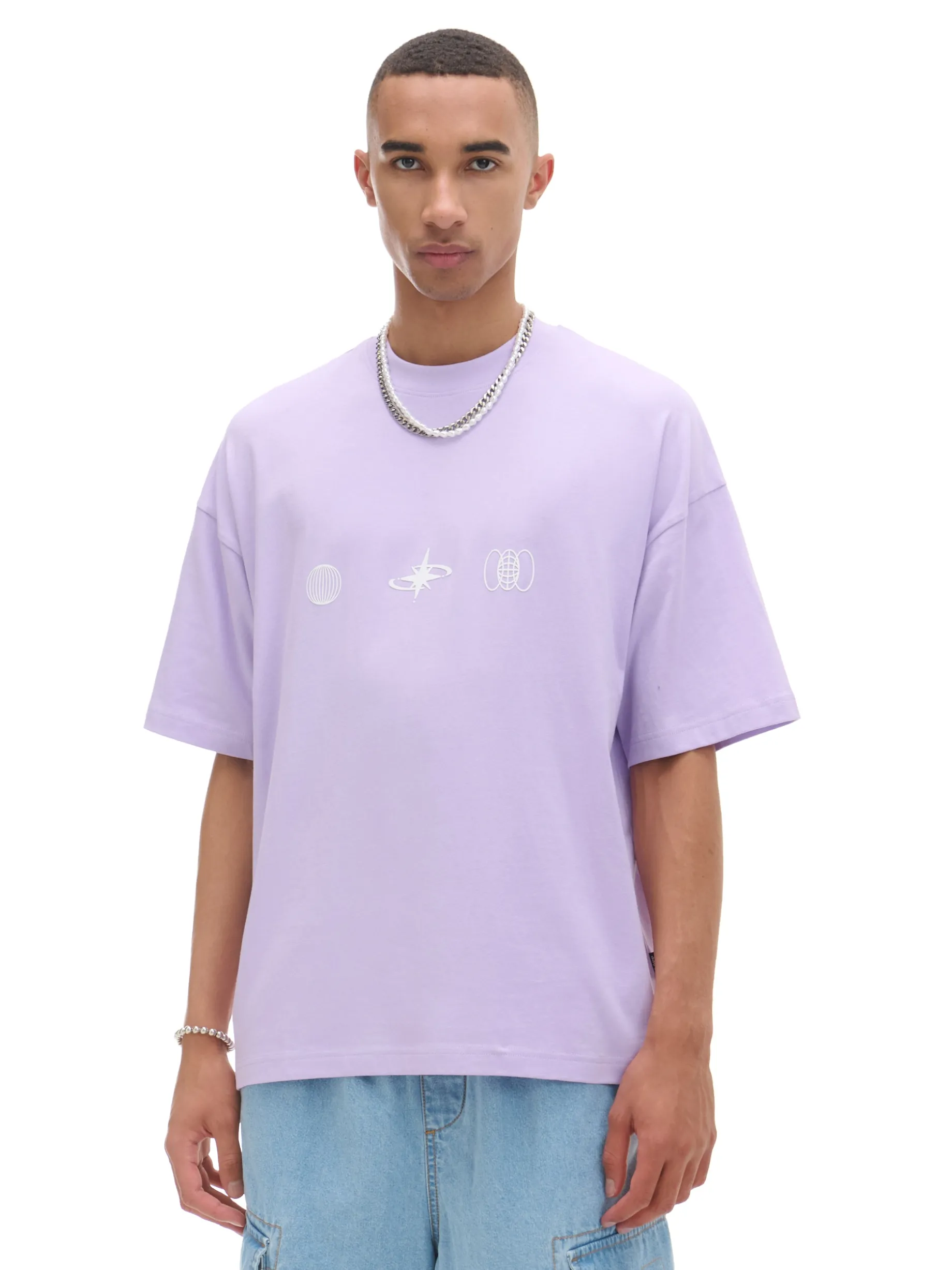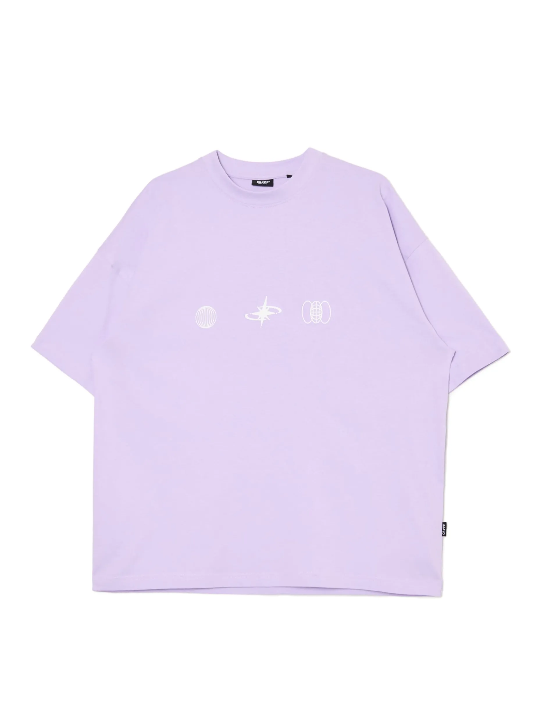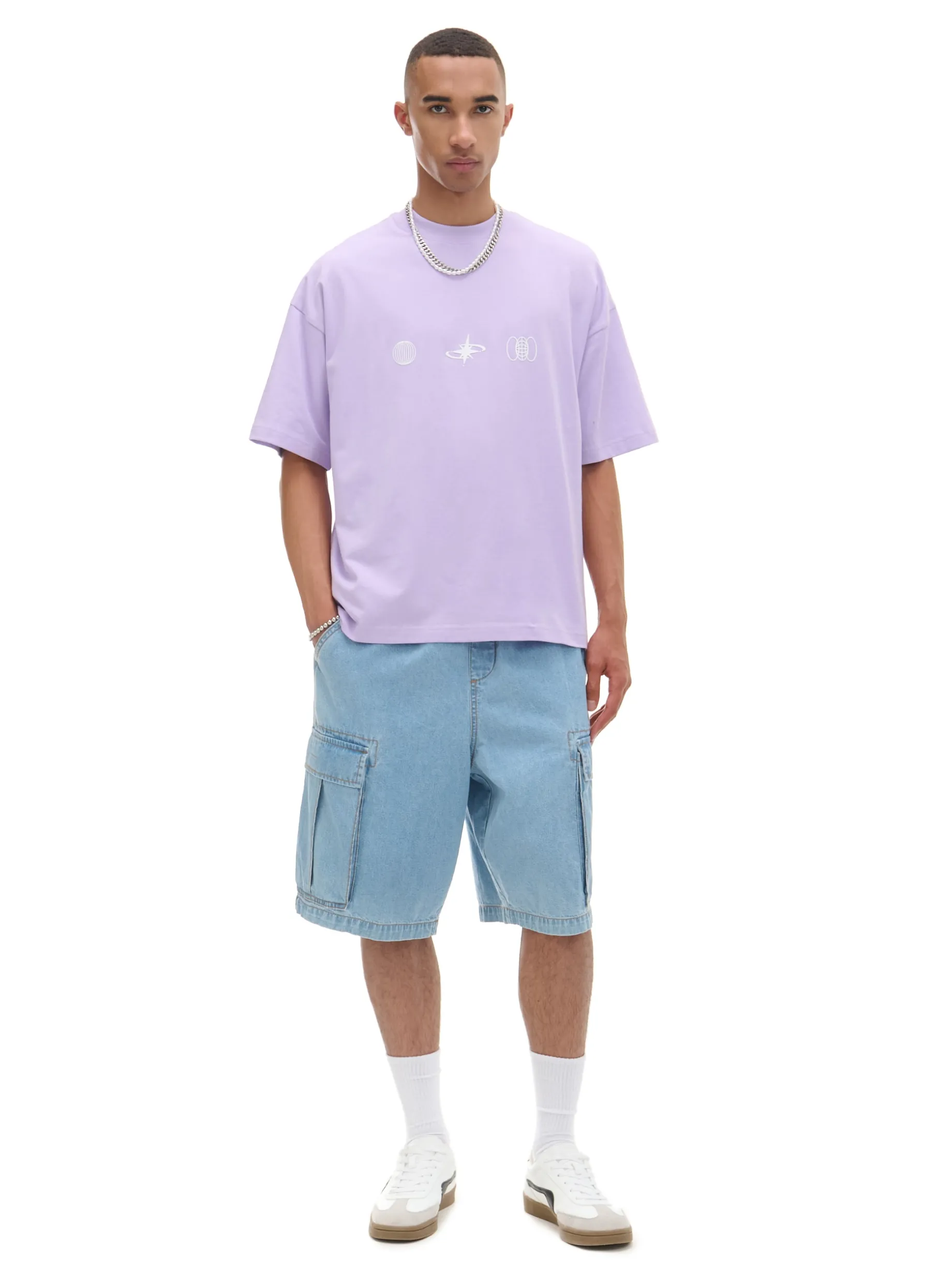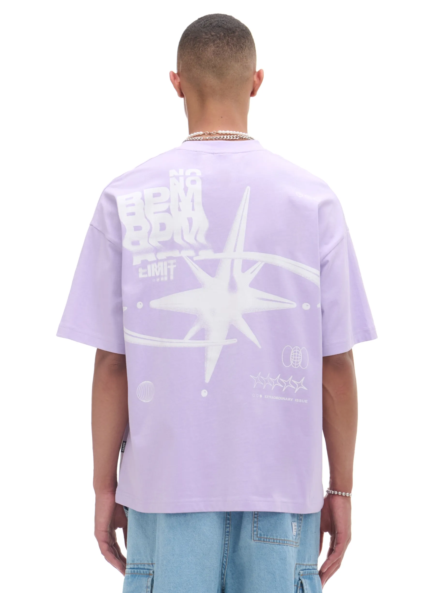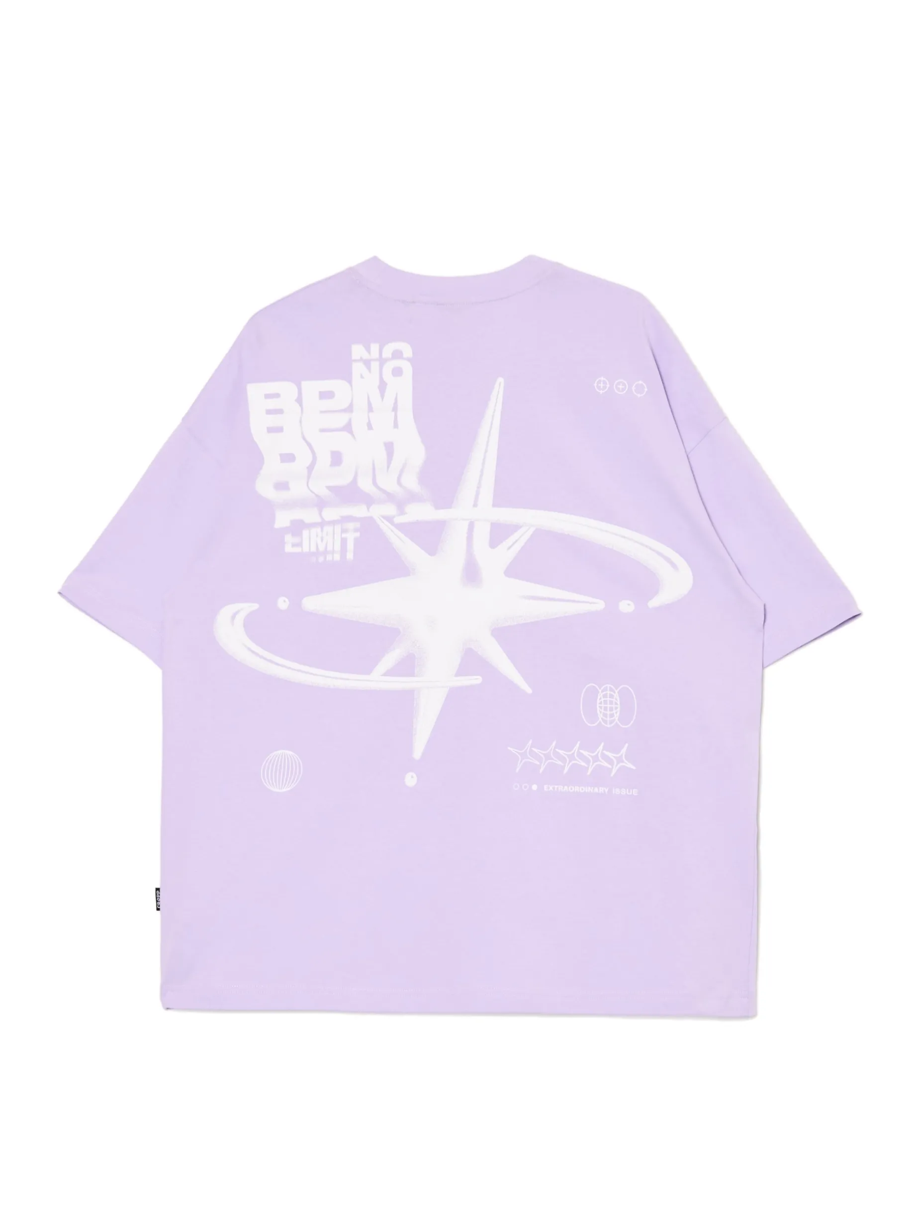 T-shirt męski w kolorze lawendowym, uszyty z bawełnianego materiału. Ozdobą tego modelu jest drobny nadruk na piersi i duży na plecach. 100% bawełny obszerny krój typu boxy krótkie, swobodne rękawy delikatnie obniżona linia ramion mały nadruk na piersi, duży nadruk na plecach Wzrost modela: 185 cm