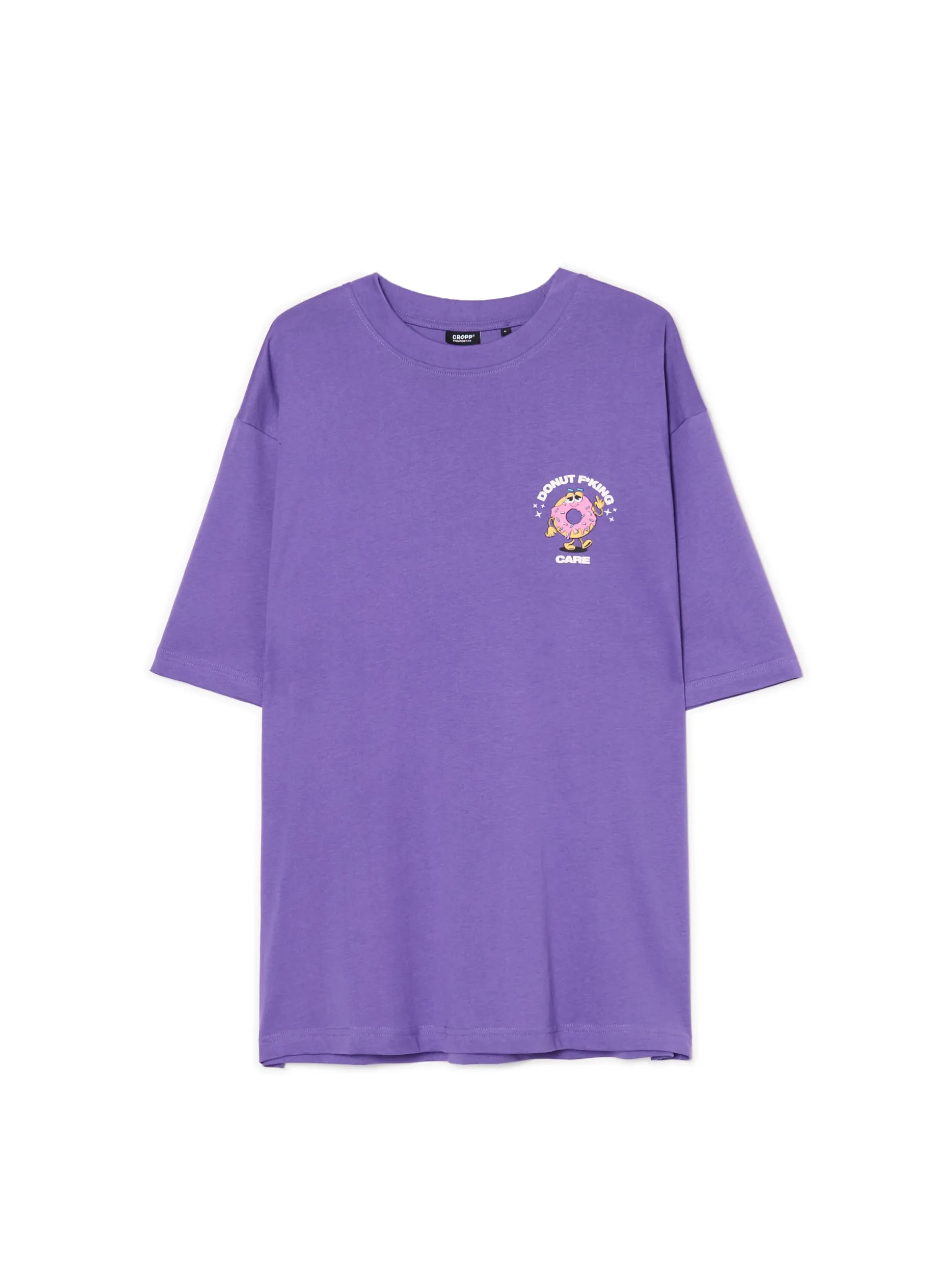 Męski T-shirt z krótkim rękawem uszyty z bawełnianej dzianiny w fioletowym kolorze. Na piersi niewielki nadruk uroczego pączka i jego życiowego motta. 100% bawełny wygodny krój comfort okrągły dekolt krótkie rękawy lekko obniżona linia ramion niewielki nadruk z przodu