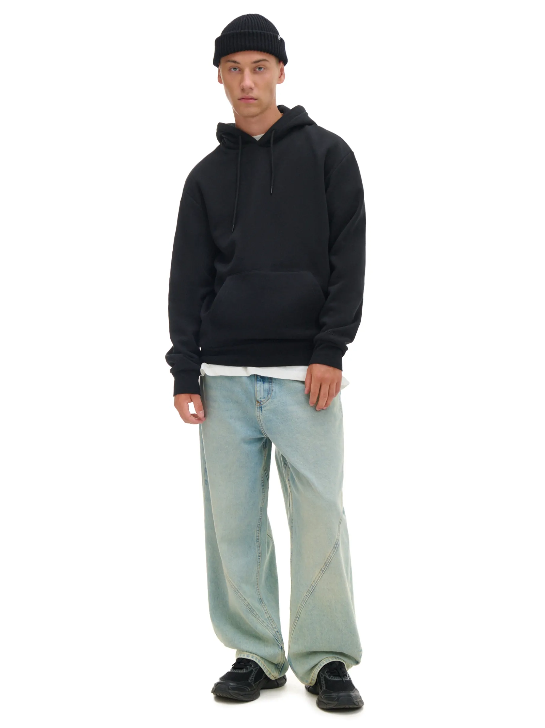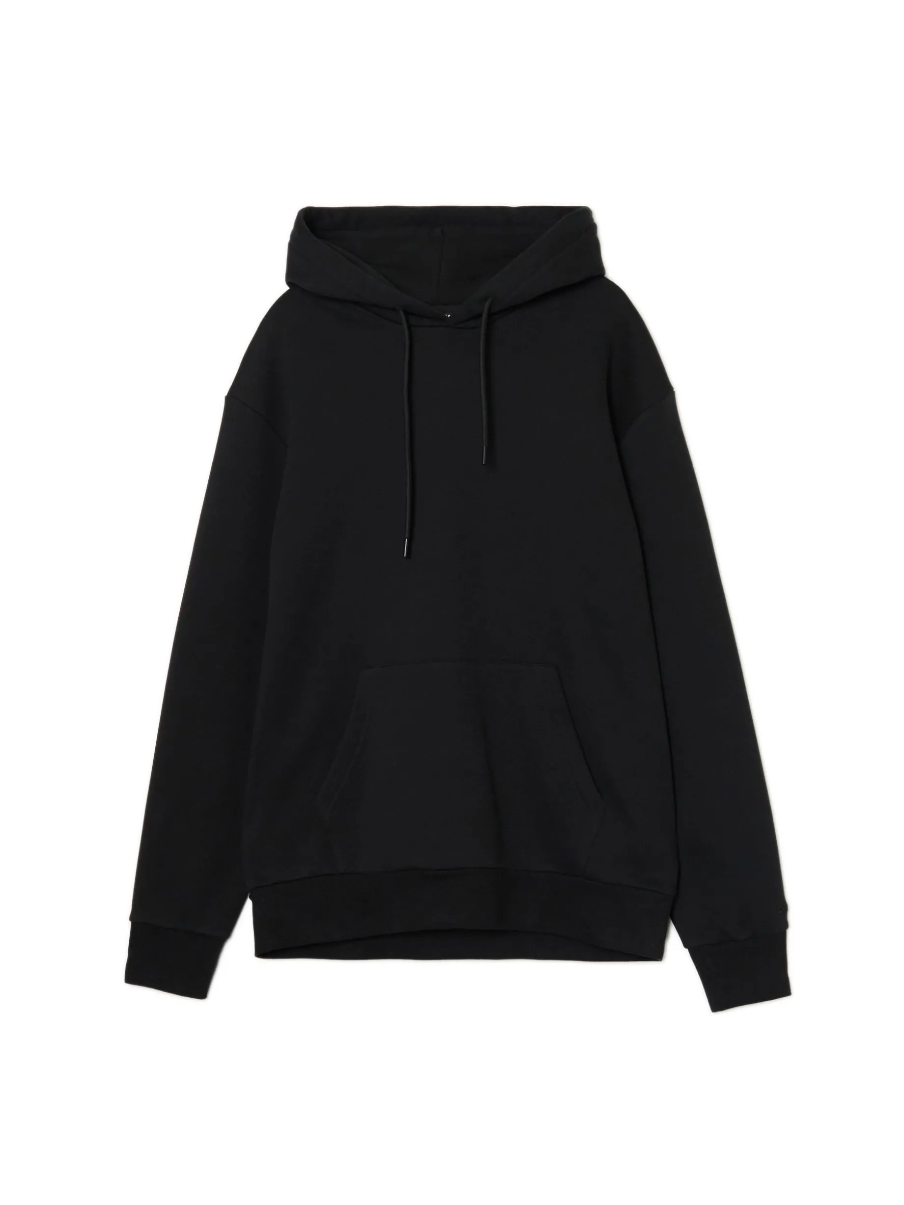Czarna bluza z kapturem w stylu basic, uszyta z dzianiny o wysokiej zawartości bawełny. regularny krój kaptur regulowany sznurkiem rękawy i dół zakończoe ściągaczem kieszeń kangurka Wzrost modela: 185 cm