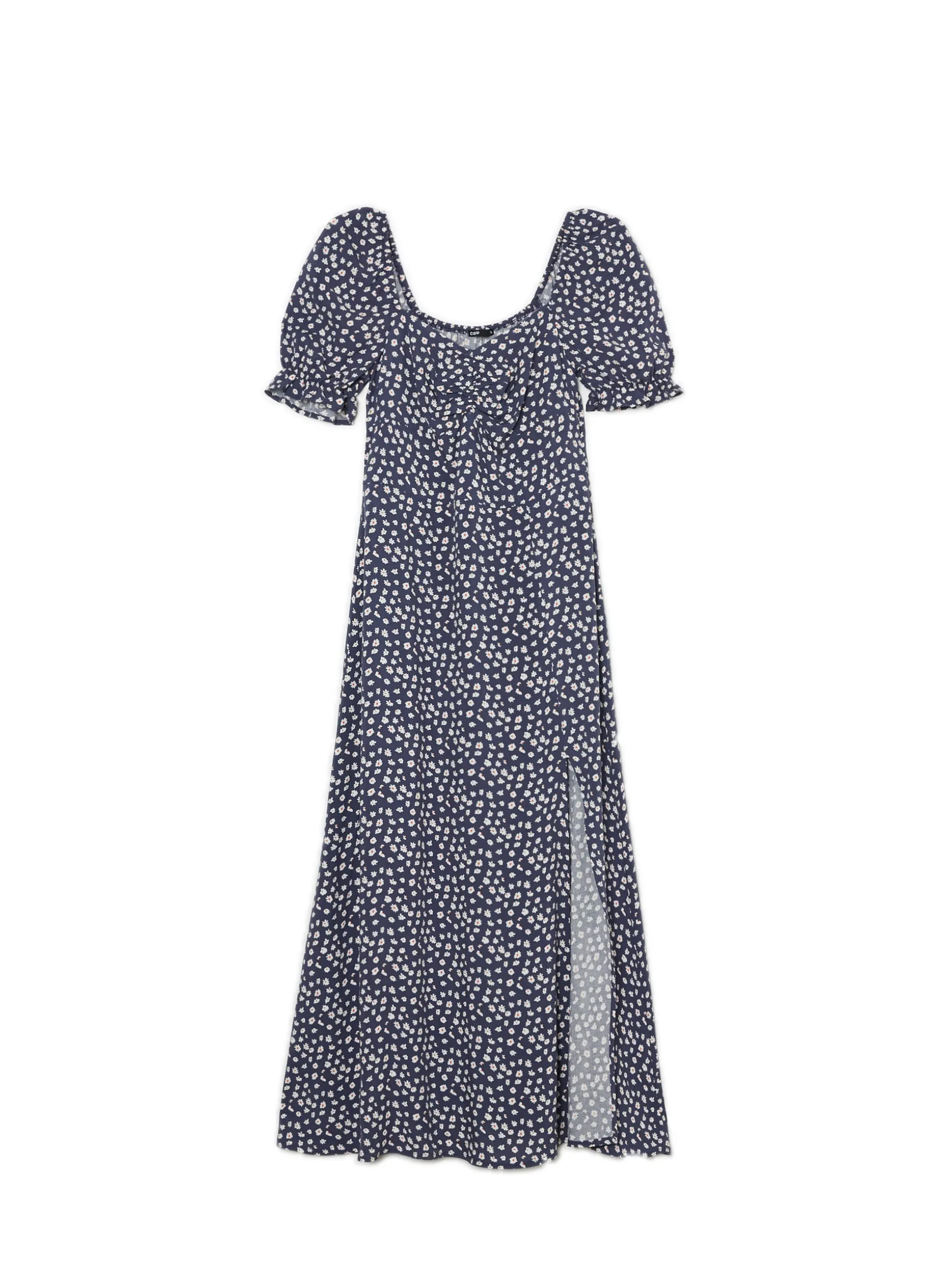 Delikatna damska granatowa sukienka z kwiatowym wzorem, idealna na letnie dni. 100% wiskozy długość midi rozcięcie z boku dekoracyjne marszczenie pod biustem krótkie, bufiaste rękawy zakończone gumką Wzrost modelki: 170 cm