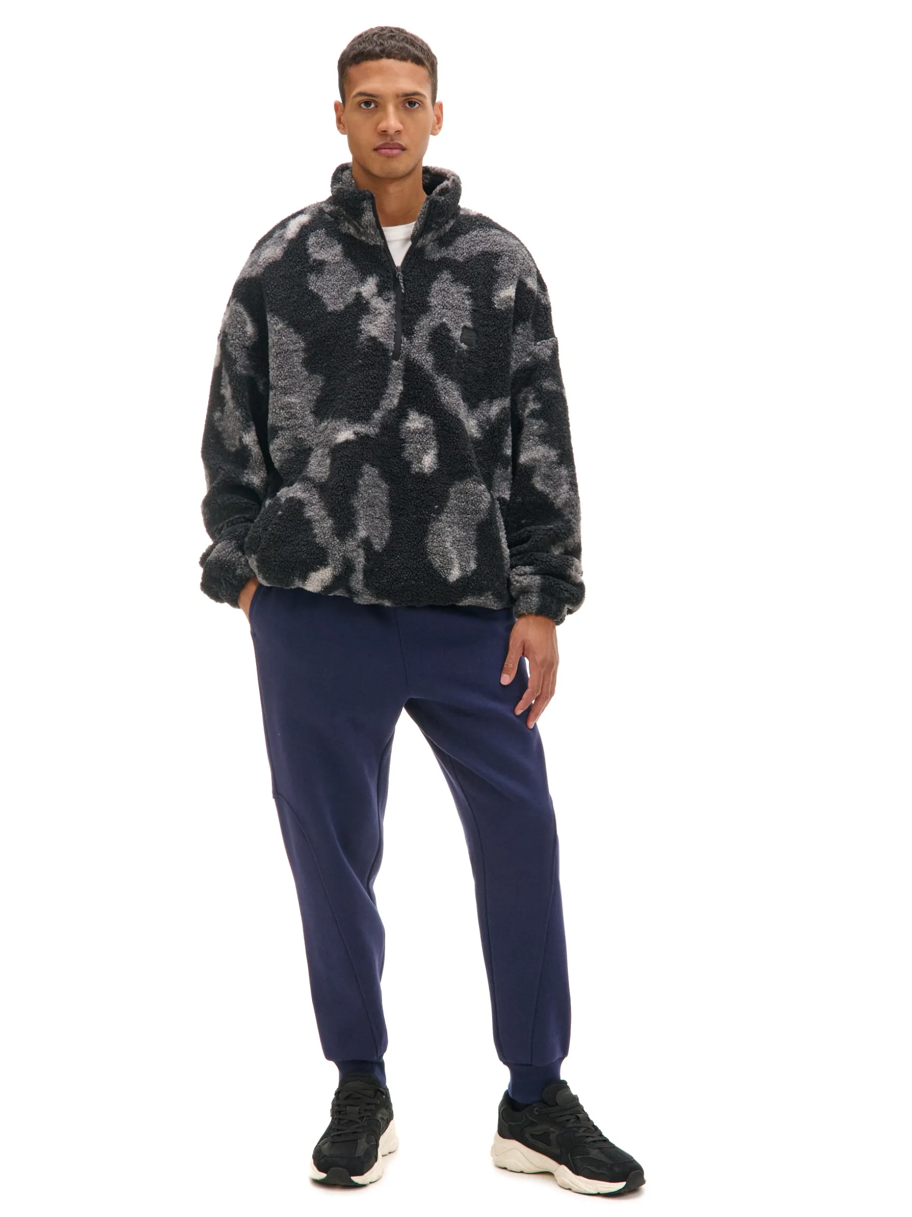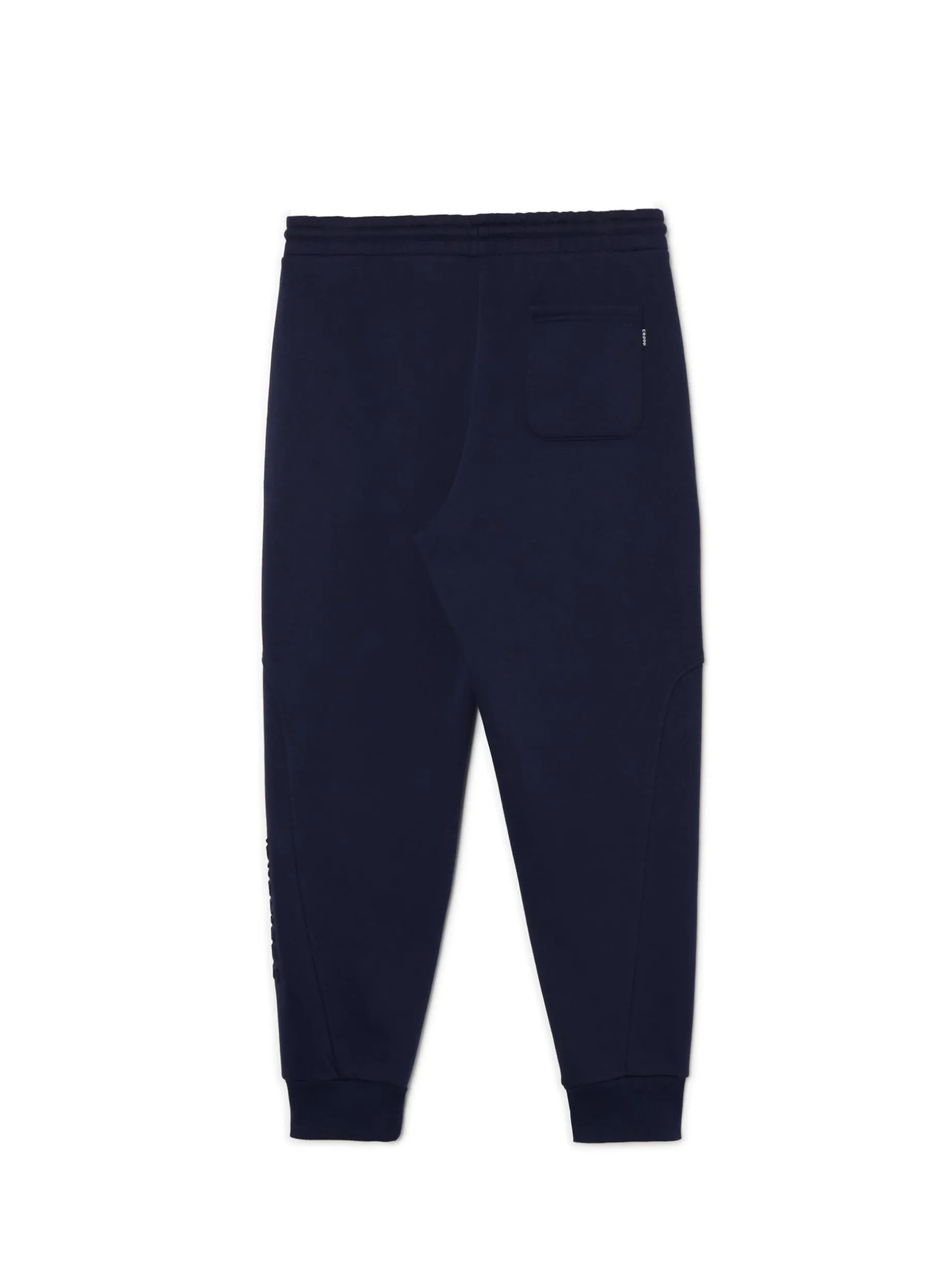 Granatowe męskie dresy z wyjątkowym nadrukiem na nogawce techniką emboss. Materiał jest miękki w dotyku i delikatnie wypukły, przez co wpisuje się zarówno w sportowy, jak i casualowy styl. dzianinowy materiał z bawełną dresowe joggery o kroju regular guma w pasie ze sznurkiem do regulacji otwarte kieszenie po bokach naszywana kieszeń z tyłu nadruk na nogawce z wykorzystaniem techniki emboss naszywka Cropp