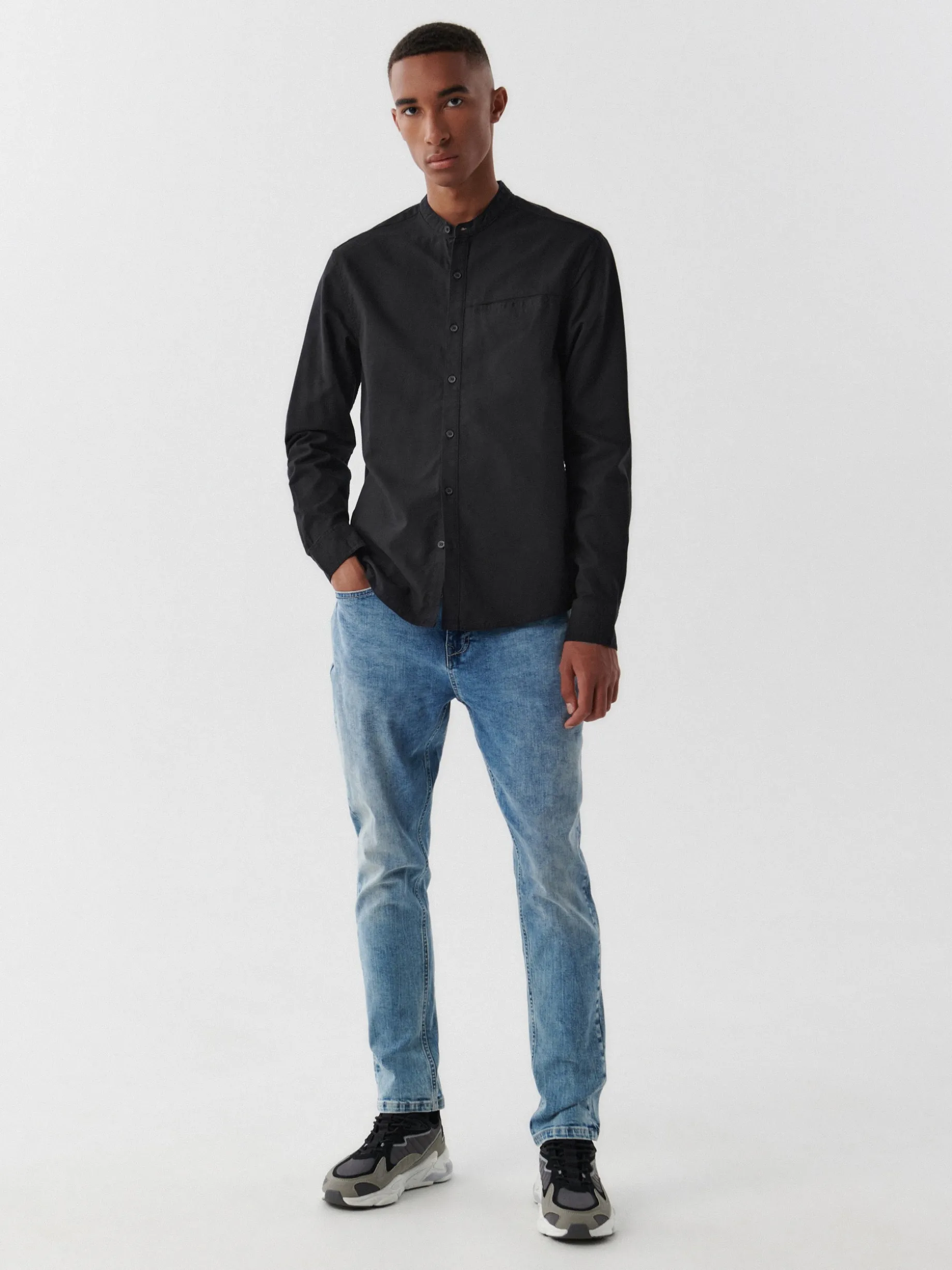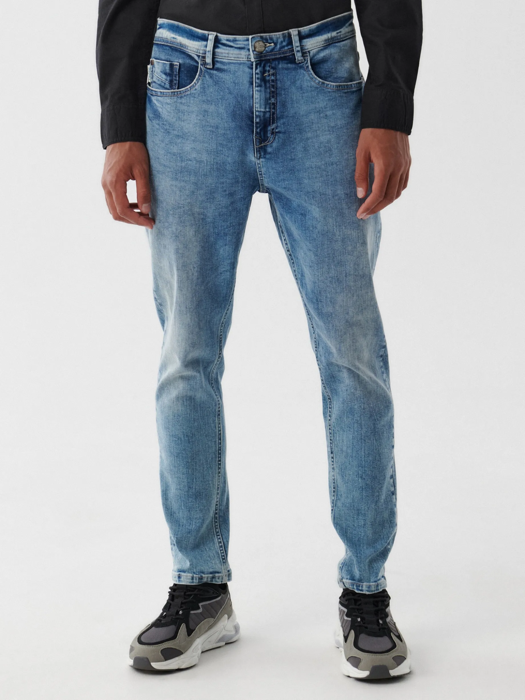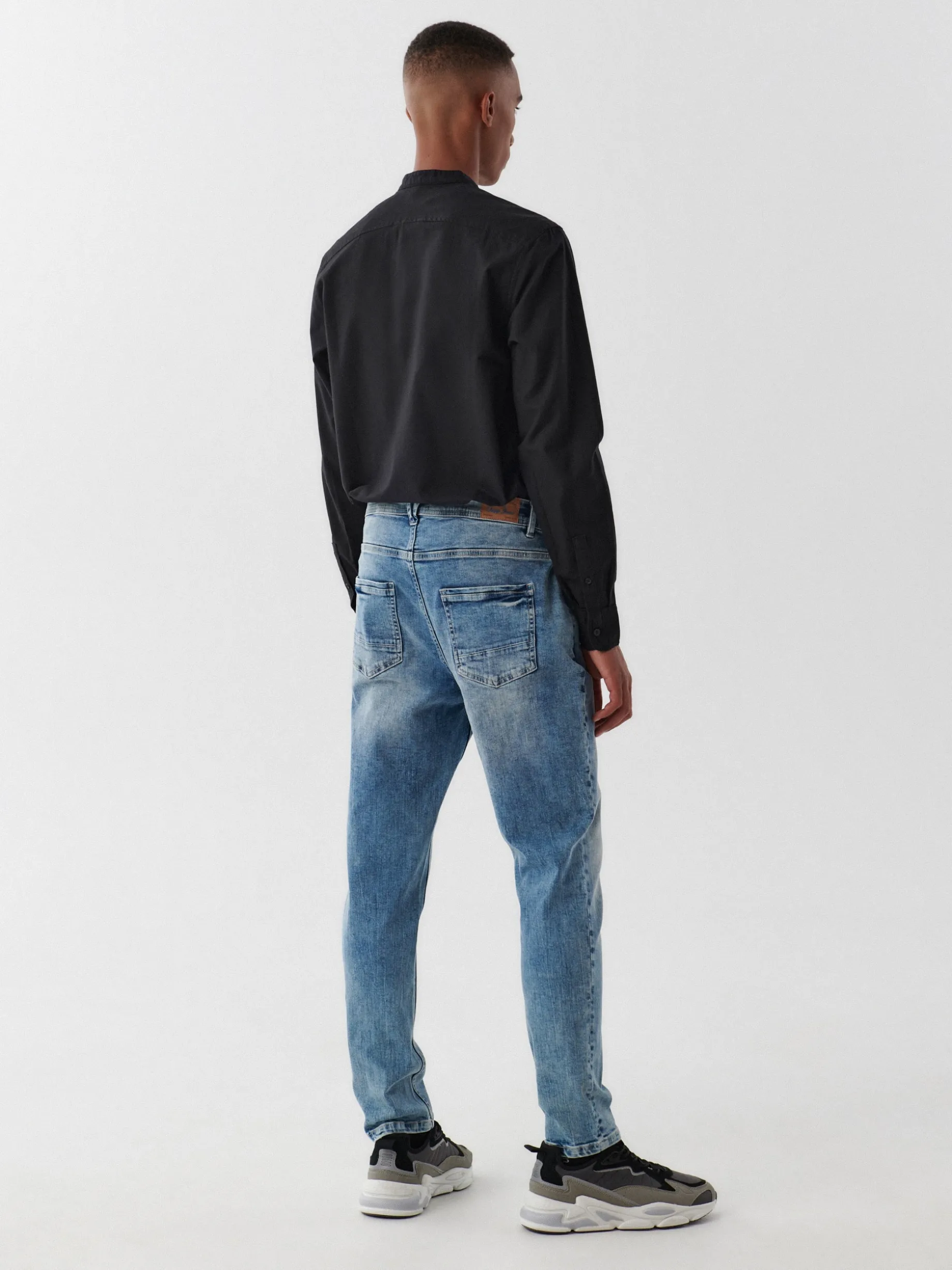 Męskie jeansy, uszyte z tkaniny o bardzo wysokiej zawartości bawełny z niewielką domieszką włókien elastycznych. regularny stan zapięcie na zamek i guzik długa, zwężająca się nogawka cztery kieszenie efekt sprania szerokie szlufki na pasek dostępne w innych kolorach Wzrost modela: 185 cm