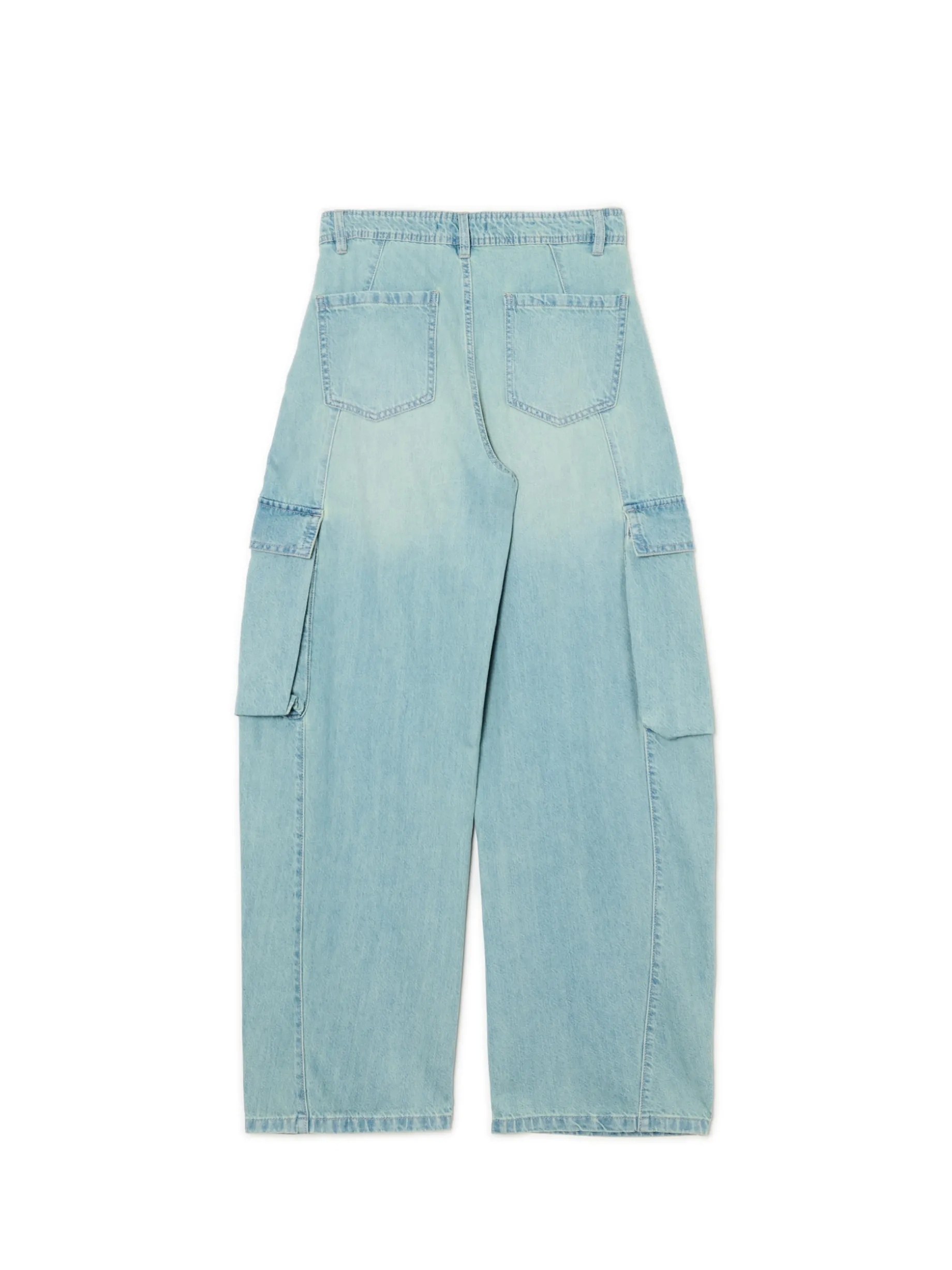 Damskie denimowe spodnie o unikatowym kroju. Wyposażone w wygodne zapięcie, praktyczne kieszenie i delikatny efekt sprania. Idealne na spontany! 100% bawełny długie, szerokie nogawki zapięcie na zamek i guzik szerokie szlufki na pasek 6 kieszeni, w tym kieszenie cargo delikatny efekt sprania Wzrost modelki: 177 cm