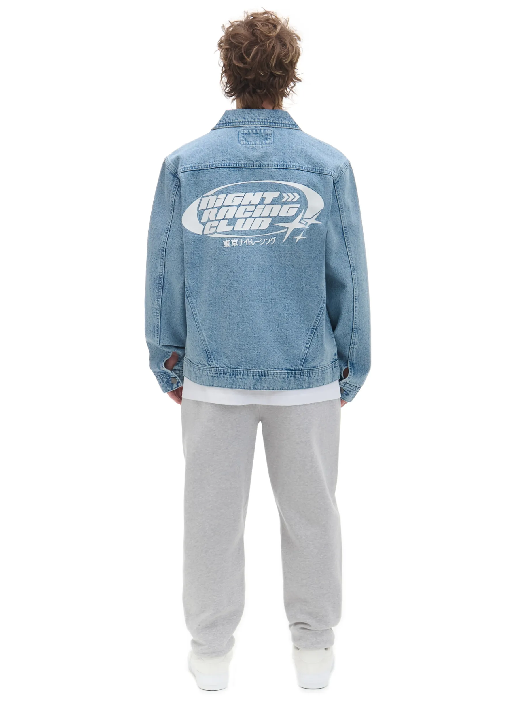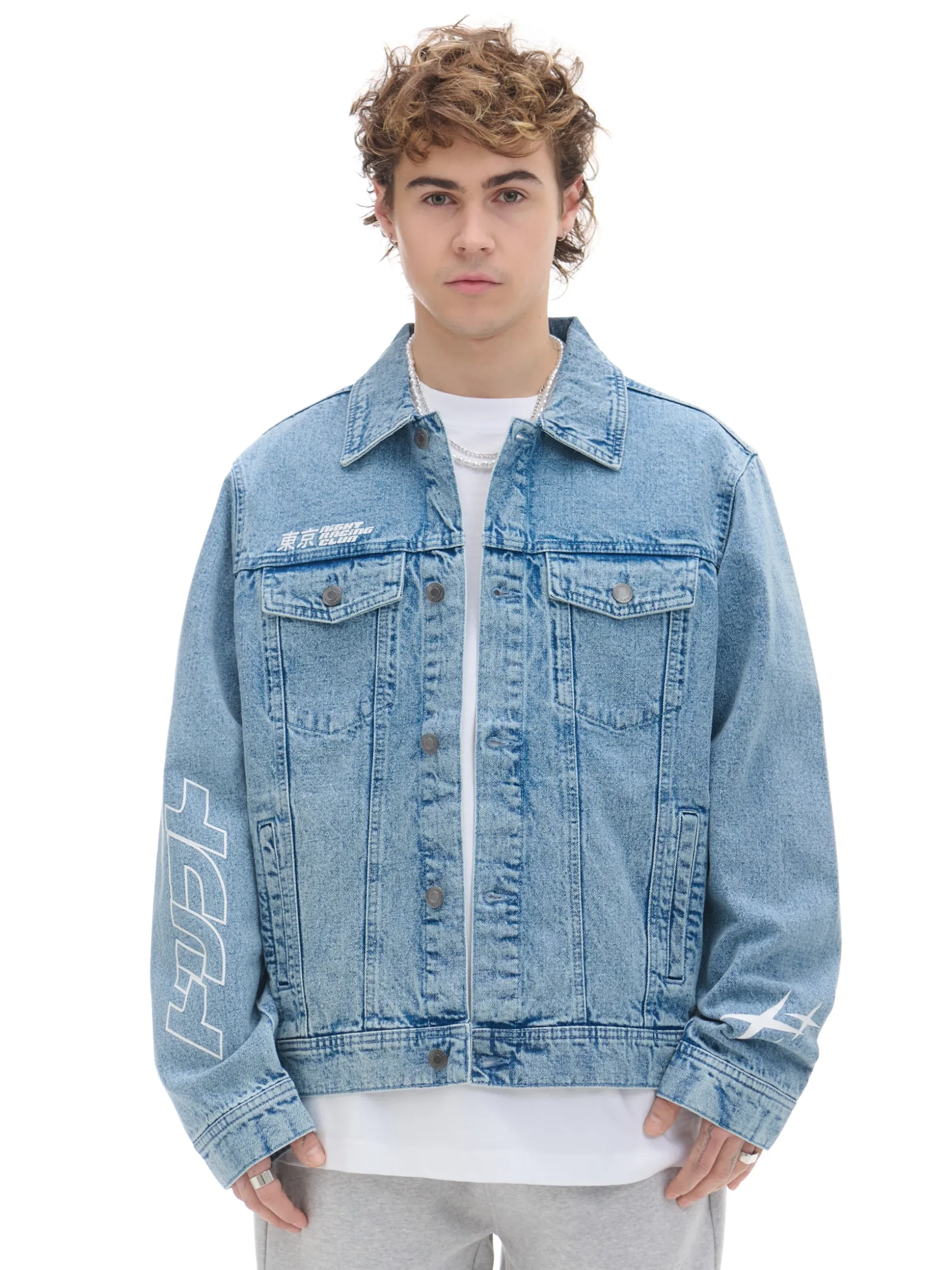 Męska jeansowa kurtka w klasycznym odcieniu denimu i oryginalnymi nadrukami szuka właściciela. uszyta w 100% z bawełny swobodny krój kurtka i mankiety zapinane na guziki 4 kieszenie – para z przodu zapinana na guziki i druga po bokach asymetryczne nadruki z przodu, na plecach i rękawach
