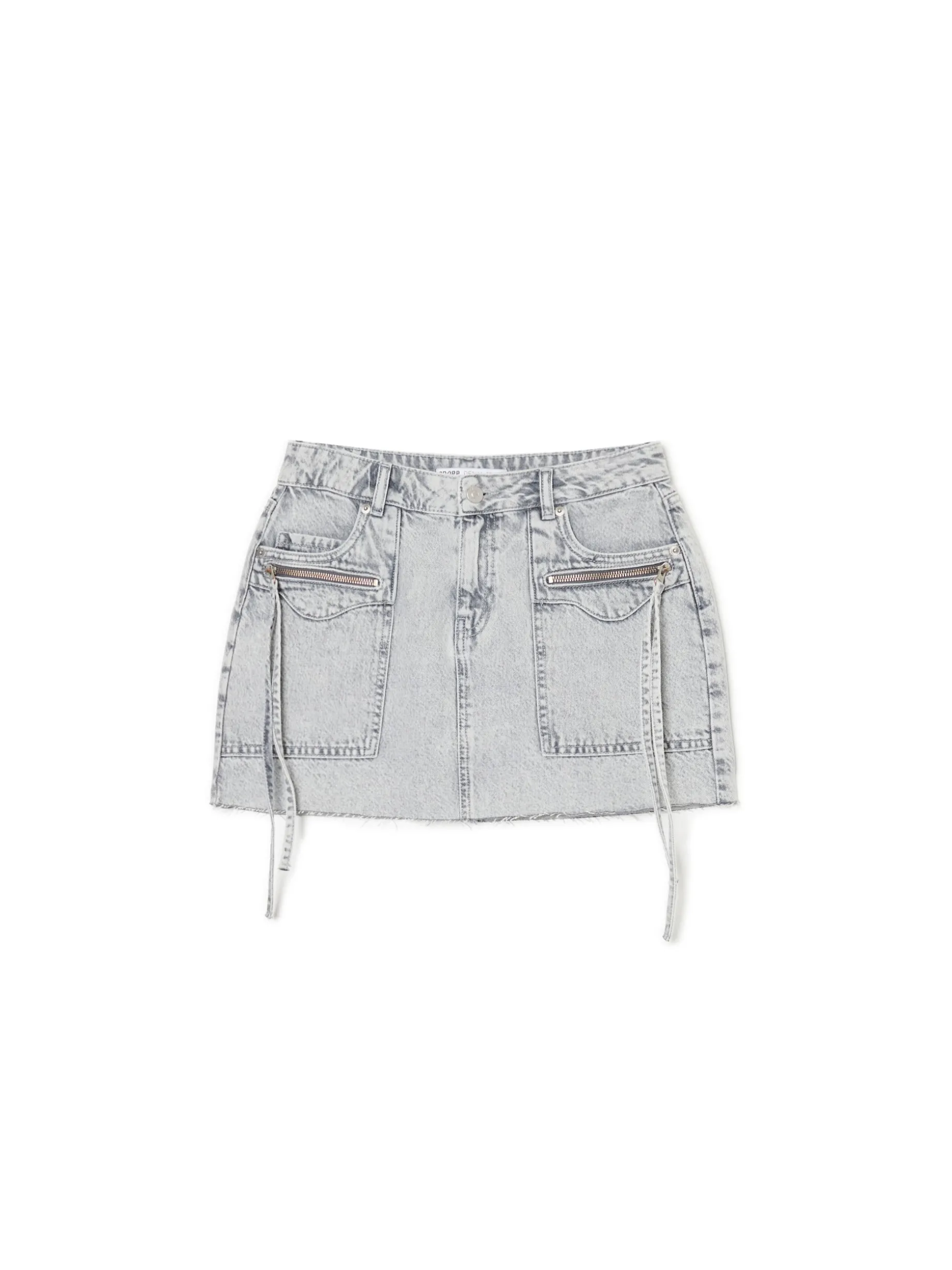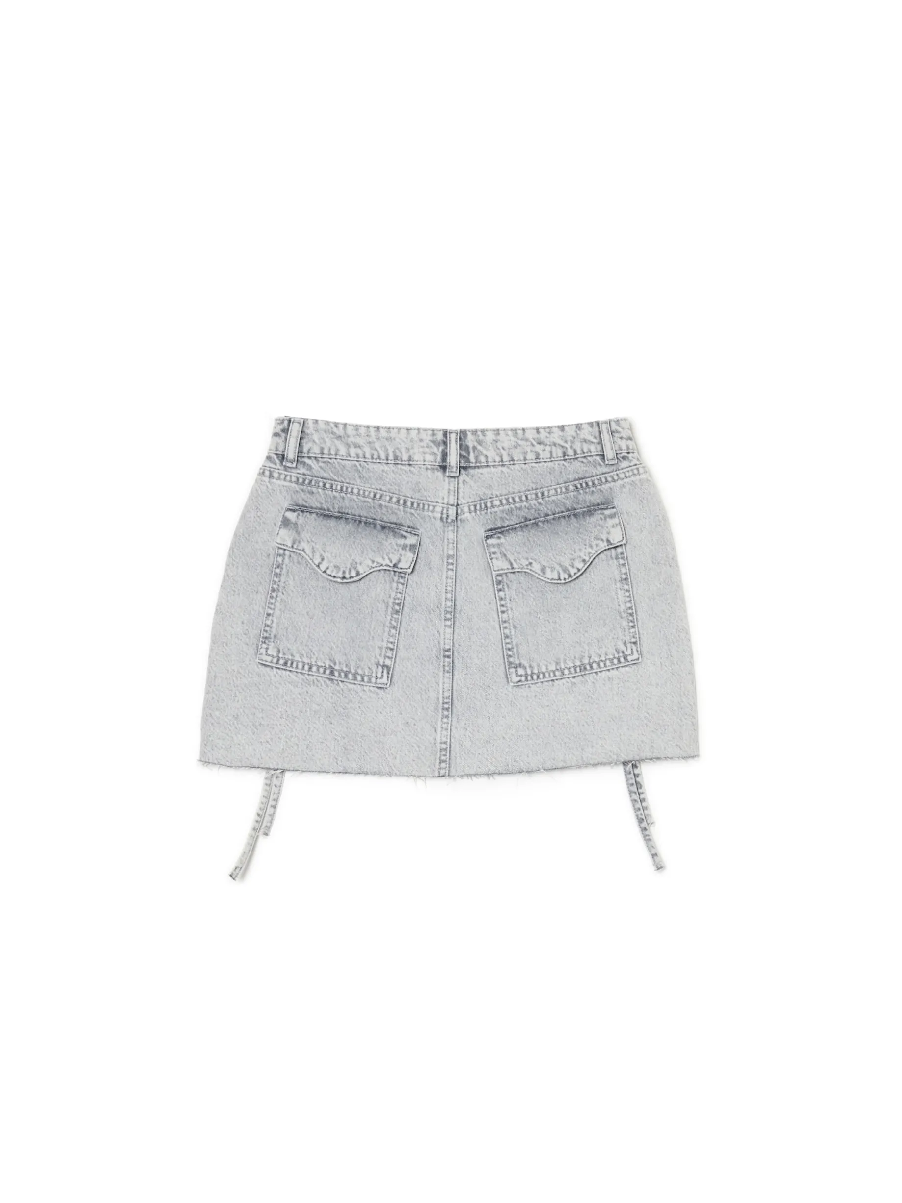 Damska spódnica o długości mini, uszyta z bawełny. Ozdobą tego modelu są frędzle z tego samego materiału przy kieszeniach. denim o szarym odcieniu z delikatnym efektem sprania długość mini zapięcie na zamek i guzik cztery funkcyjne kieszenie, w tym dwie z zapięciem na zamek dwie naszyte kieszenie tylnie surowe wykończenie brzegów ozdobne frędzle przy zamkach Wzrost modelki: 172 cm