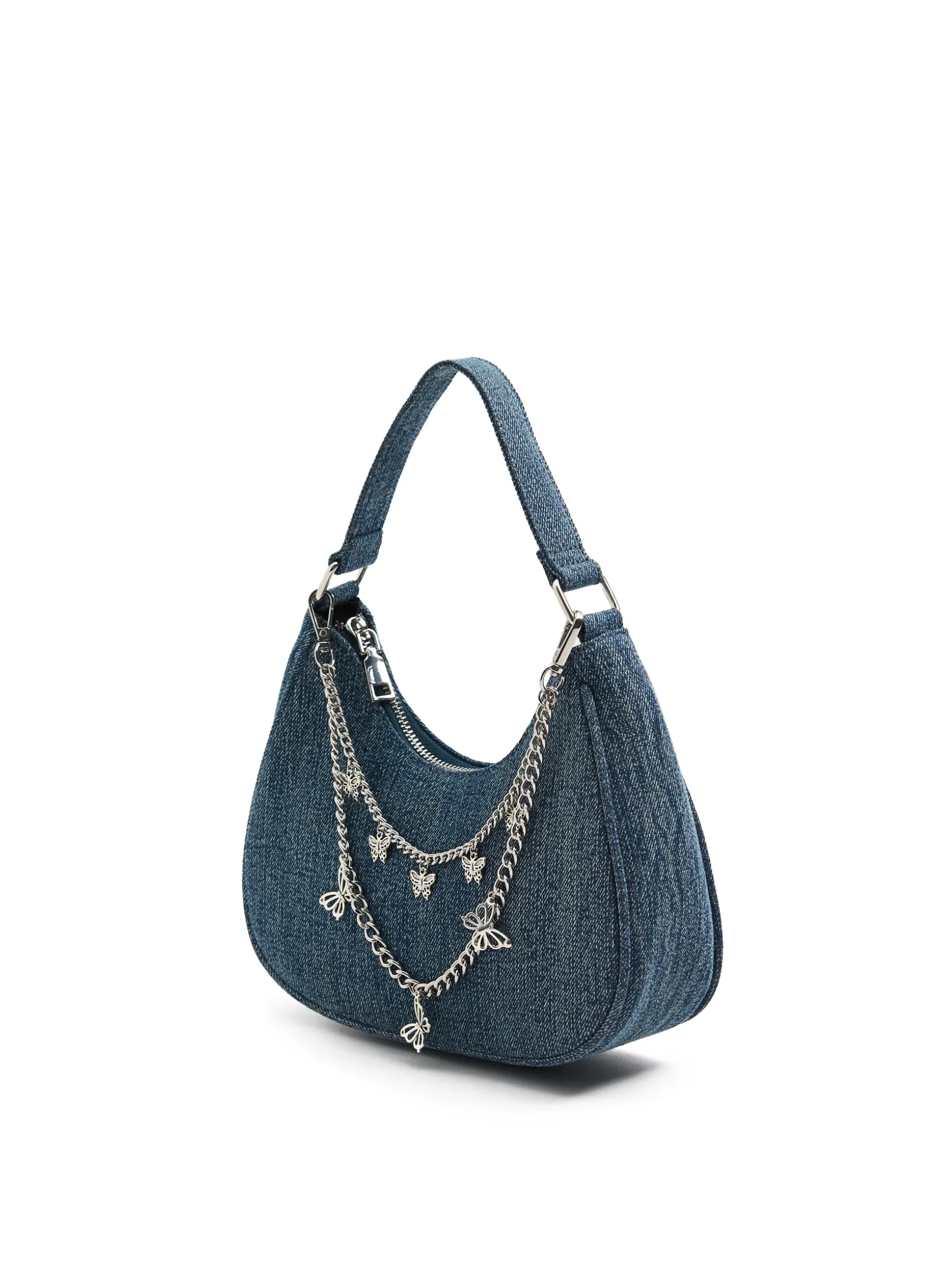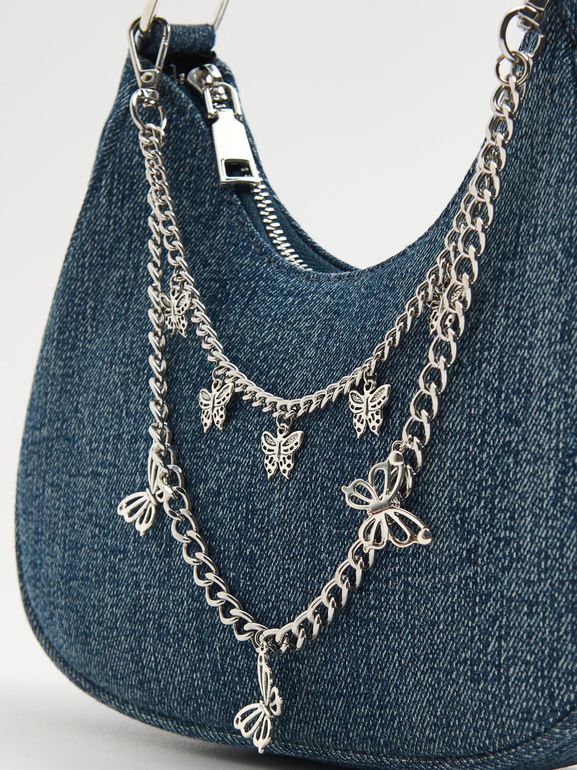 Niewielka damska torebka na ramię, uszyta z grantowego materiału imitującego jeans. Idealna dla fanek Y2K! krótki pasek na ramię zapięcie na suwak w środku dodatkowa kieszonka, zapinana na suwak podwójny odczepiany łańcuch z zawieszkami w kształcie motylków Wymiary produktu: 20 x 25 cm