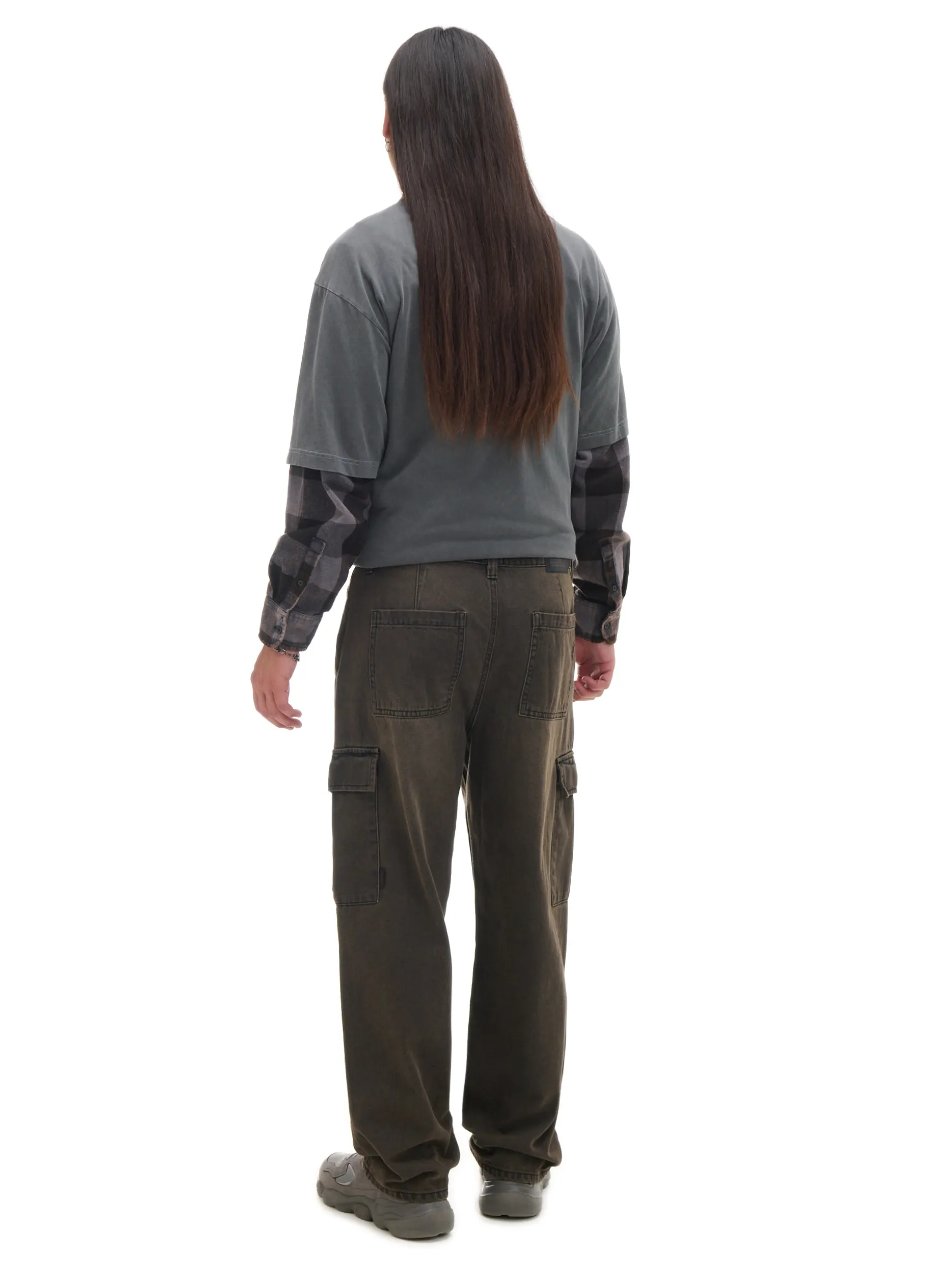 Męskie spodnie jeansowe o kroju baggy, uszyte z bawełnianej tkaniny. luźny fason o szerokiej nogawce obniżony krok efekt sprania materiału zapięcie na zamek i guzik sześć kieszeni, w tym dwie typu cargo z patkami szlufki na pasek