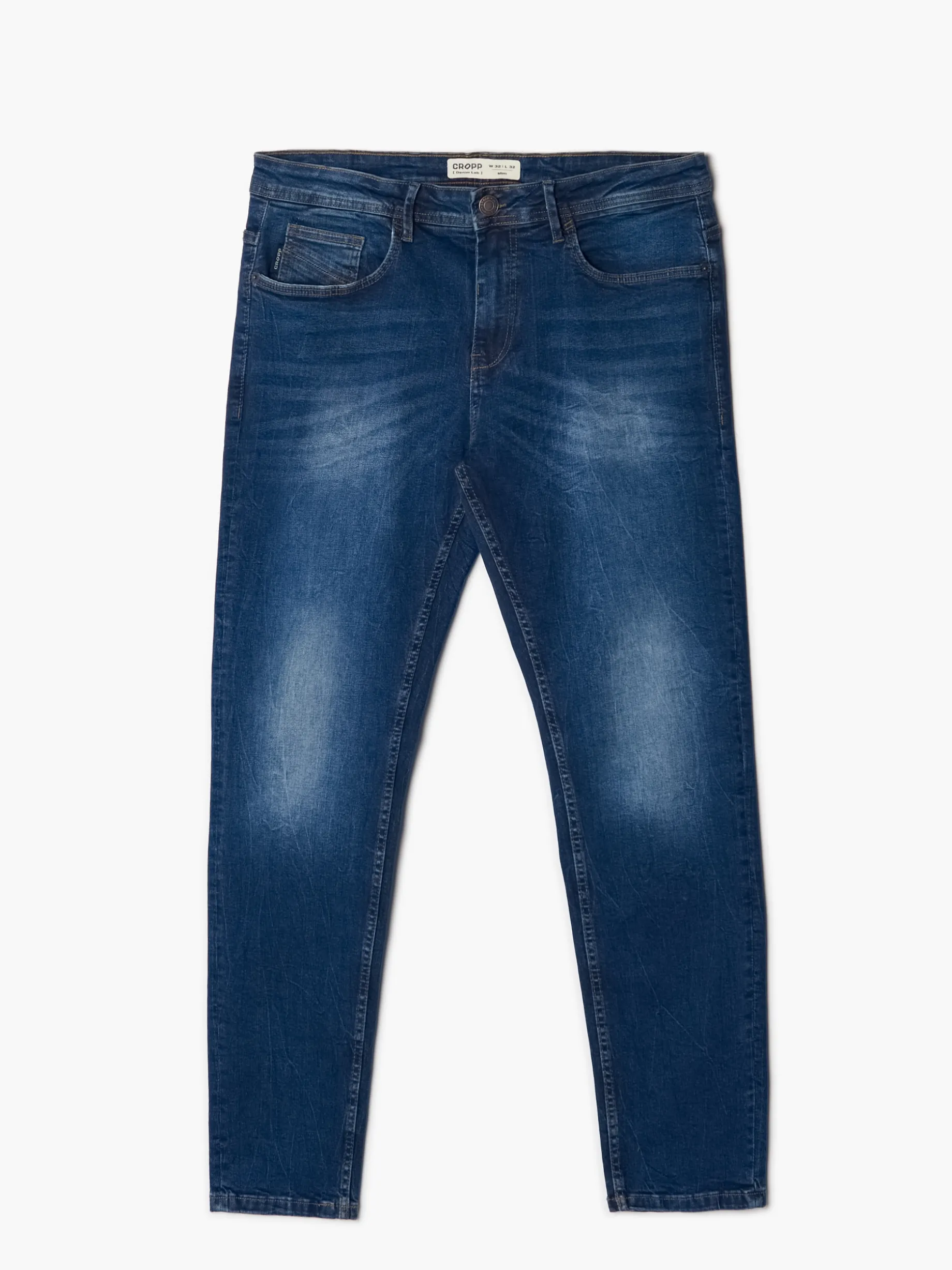 Męskie jeansy o kroju slim fit, uszyte z recyklingowanej bawełny z dodatkiem elastanu. dopasowany fason zapięcie na zamek i guzik wąska nogawka efekt sprania dostępne inne warianty kolorystyczne Rozmiar ubrania: 32/32 Wzrost modela: 186 cm