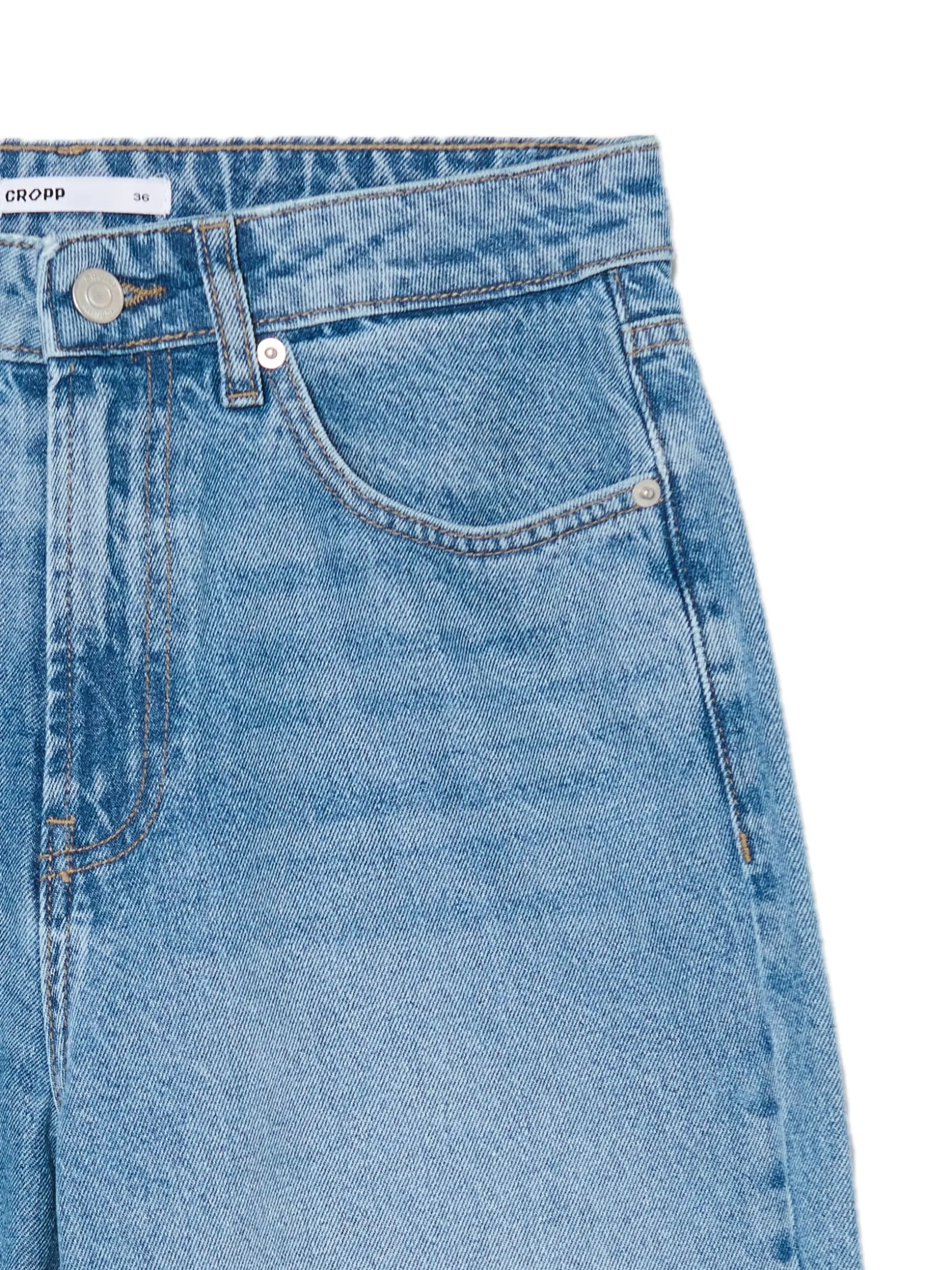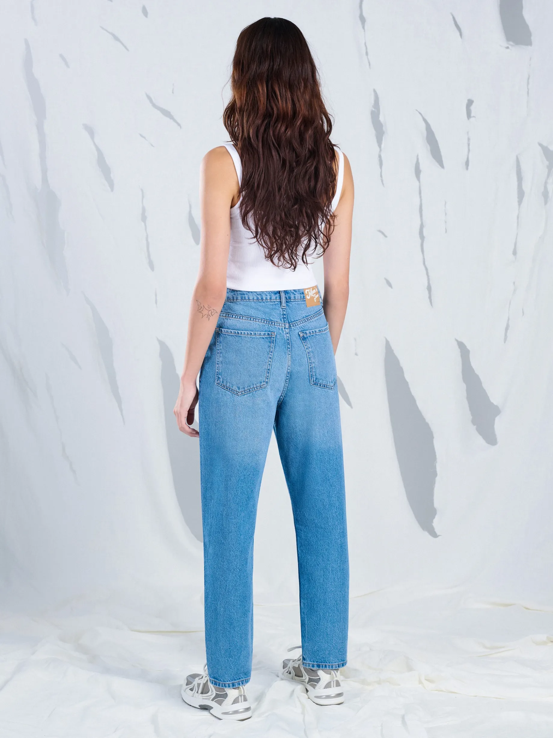 Damskie spodnie jeansowe o kroju mom, uszyte z bawełnianej tkaniny. Klasyk, który warto mieć w swojej szafie! 100% bawełny fason typu mom zapięcie na zamek i guzik pięć kieszeni szlufki na pasek blisko siebie