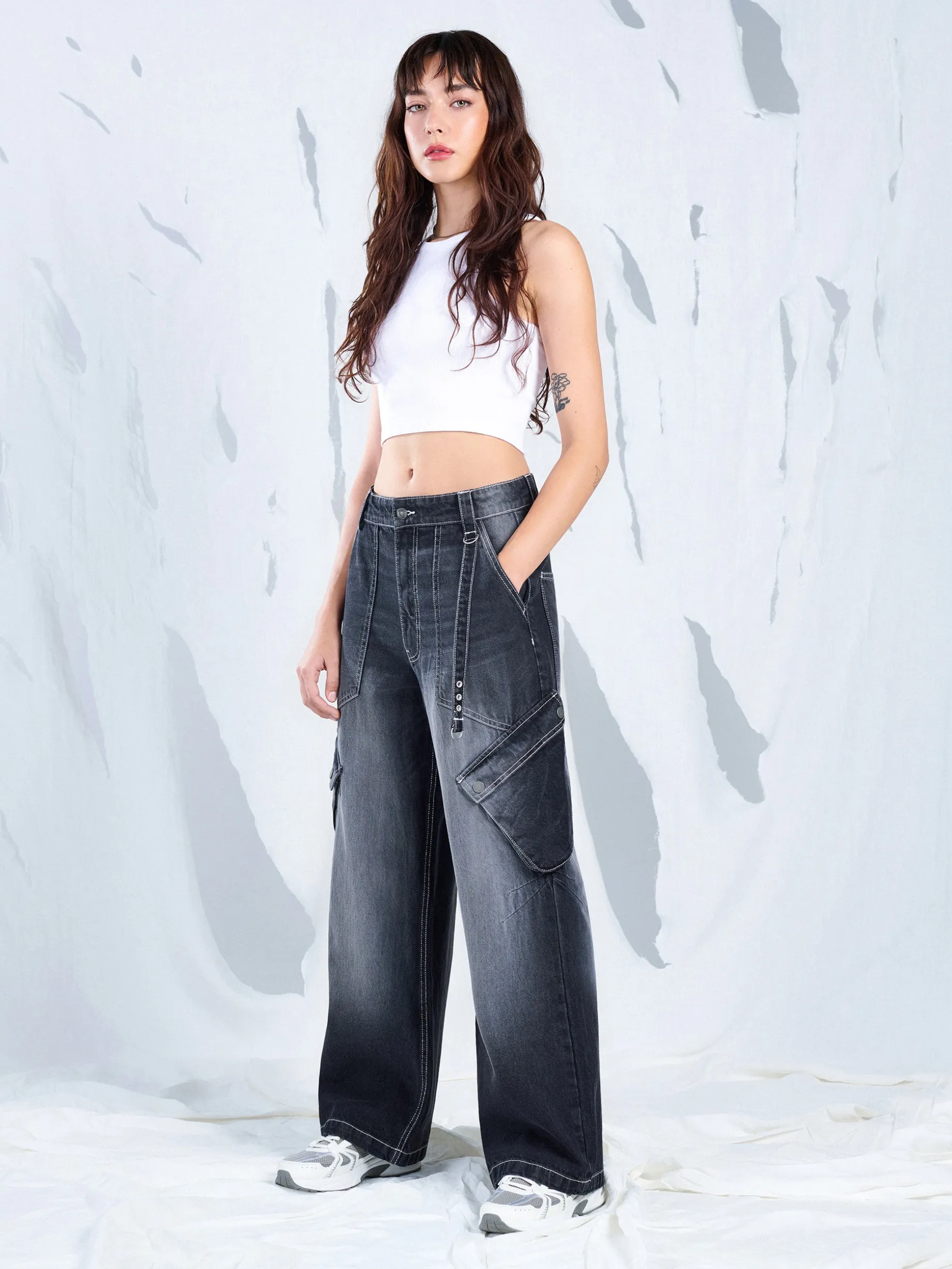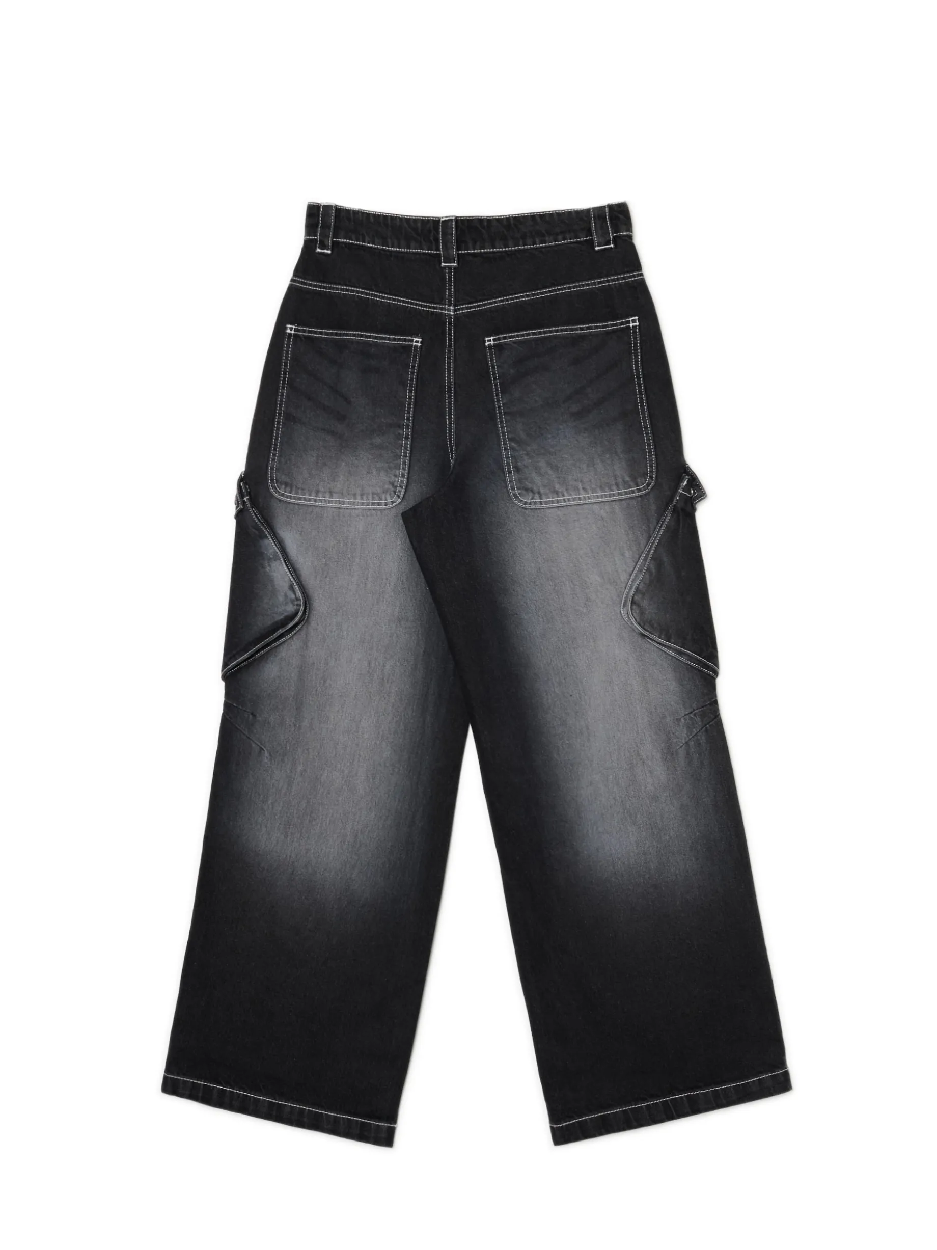 Damskie spodnie jeansowe o kroju super baggy, uszyte z bawełnianej tkaniny. Jeansy w kolorze czarnym to must-have w gardeobie każdej kobiety! 100% bawełny zapięcie na zamek i guzik długie, szerokie nogawki skośne kieszenie z przodu naszywane kieszenie z tyłu dwie kieszenie z patkami i zapięciem na zatrzaski kontrastowe przeszycia efekt sprania szerokie szlufki na pasek ozdobny pasek z metalowym wykończeniem