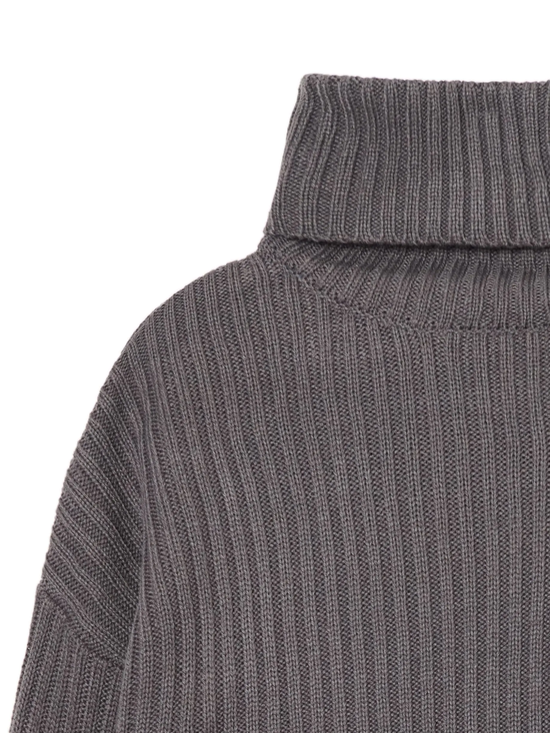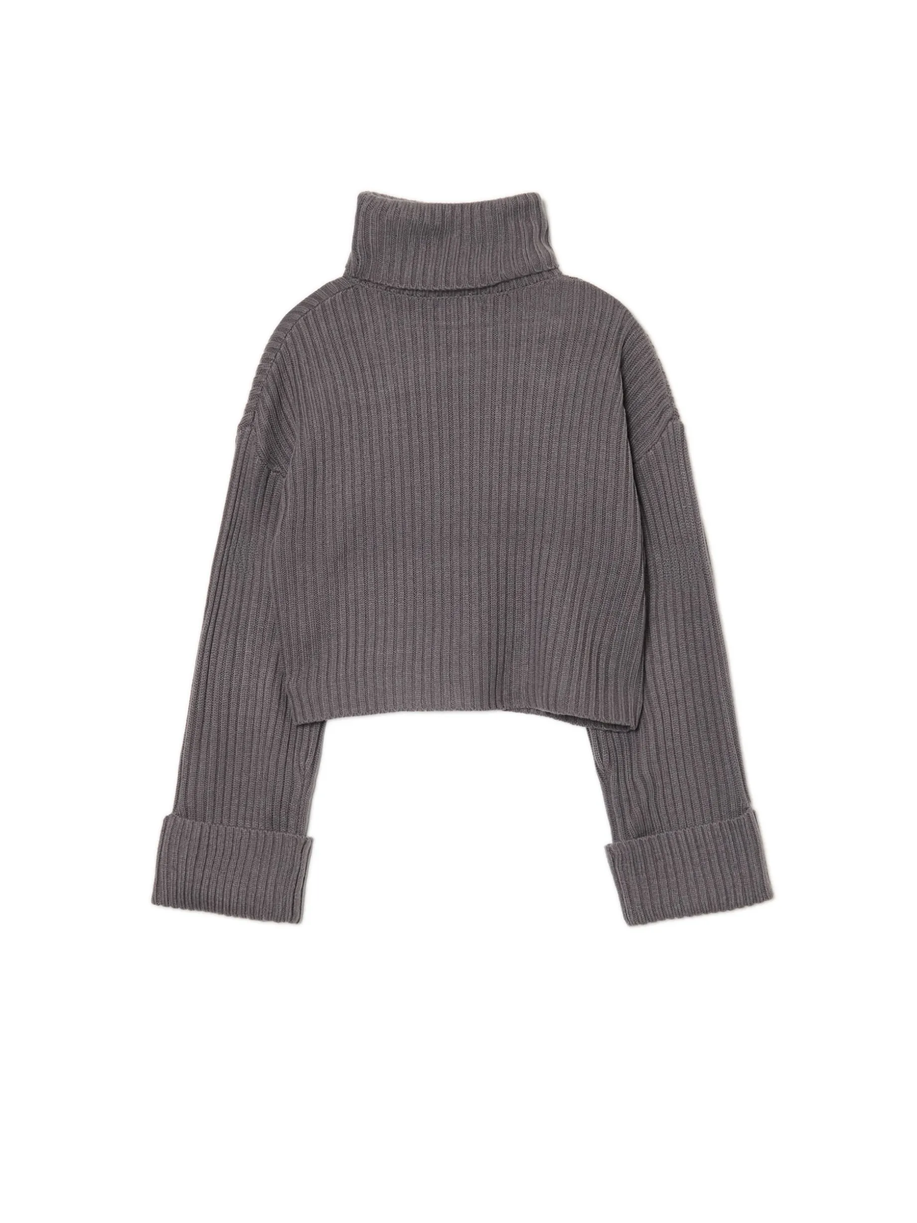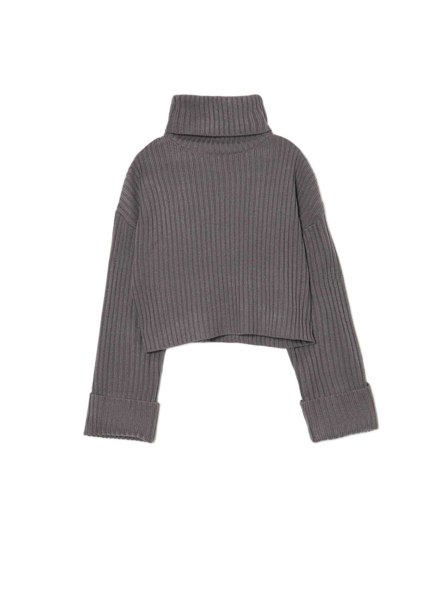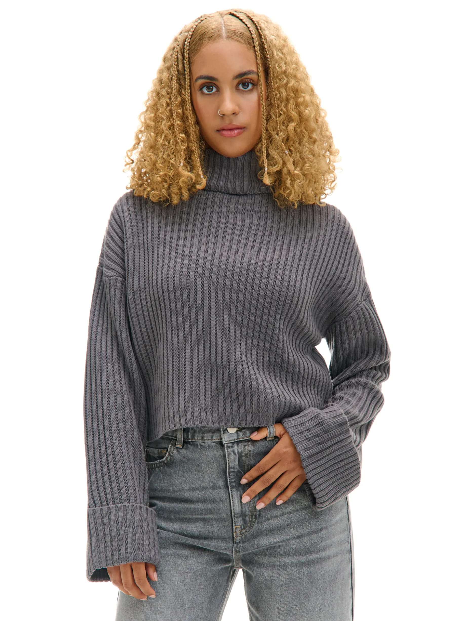 Stylowy cozy sweter idealny na jesienne spacery z bestie. Prążkowany solidny materiał, wygodny golf i oryginalnie podwinięte mankiety przy rękawach. Must have tego sezonu! dzianinowy sweter o kroju oversize prążkowany materiał oversizowy krój krótki fason zabudowany dekolt z golfem długie, swobodne rękawy z podwiniętym mankietem delikatnie obniżona linia ramion
