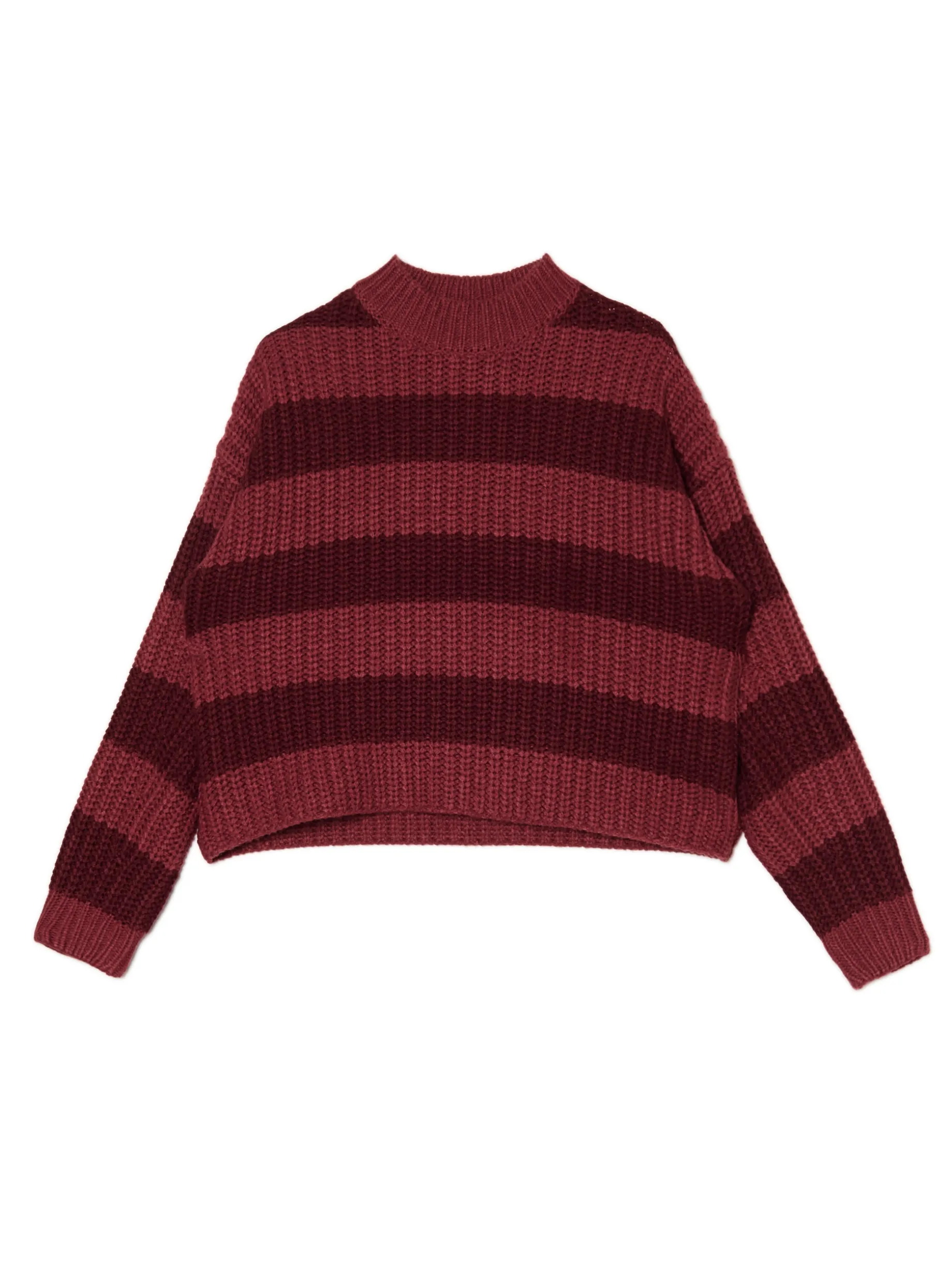 Damski sweter o regularnym kroju, uszyty z dzianiny. Zabudowany dekolt ze ściągaczem. Na całości wzór w paski.