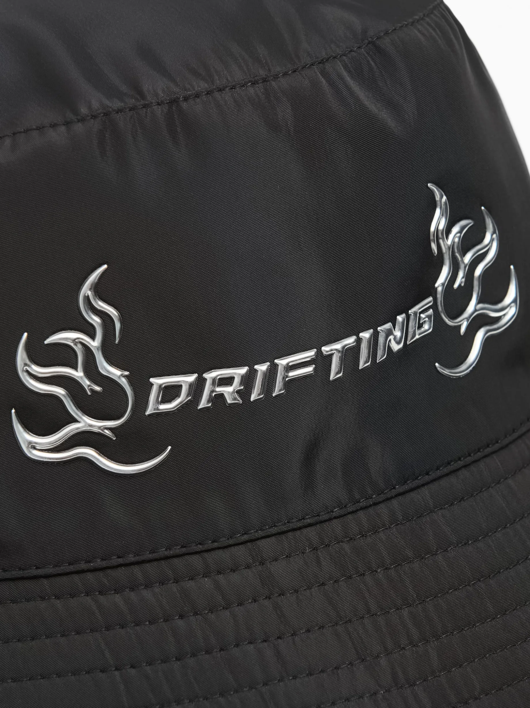 Czarny damski kapelusz typu bucket hat, uszyty z gładkiej tkaniny. Z przodu wypukła, srebrna metaliczna naszywka.