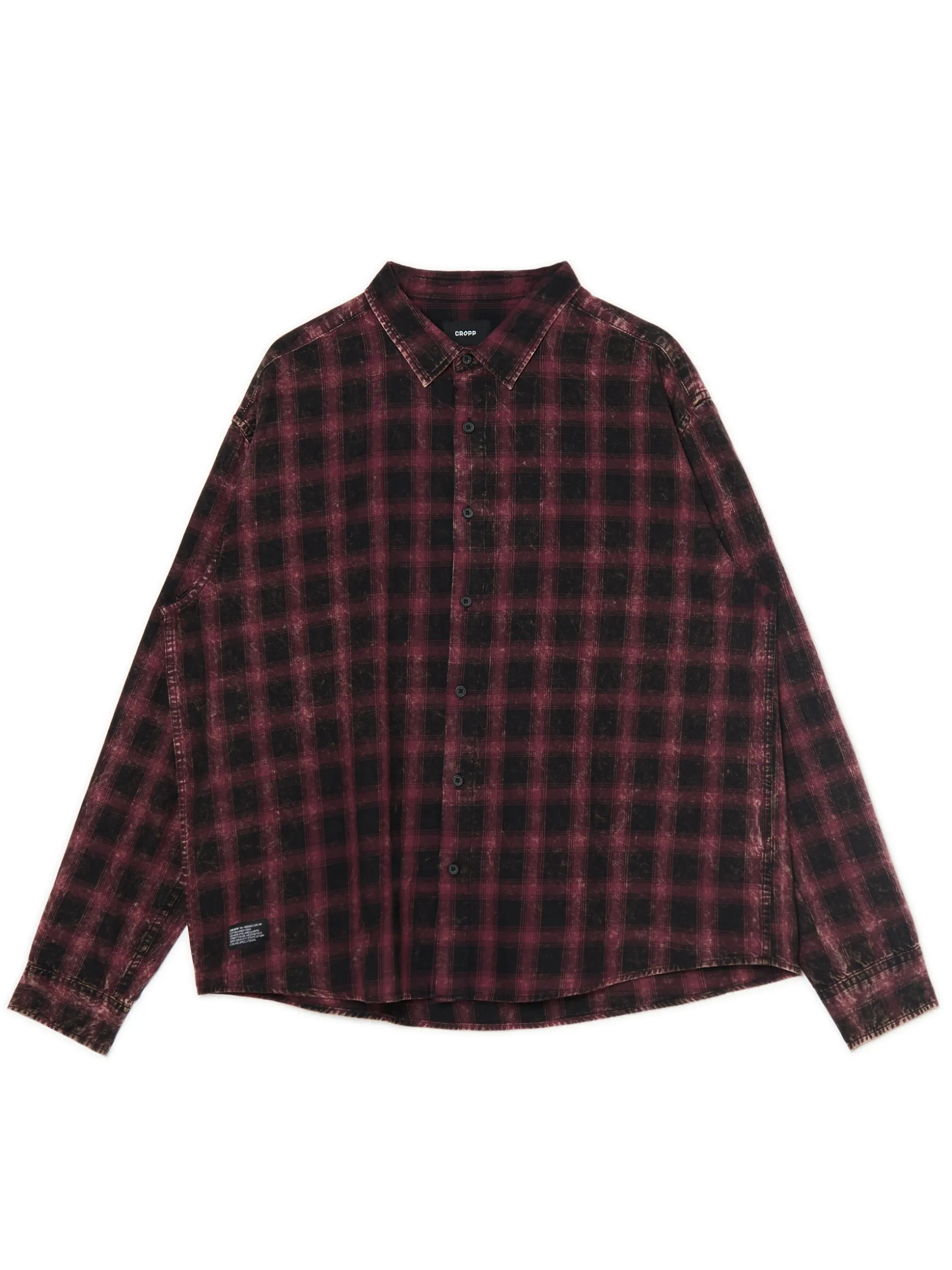 Luźna męska koszula z wykończeniem imitującym zniszczenie i przebarwienia, uszyta w 100% z bawełny. fason oversize zapięcie na guziki klasyczny kołnierzyk długie rękawy, zakończone mankietem z guzikiem efekt sprania wzór w kratę