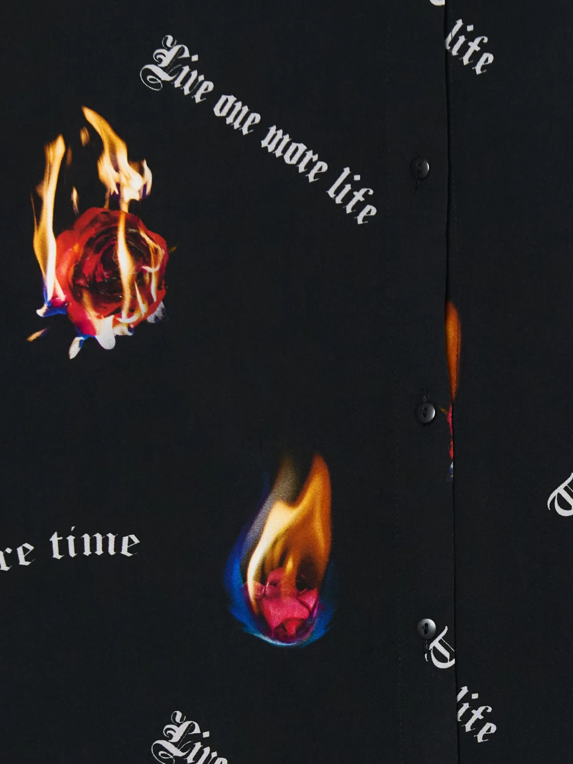 Damska koszula uszyta w 100% z wiskozy w typie shacket (shirt & jacket). Ozdobę stanowi nadruk z płonącymi różami i motywacyjnymi sentencjami.