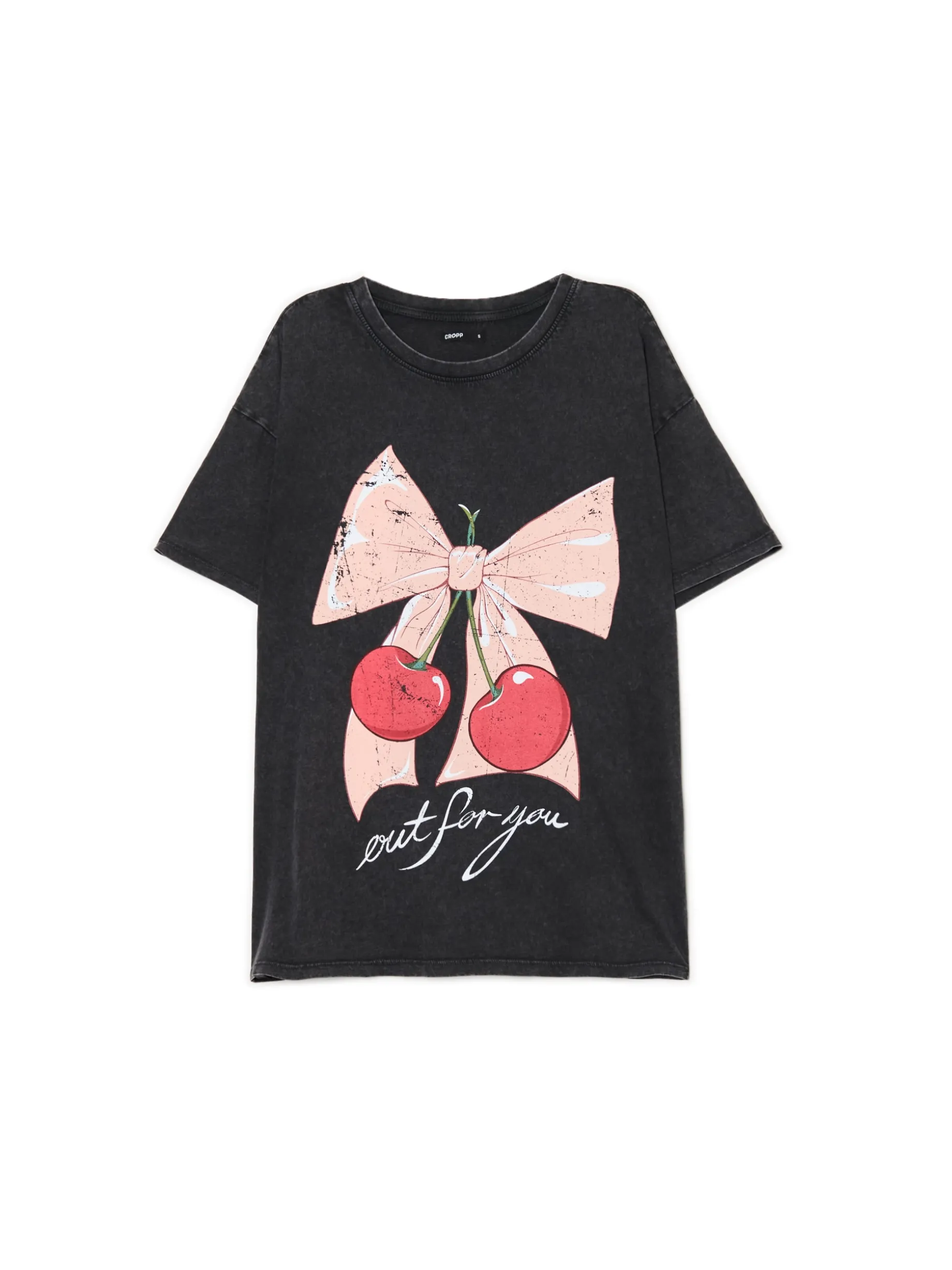 Damski T-shirt uszyty z bawełnianego materiału w kolorze czarnym z efektem sprania i dużym nadrukiem z przodu. Wrzuć wisienkę do koszyka! 100% bawełny krój oversize krótkie, swobodne rękawy oryginalny print