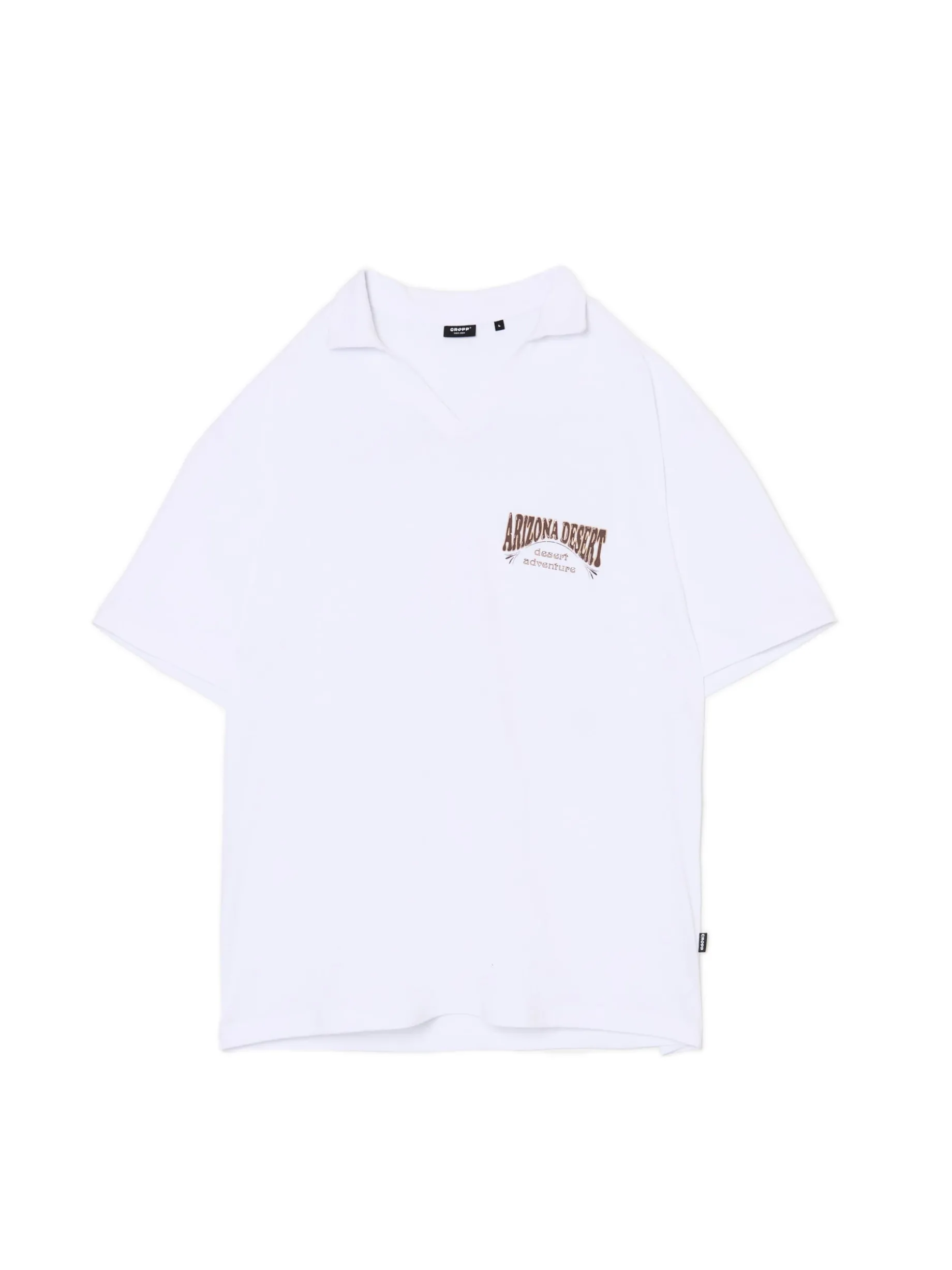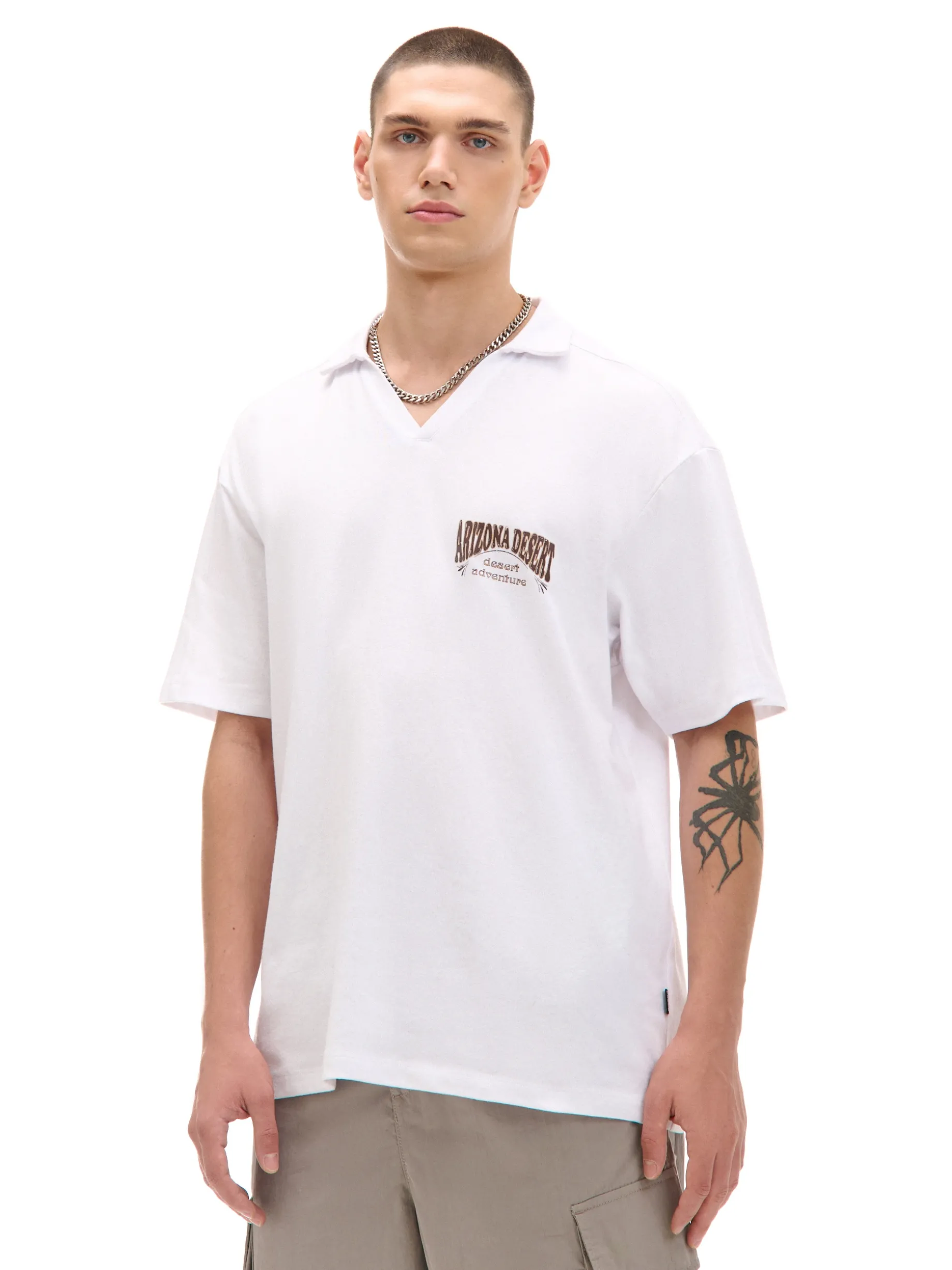 T-shirt męski typu polo uszyty z bawełnianej dzianiny w kolorze białym. Po obu stronach kolorowe nadruki nawiązujące do pustynnych obszarów Arizony. 100% bawełny wygodny krój comfort klasyczny kołnierzyk polo krótkie, ścięte rękawy delikatnie obniżona linia ramion mały nadruk na piersi, duży nadruk na plecach