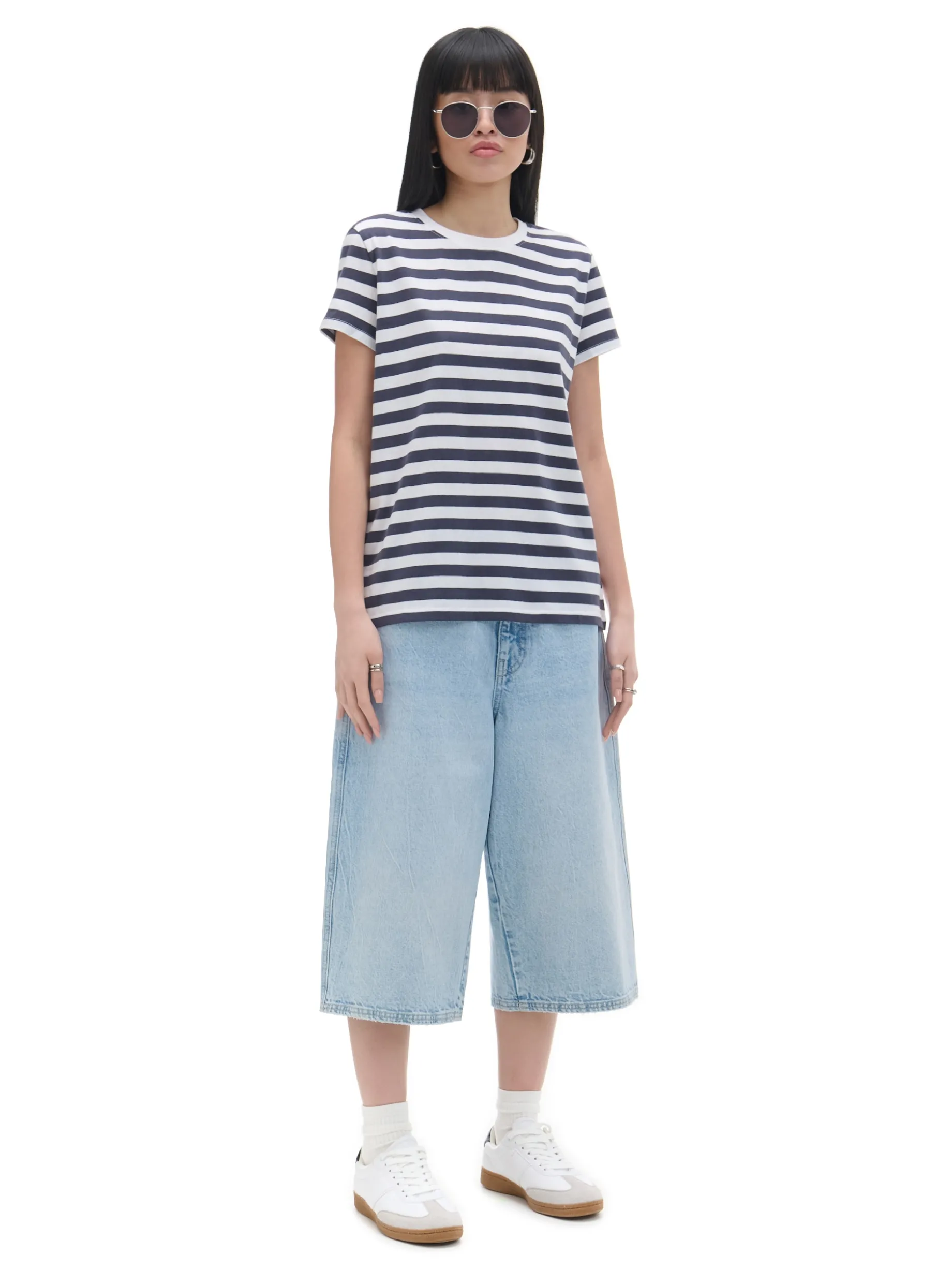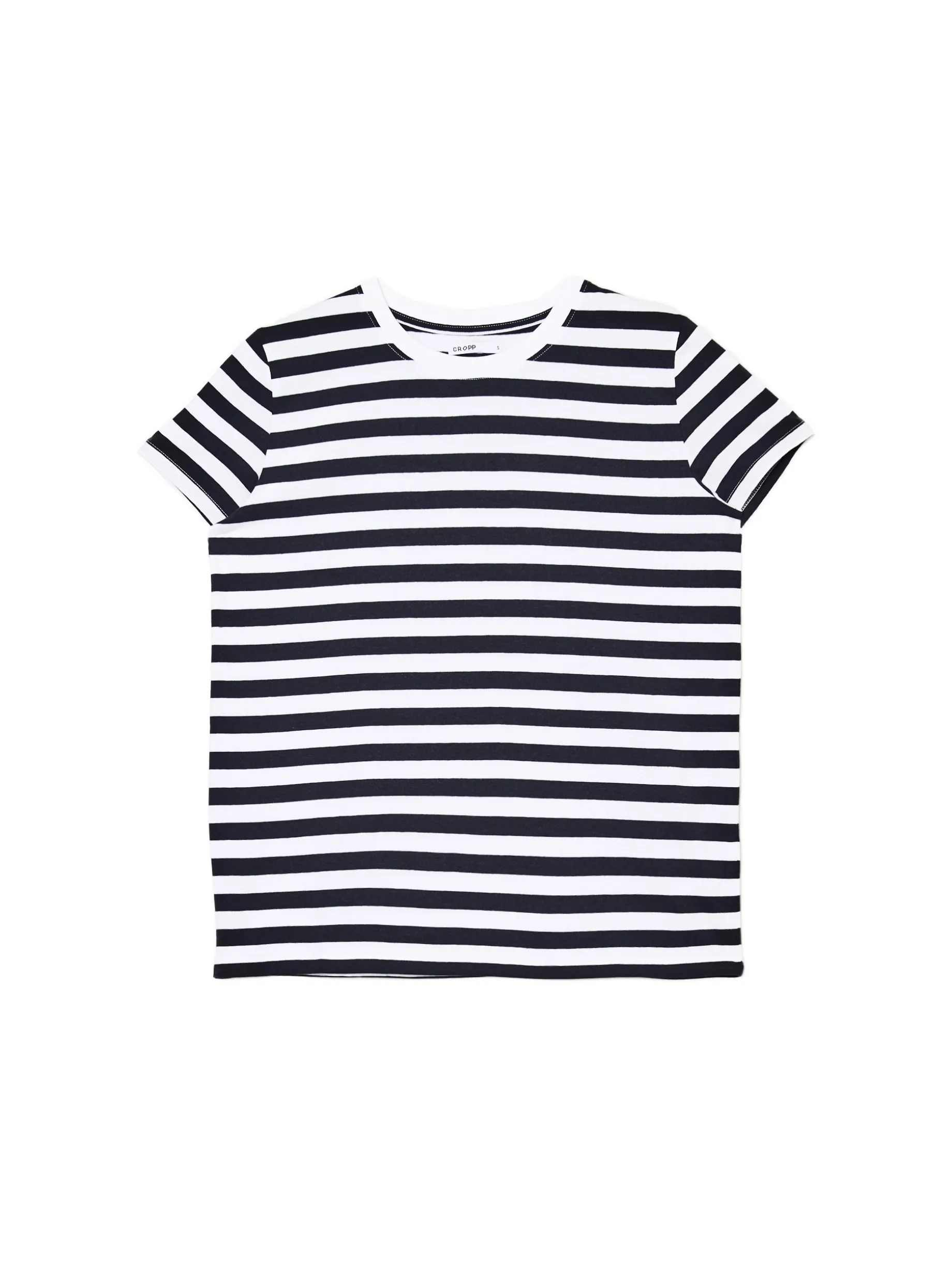 Damska koszulka o regularnym kroju, uszyta w 100% z bawełny. Na całości wzór w poziome czarno-białe paski. Wzrost modelki: 168 cm