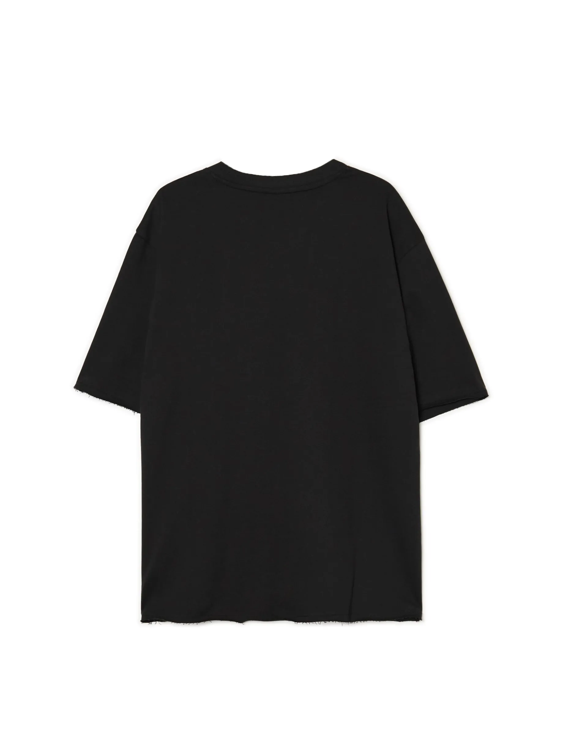 Czarny bawełniany męski T-shirt z krótkim rękawem, idealny jako dodatek do stylizacji na zabawę Halloweenową. Nada się też podczas rozdawania cukierków lub psikusów. Buaaa! 100% bawełny wygodny krój comfort krótkie rękawy okrągły dekolt surowe wykończenie brzegów ozdobne naszywki z motywem Halloween