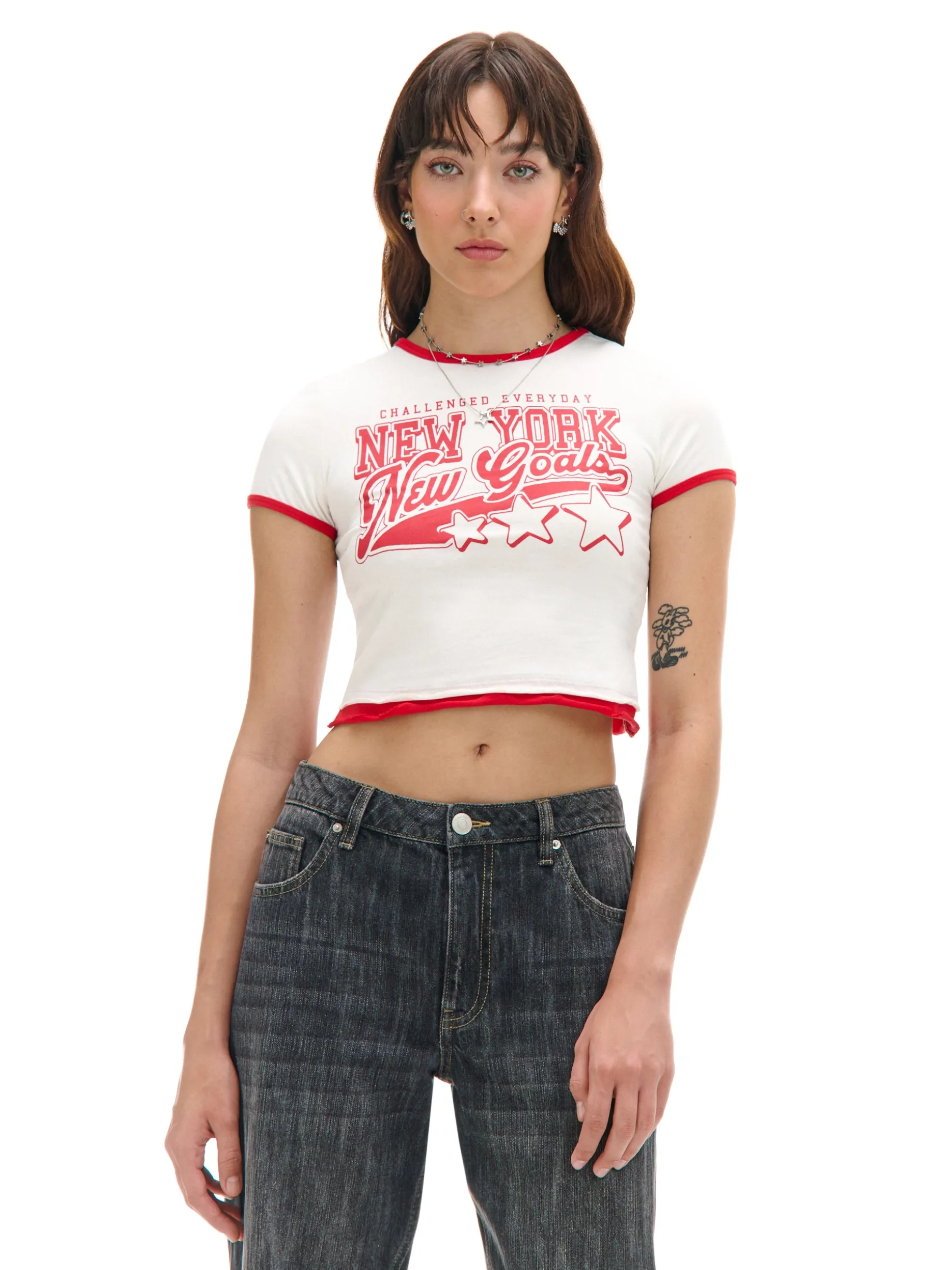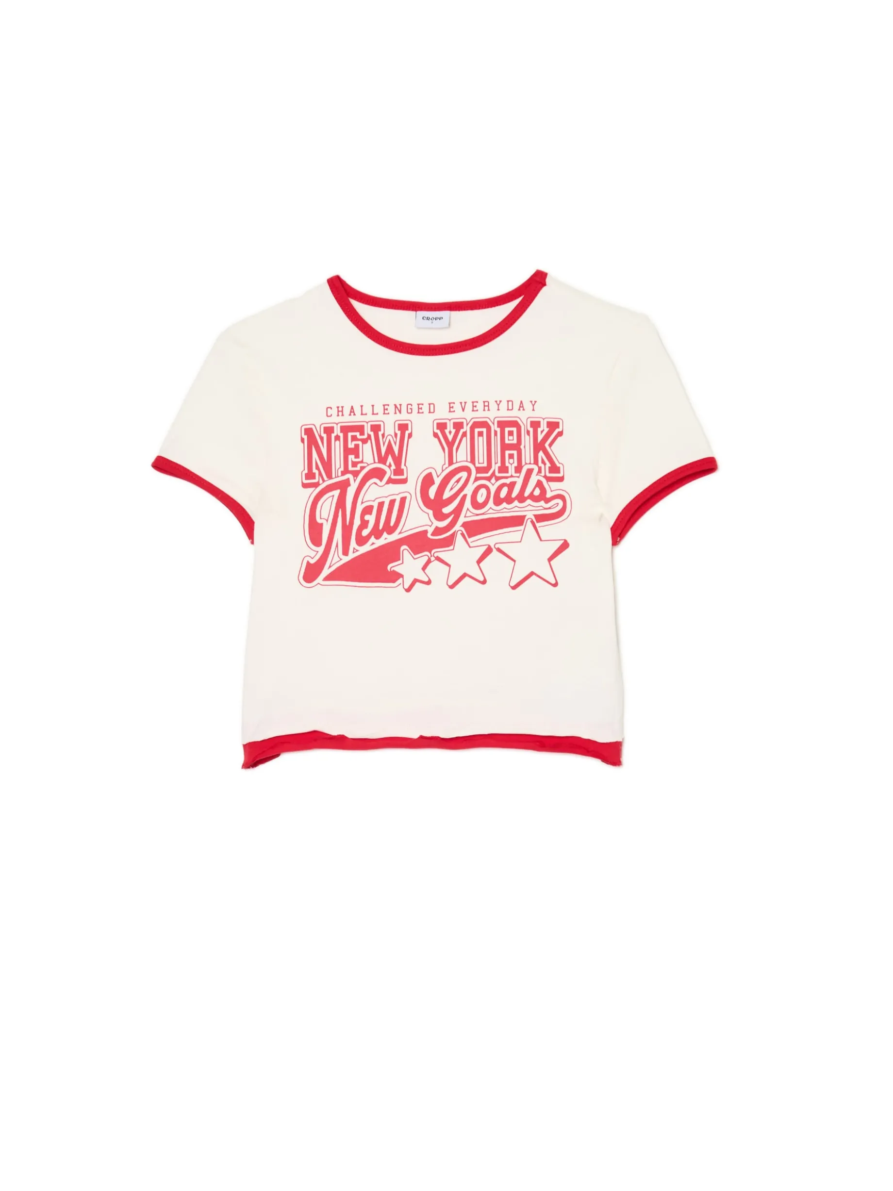 Koszulka damska o dopasowanym kroju, uszyta z elastycznej mieszanki dzianin. Ten model z surowym wykończeniem brzegów i kontrastowym nadrukiem wyróżni Cię w tłumie. bawełna z dodatkiem elastycznych włókien dopasowany krój podkreślający sylwetkę okrągły dekolt krótkie, swobodne rękawy kontrastowe wykończenie lamówką surowe wykończenie brzegów duży nadruk z przodu