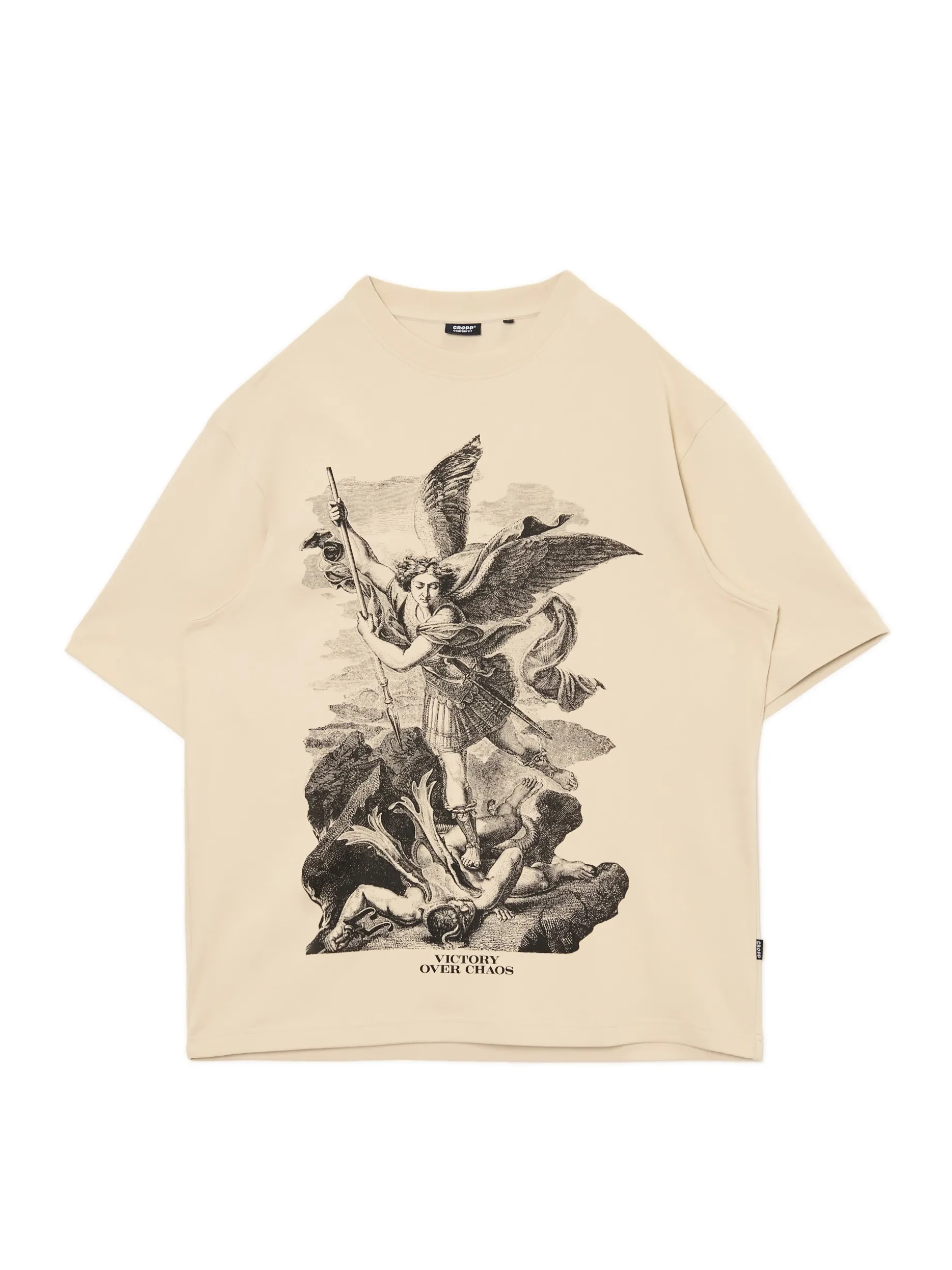 Męska koszulka, uszyta z bawełny w kolorze beżowym. Na przodzie artystyczny nadruk w malarskim stylu. 100% bawełny wygodny krój comfort krótkie rękawy z obniżoną linią ramion oryginalny print Wzrost modela: 185 cm