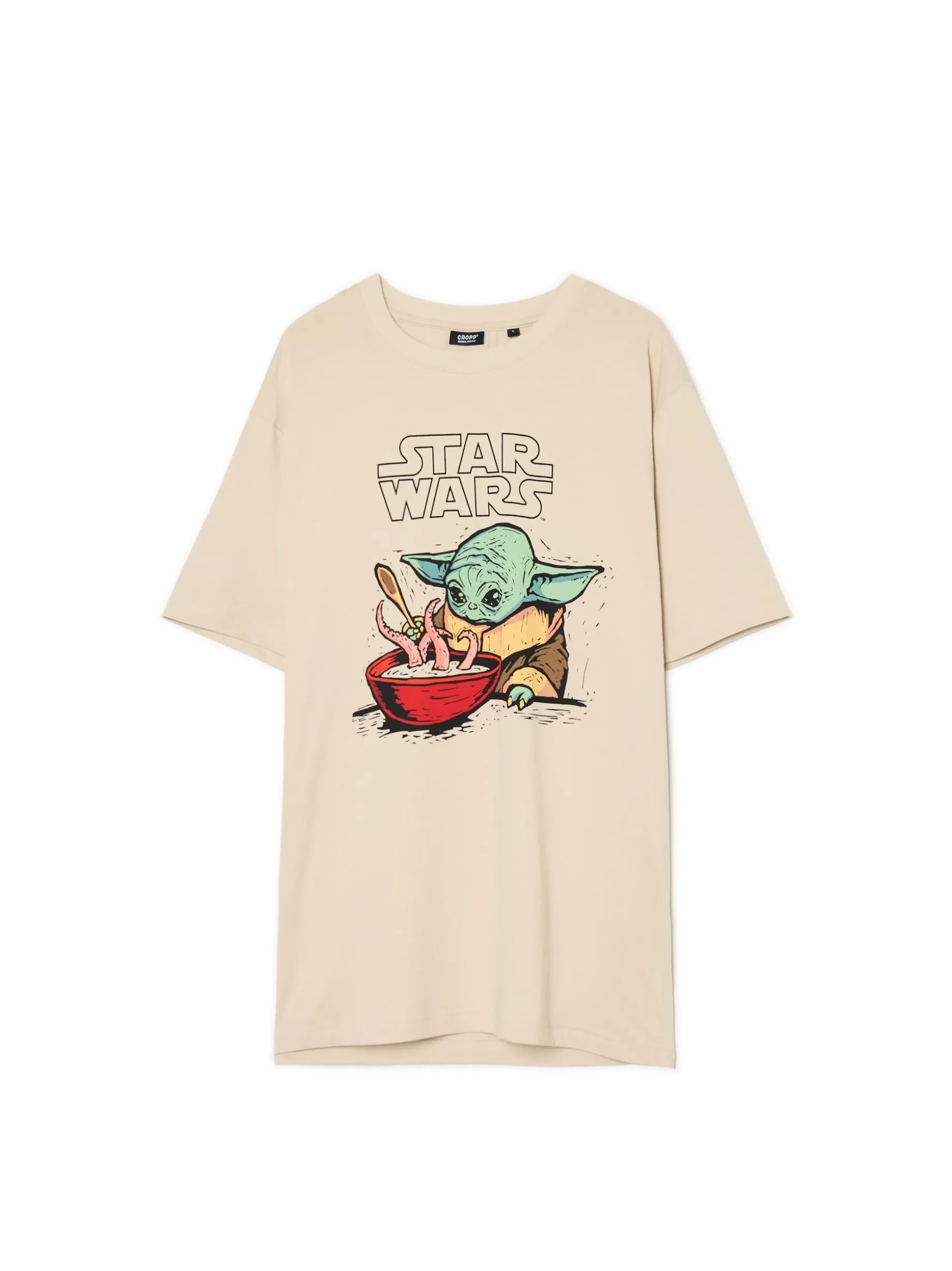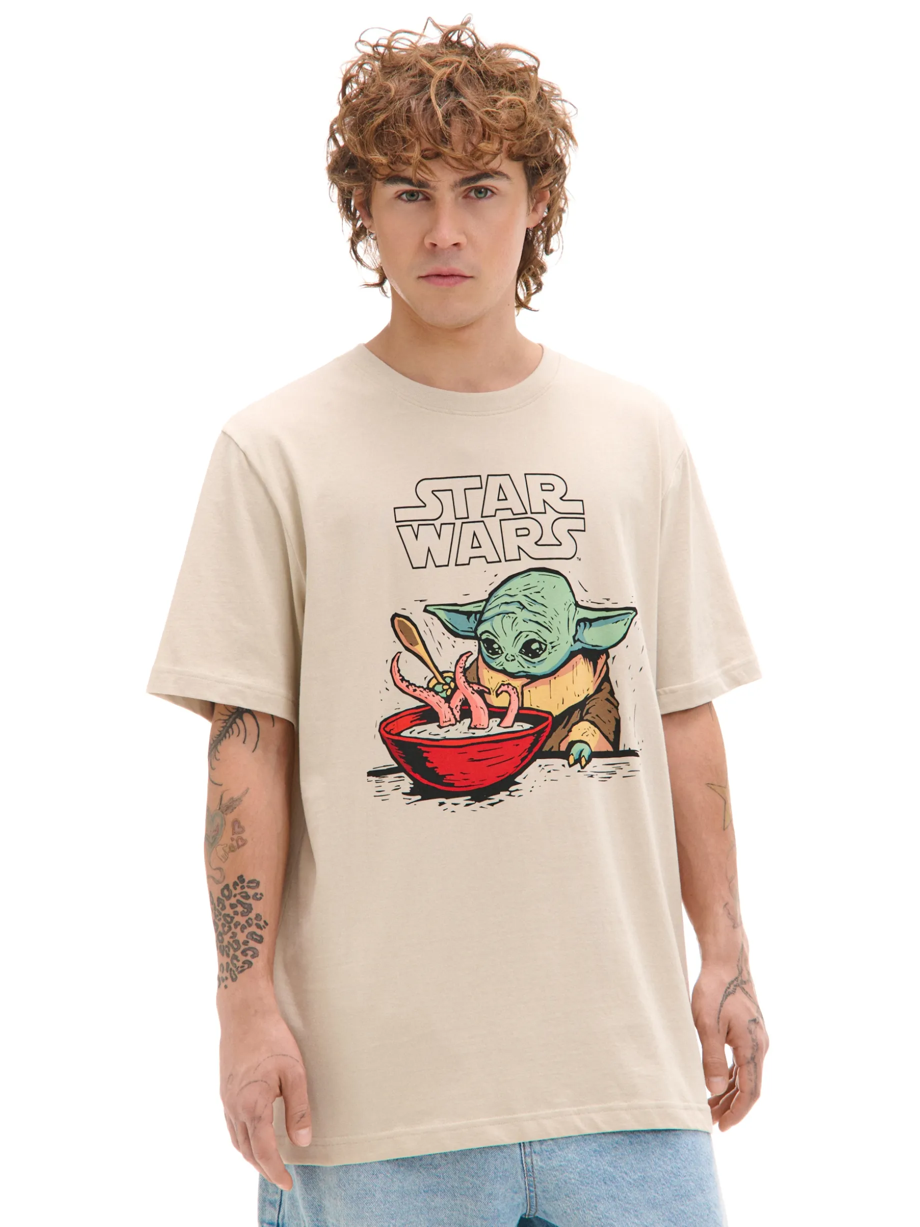 Męski T-shirt z krótkim rękawem w beżowym odcieniu przedstawia jedzącego Grogu. Baby Yoda potrzebuje opieki! Zainteresowanych prosimy o wrzucenie malucha do koszyka. Nasi zaprzyjaźnieni Mandalorianie chętnie przekażą przesyłkę w dobre ręce. 100% bawełny regularny krój okrągły dekolt krótkie, swobodne rękawy z przodu nadruk Star Wars © & TM Lucasfilm Ltd.