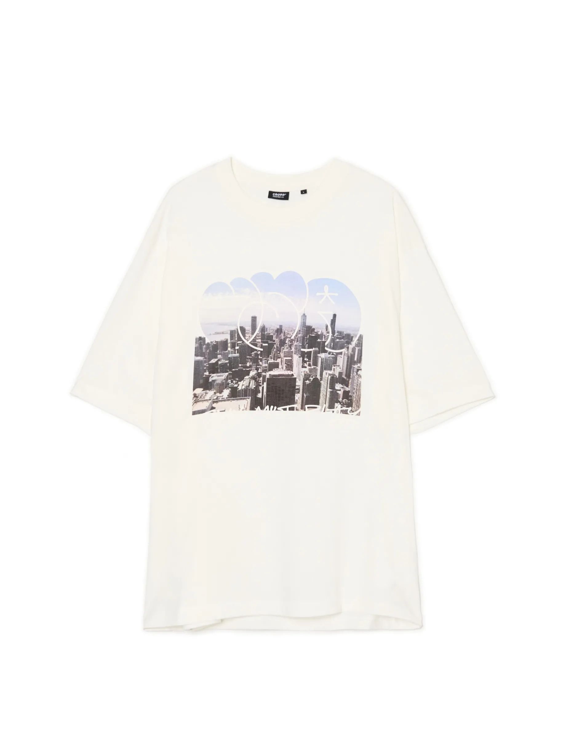 Bawełniany męski T-shirt z krótkim rękawem i fotoprintem amerykańskiego miasta Nowy Jork. 100% bawełny wygodny krój comfort okrągły dekolt z lamówką krótkie, swobodne rękawy kontrastowy fotoprint z przodu Wzrost modela: 185 cm