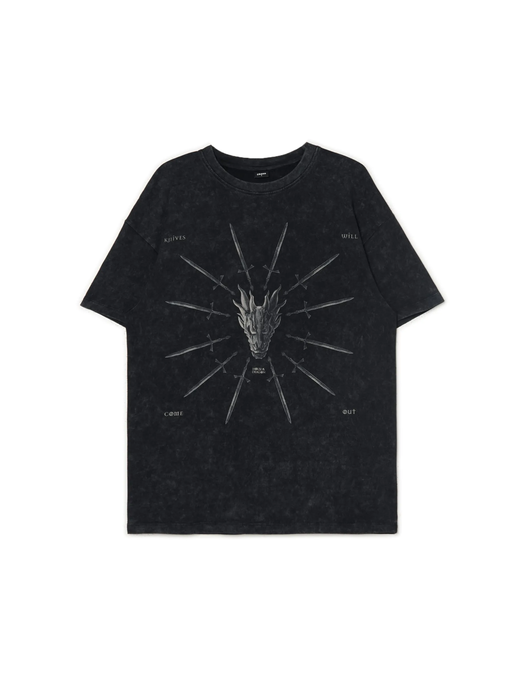 Damski T-shirt o kroju oversize uszyty z bawełnianej dzianiny z licencjonowaną grafiką z serii filmowej 'Ród Smoka’. 100% bawełny krój oversize krótkie, swobodne rękawy duży nadruk z przodu delikatny efekt sprania Ten produkt należy do kolekcji UNISEX – zalecamy wybranie mniejszego rozmiaru niż zazwyczaj, jeśli chcesz uniknąć efektu oversize. HOUSE OF DRAGON and all related characters and elements © & TM HBO, Inc. (s24)