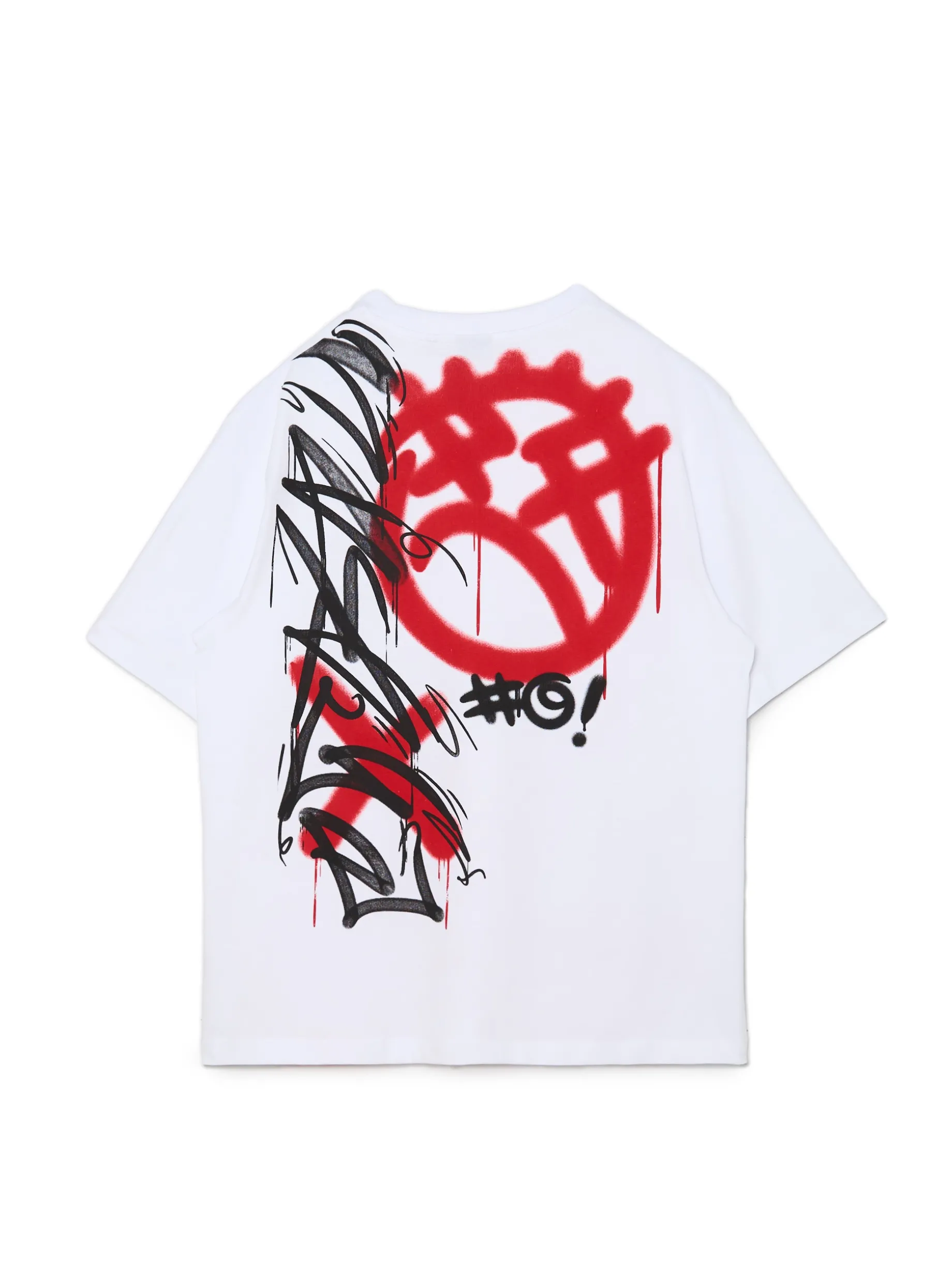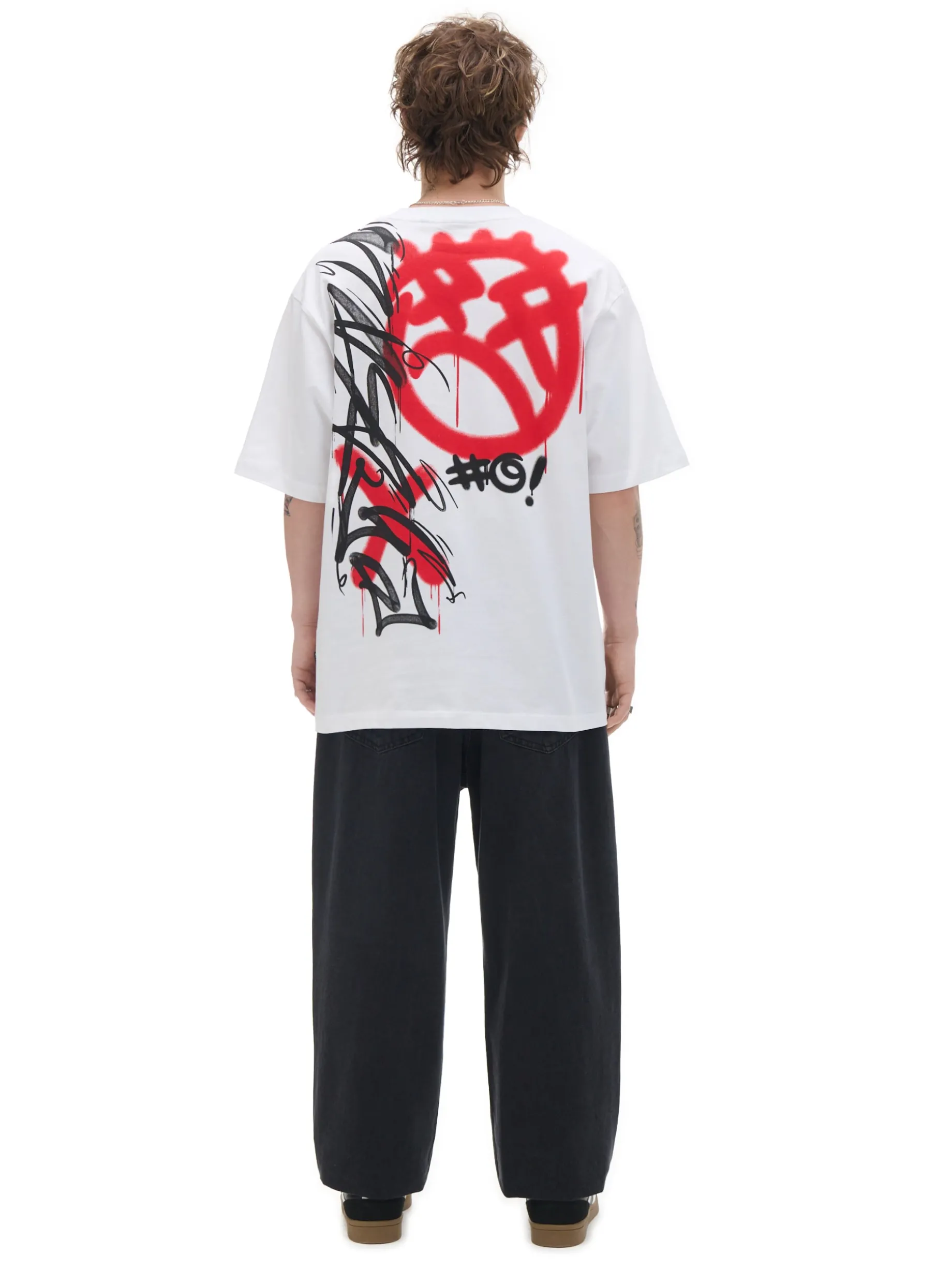 Biały męski t-shirt comfort uszyty w 100% z bawełny. Ozdobę stanowią 2 duże printy z przodu i na plecach w formie graffiti.