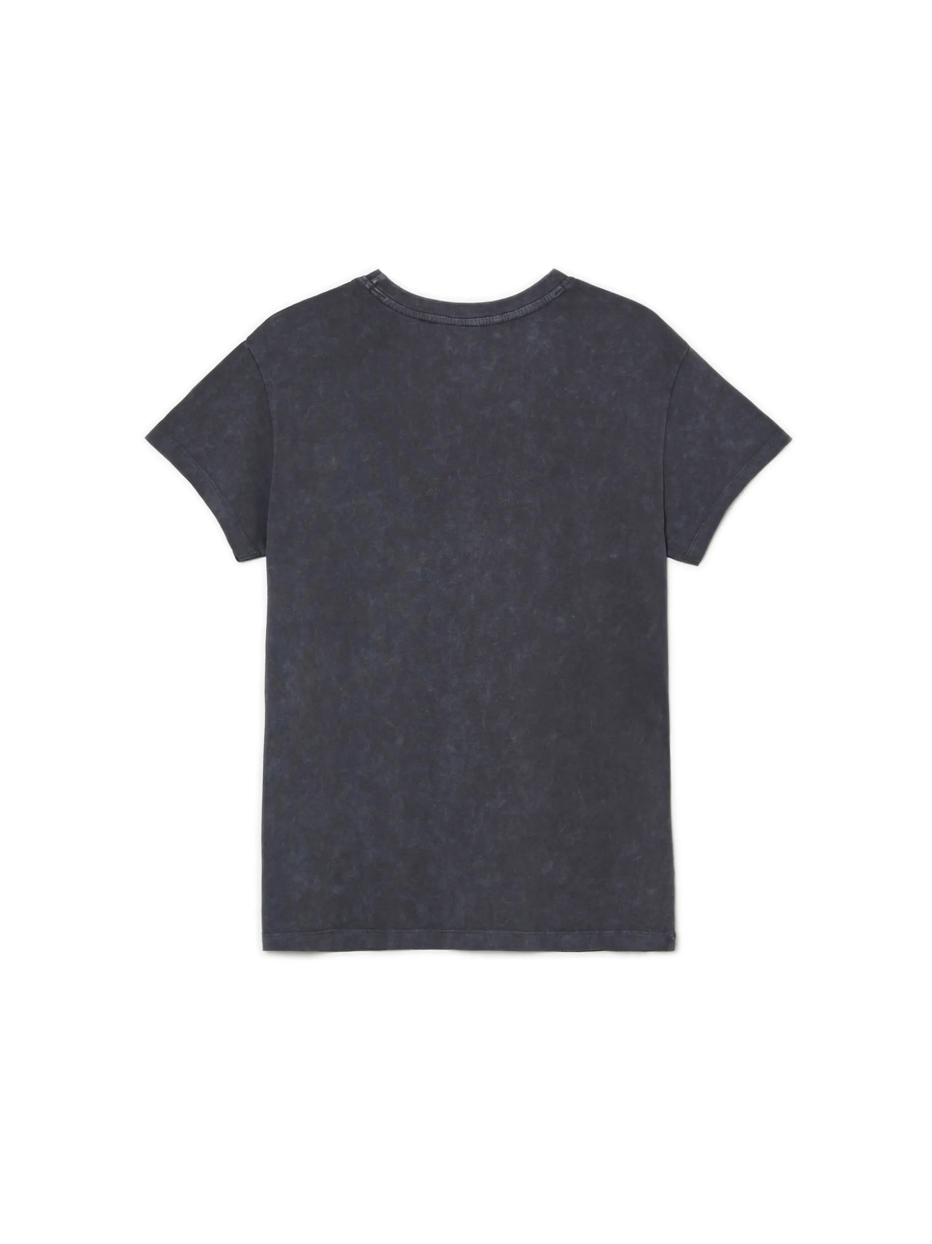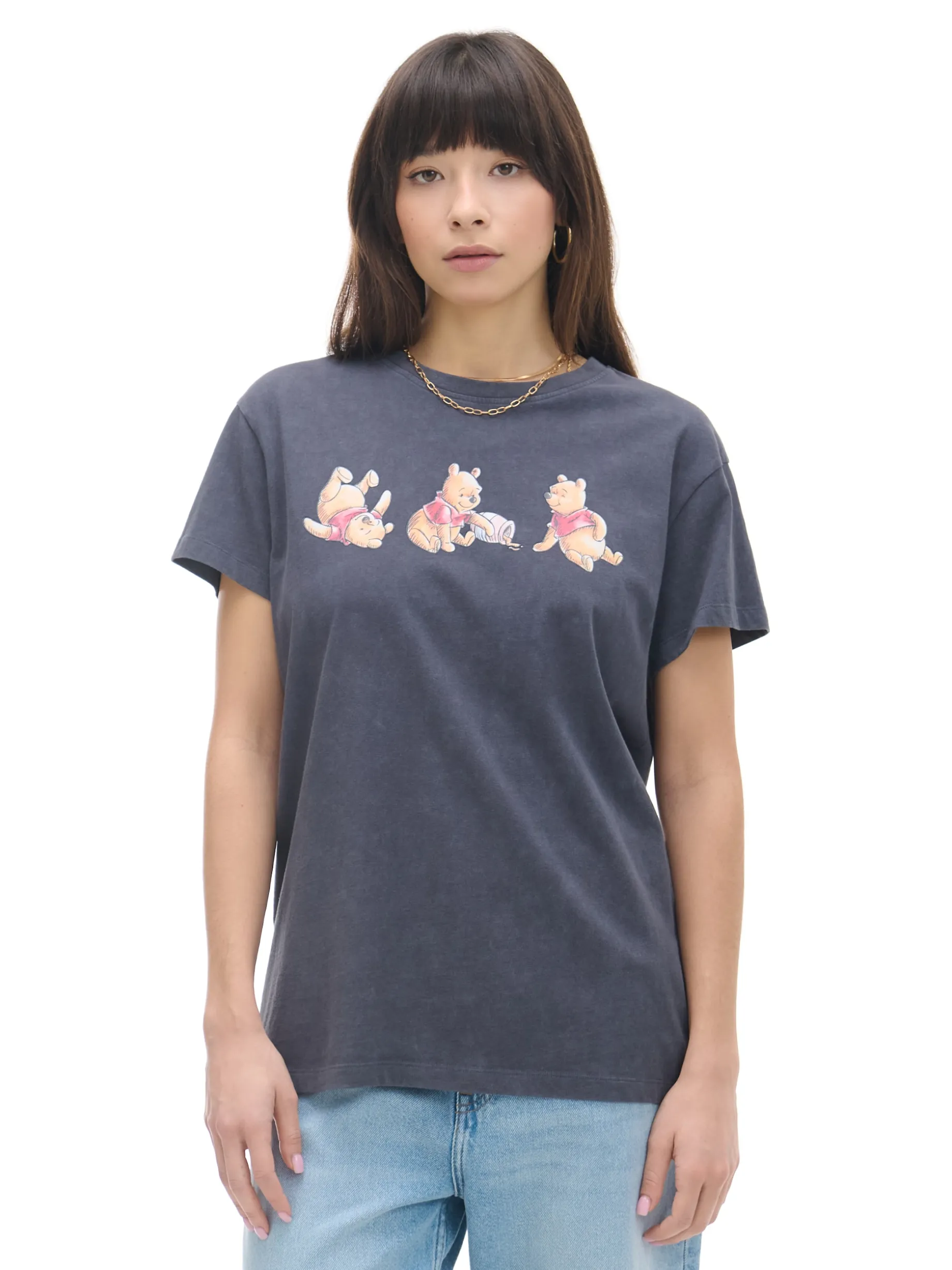 Ciemnoszara koszulka damska o kroju oversize, z obniżoną linią ramion. Uszyta z bawełny. Z przodu nadruk z Kubusiem Puchatkiem, na całości efekt acid wash. ©Disney