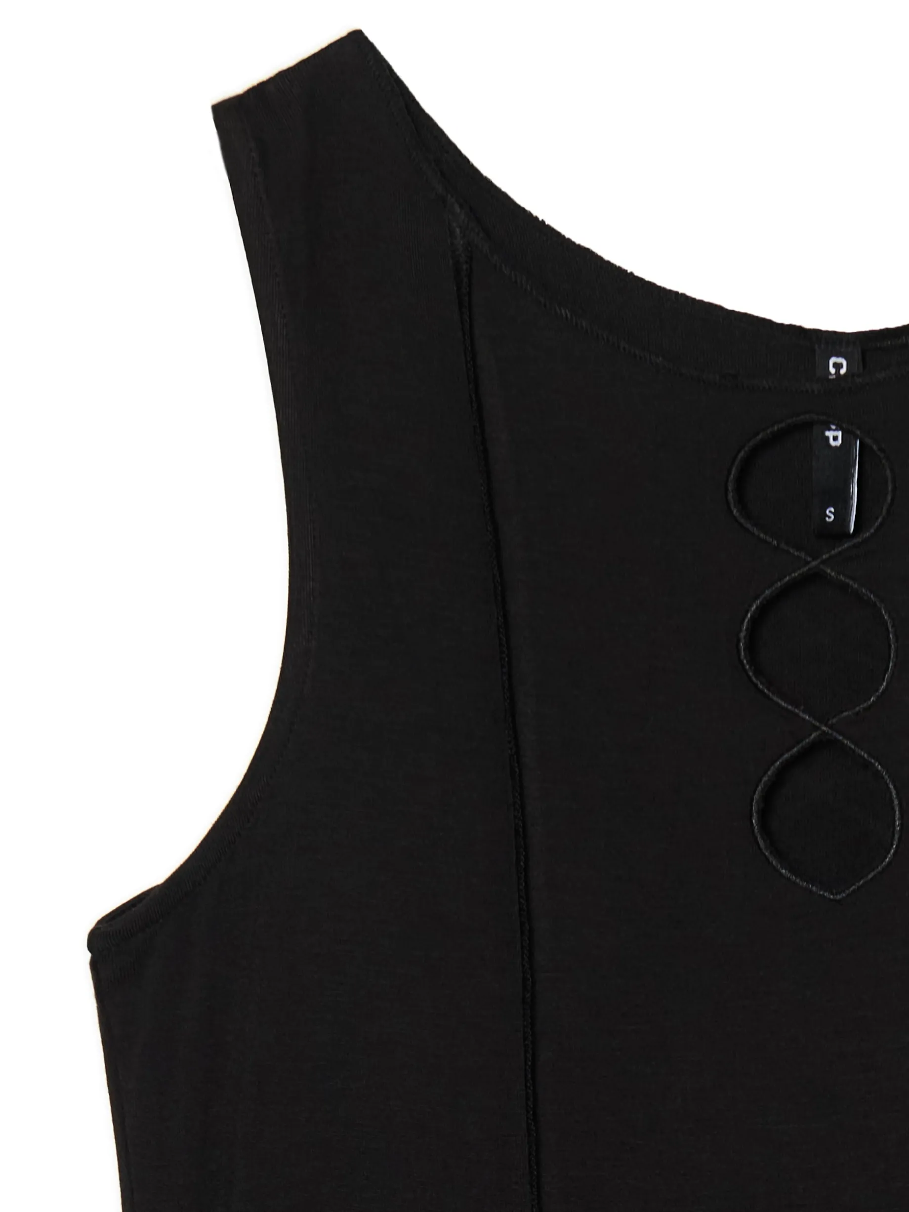 Czarna damska koszulka uszyta z lekkiej, wiskozowej dzianiny z dodatkiem elastycznych włókien. Na przodzie dekoracyjne wycięcia i ozdobne przeszycia. wiskoza z domieszką elastycznych włókien dopasowany krój podkreślający sylwetkę szersze ramiączka ozdobny zewnętrzny szew z przodu ozdobne rozcięcia Wzrost modelki: 172 cm