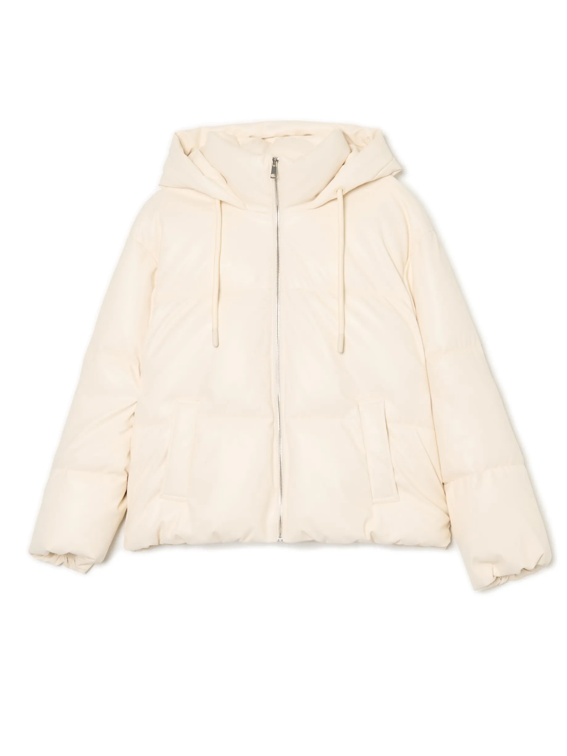 Ciepła damska pufferka, uszyta z jasnej, lekko połyskliwej tkaniny. regularny krój zapięcie na suwak kaptur regulowany sznurkiem stójka pod szyją elastyczna gumka wszyta w dolny brzeg dwie kieszenie z przodu, zapinane na zatrzask długie rękawy z wewnętrznym elastycznym mankietem podszewka i ocieplenie