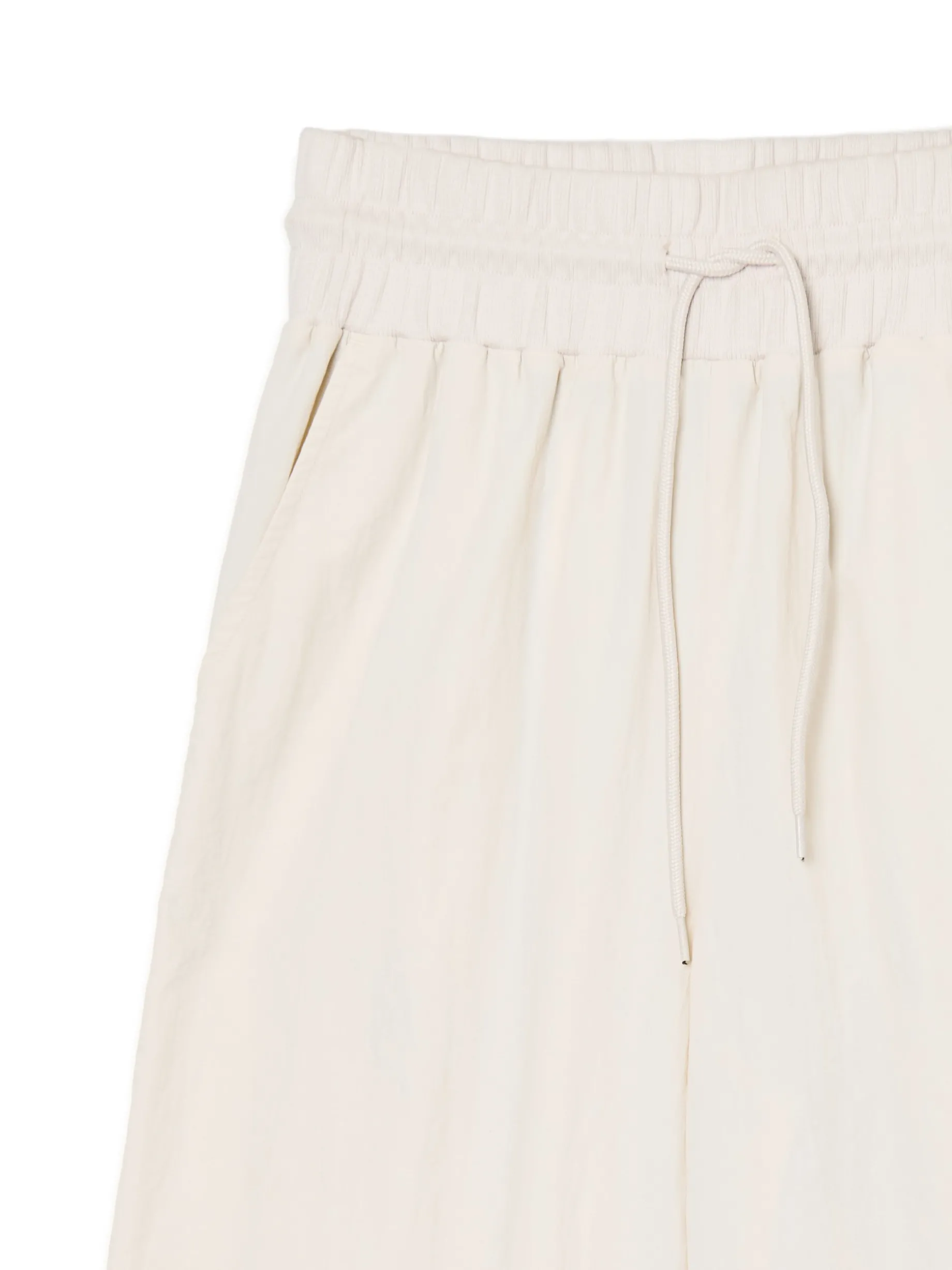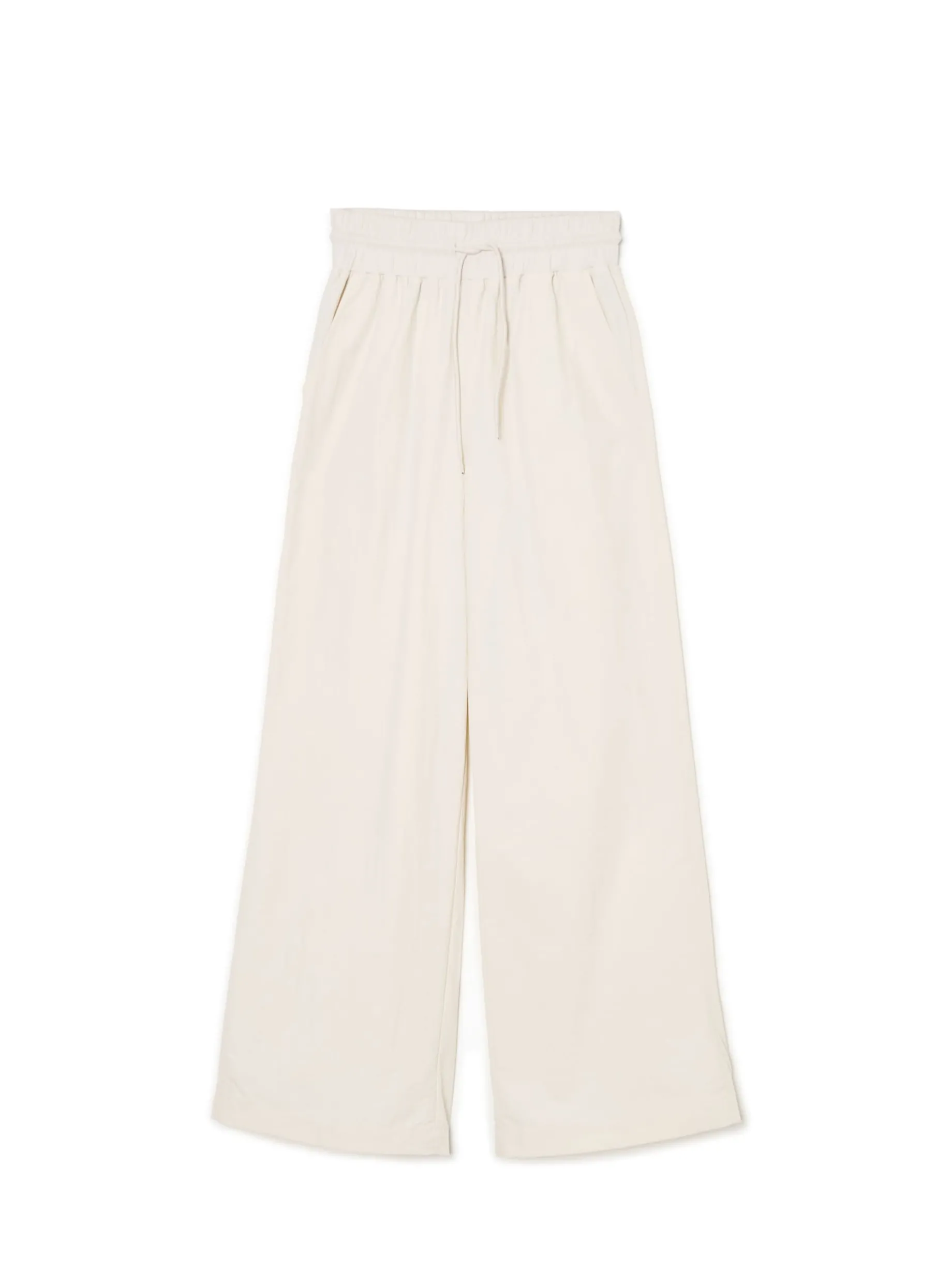 Kremowe damskie spodnie z szerokimi nogawkami, uszyte z trwałej tkaniny. Komfort zapewnia luźny krój, który nie krępuje ruchów. Przygotuj się na nowy sezon! uszyte z gładkiej tkaniny obszerny krój baggy wysoki stan długie, szerokie nogawki elastyczna gumka w pasie sznurek w pasie Tworzy zestaw z modelem 185AR-01X .