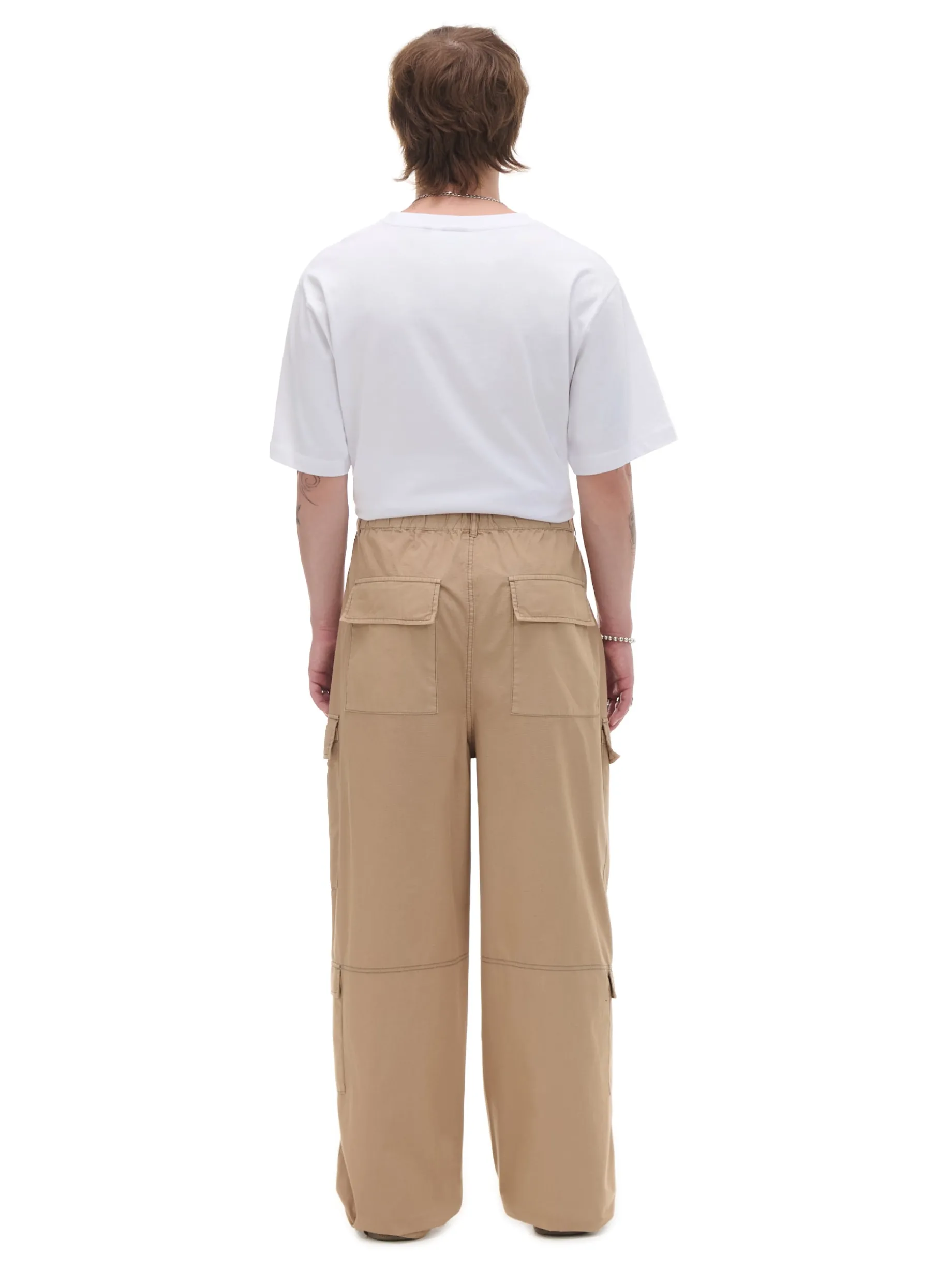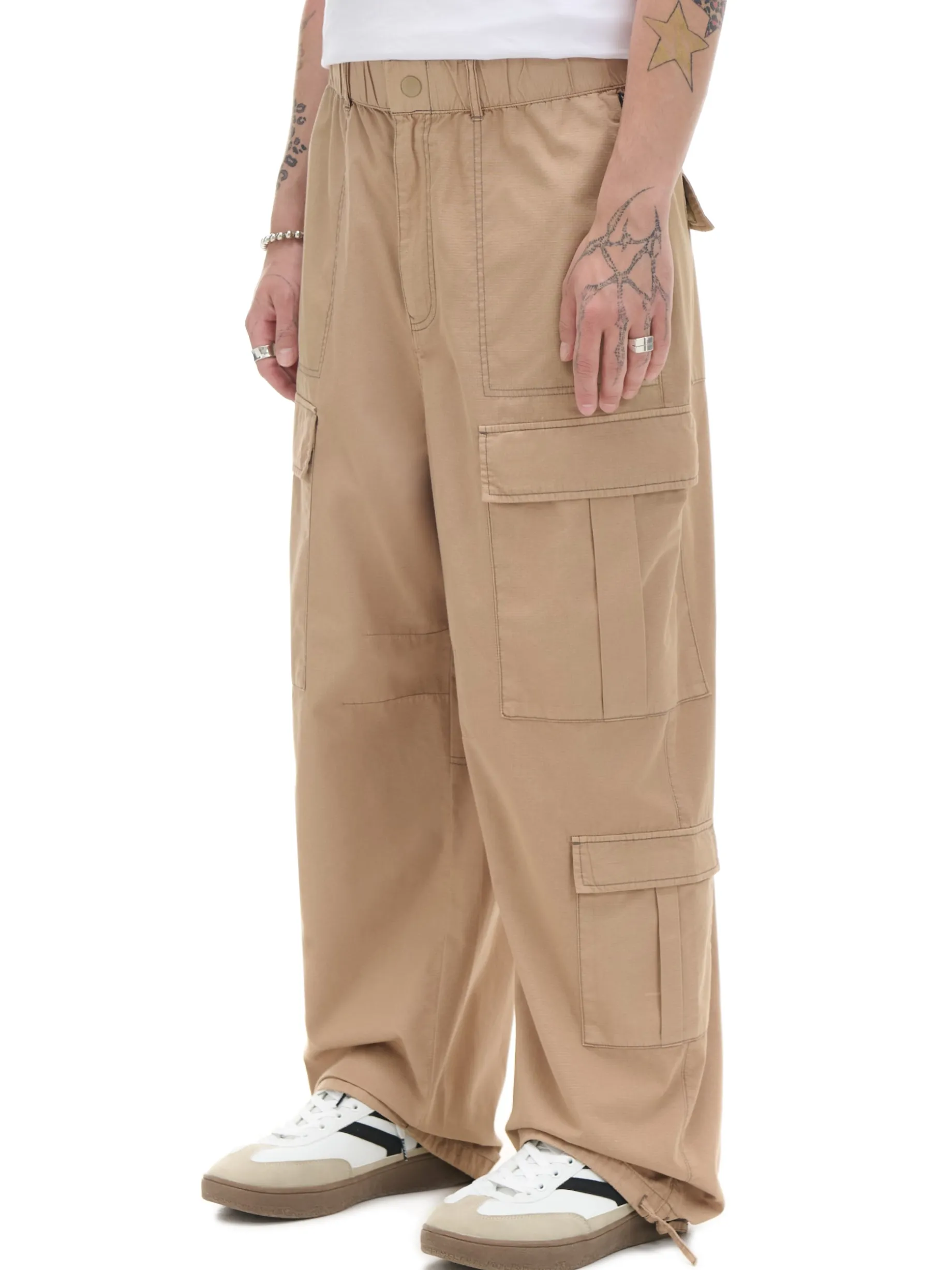 Męskie spodnie uszyte z dzianiny o dużej zawartości bawełny w jasnym odcieniu. Wyjątkowe w tym modelu są praktyczne kieszenie oraz wygodne ściągacze w nogawkach. dzianinowy materiał z bawełną swobodny, luźny krój zapięcie na suwak i guzik długie, szerokie nogawki nogawki zakończone ściągaczem dwie naszywane kieszenie z przodu kieszenie z patkami z tyłu dodatkowe kieszenie cargo na nogawkach kontrastowe przeszycia