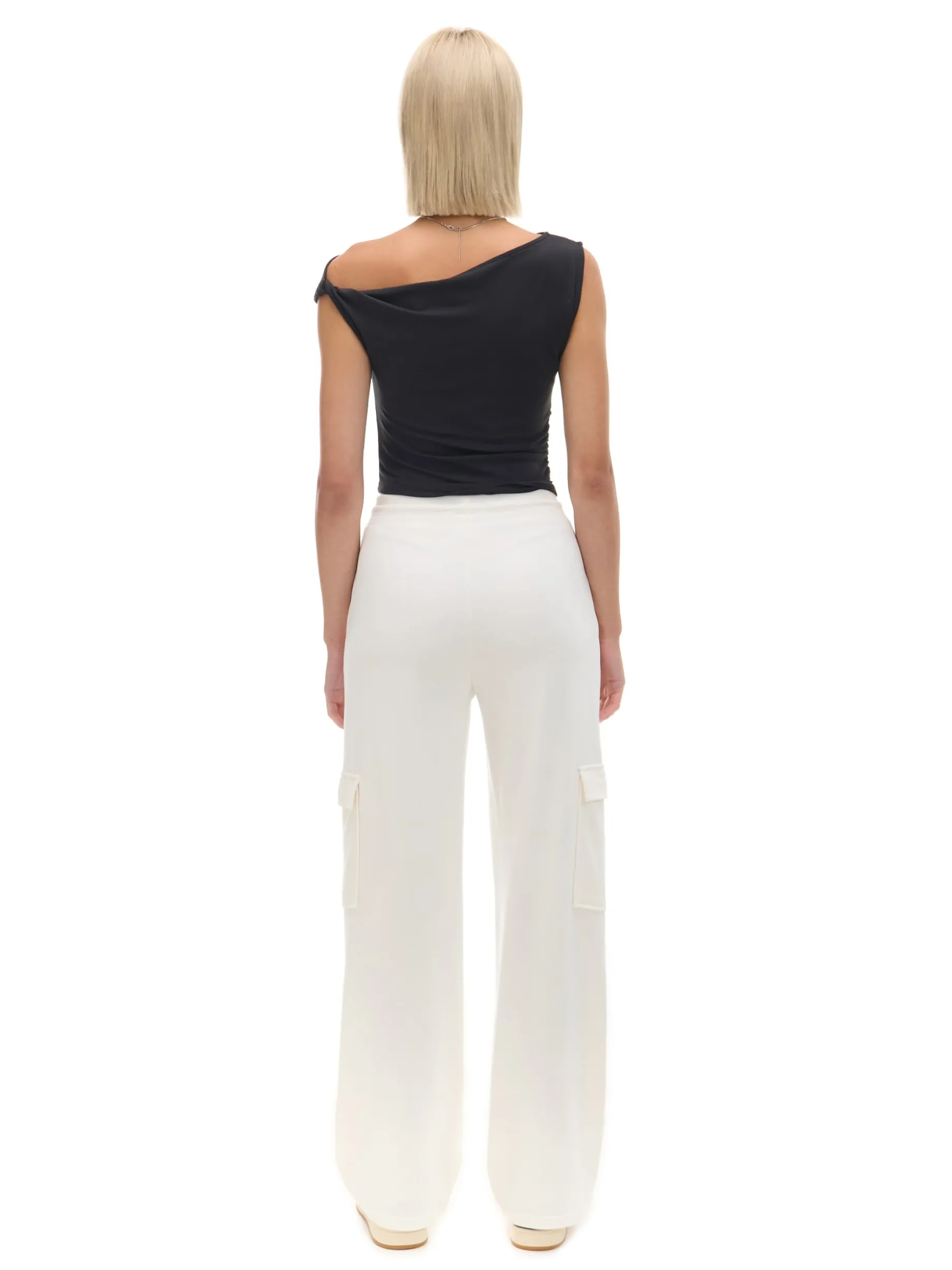 Damskie spodnie dresowe w jasnym kolorze, uszyte z dzianiny o dużej zawartości bawełny. dzianinowy materiał z bawełną prosty krój guma w pasie ze sznurkiem do regulacji długie, proste nogawki otwarte kieszenie z przodu dwie duże naszywane kieszenie okryte patkami Wzrost modelki: 177 cm