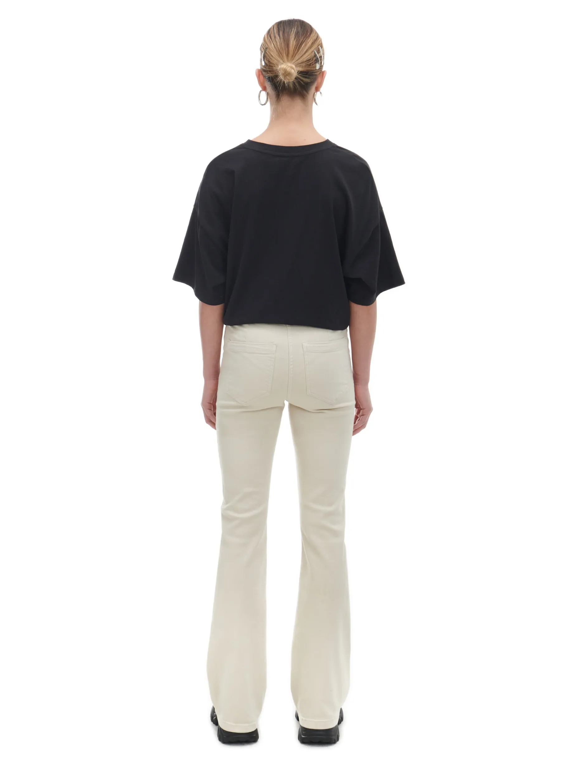 Kremowe damskie spodnie o kroju dzwonów, uszyte z bawełny z dodatkiem elastycznych włókien. regularny stan zapięcie na zamek i zatrzask dwie kieszenie z tyłu nogawka rozszerzająca od kolana w dół szlufki na pasek ozdobny szew z przodu Wzrost modelki: 177 cm Wzrost modelki: 170 cm