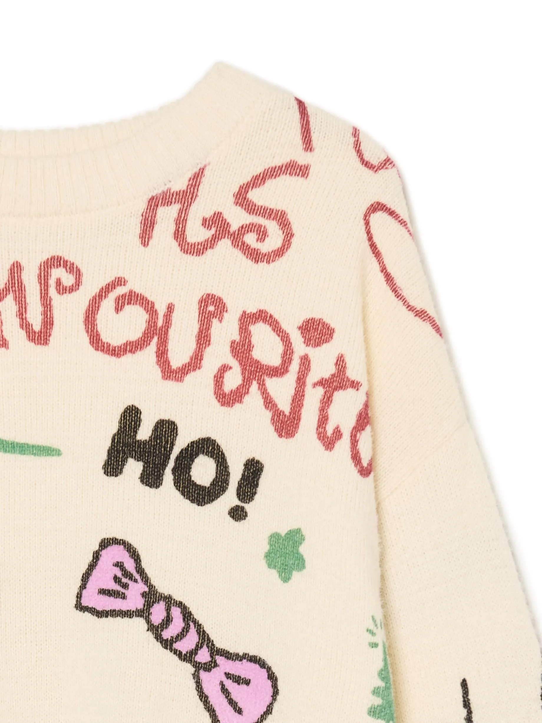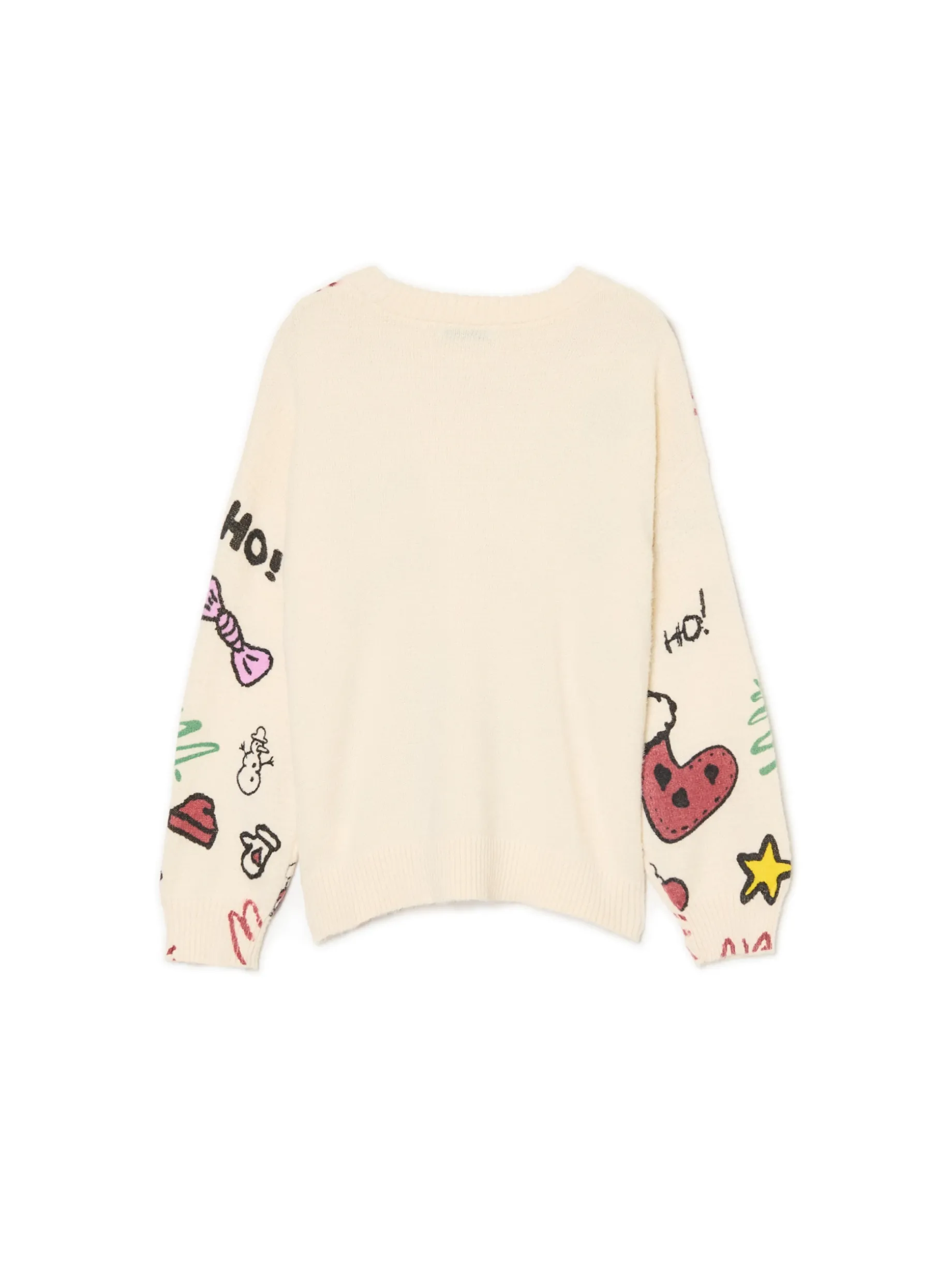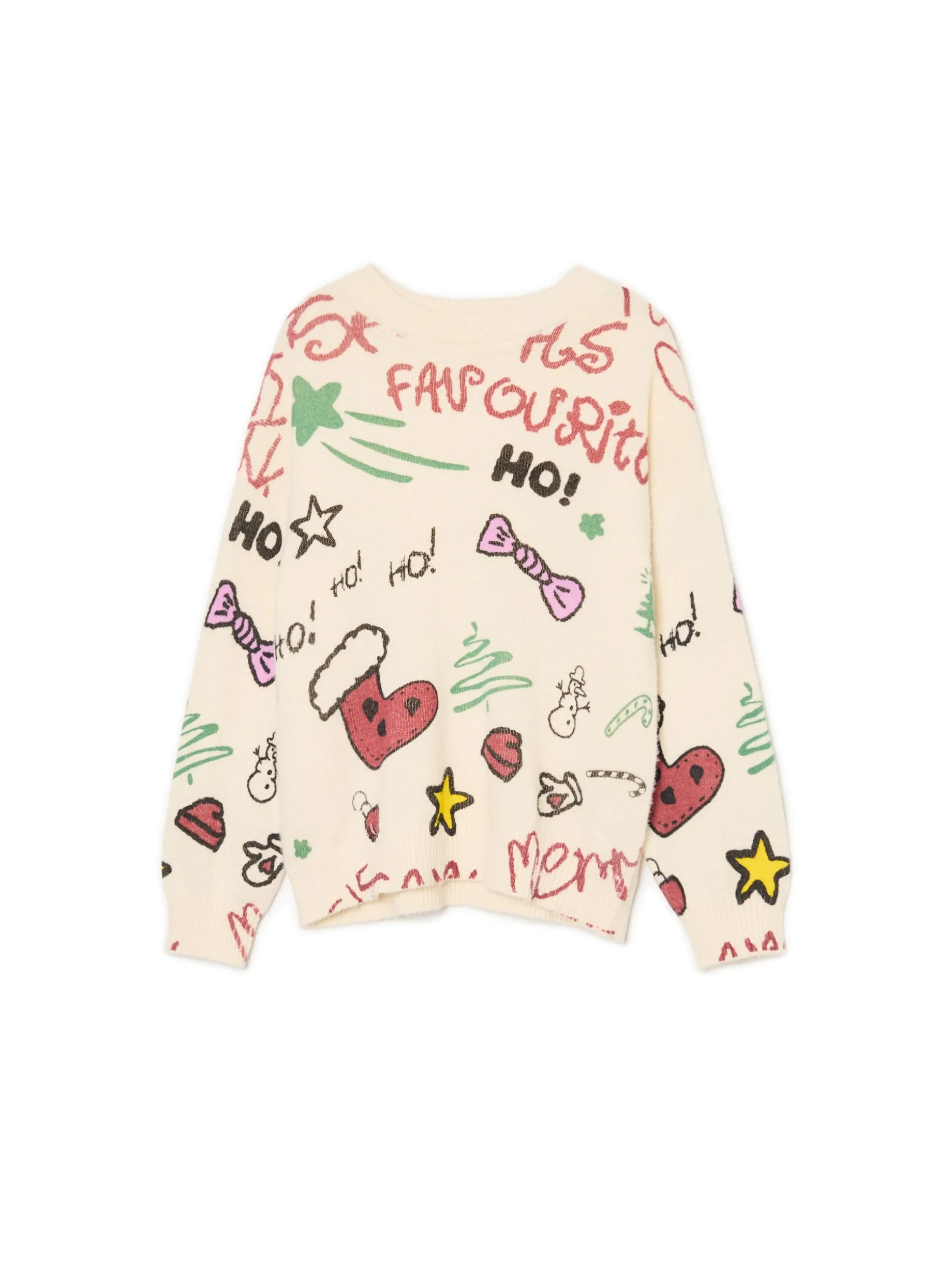 Christmas mode on! Mamy dla Ciebie ciepły damski sweter o regularnym kroju, uszyty z mieszanki dzianin z lekkim meszkiem. Na całej powierzchni nieregularne nadruki w świątecznym stylu. przyjemny w dotyku materiał regularny krój okrągły dekolt z lamówką dół i rękawy wykończone prążkowanym ściągaczem świąteczny nadruk Gramatura: 400 gsm