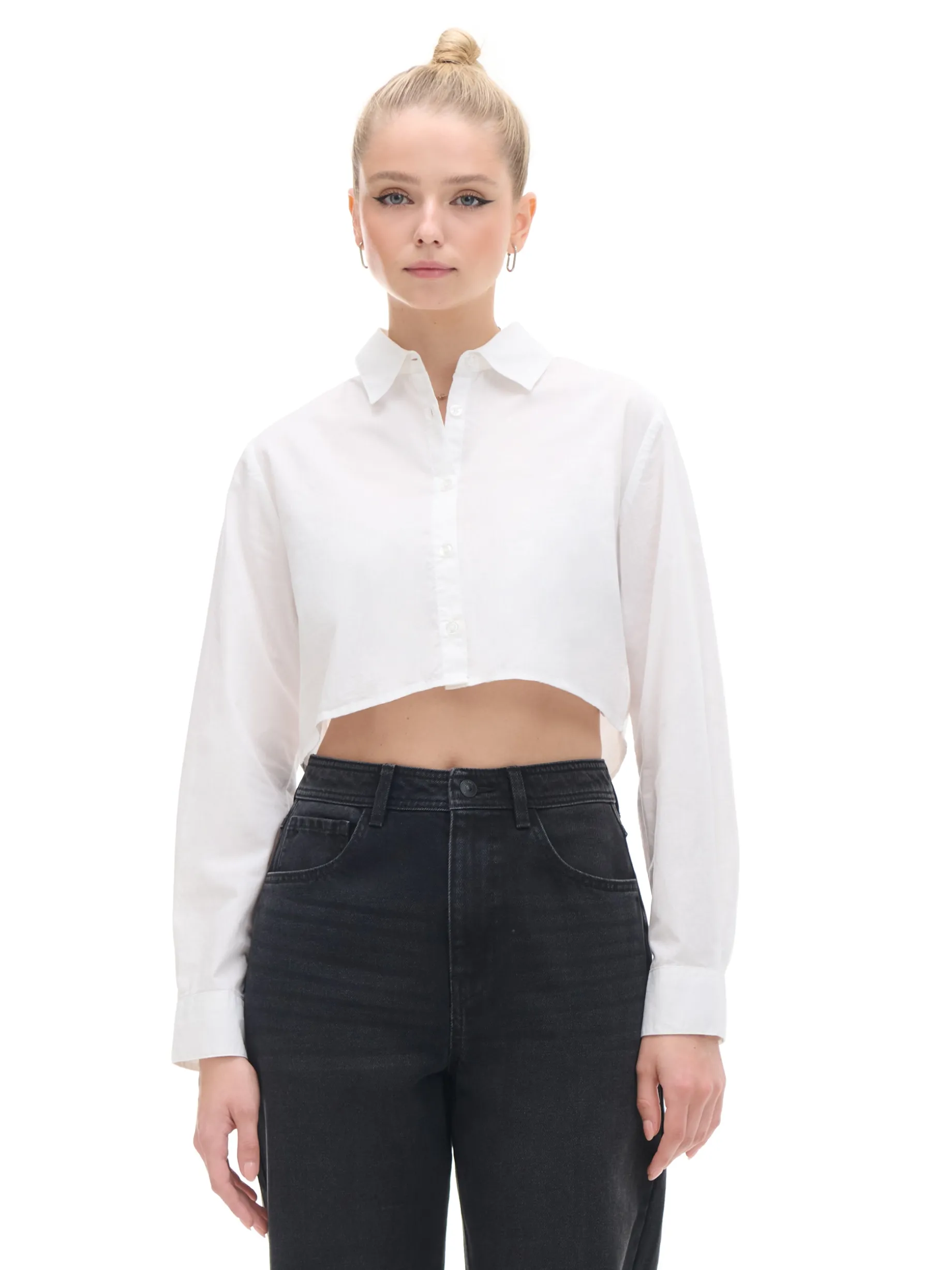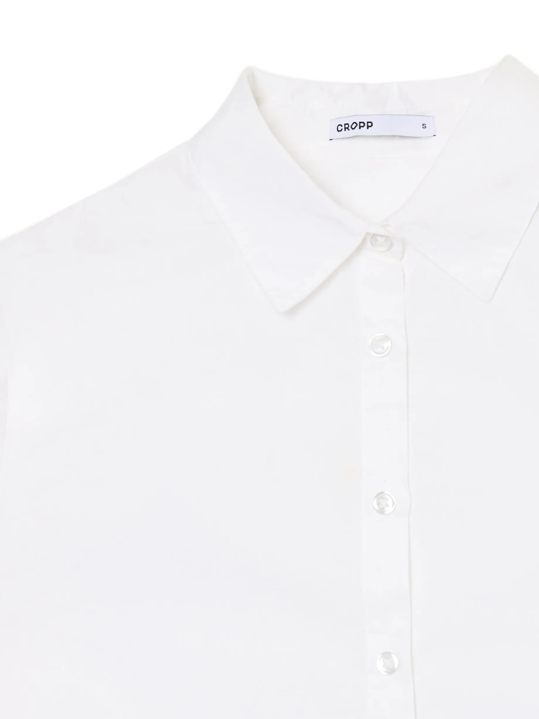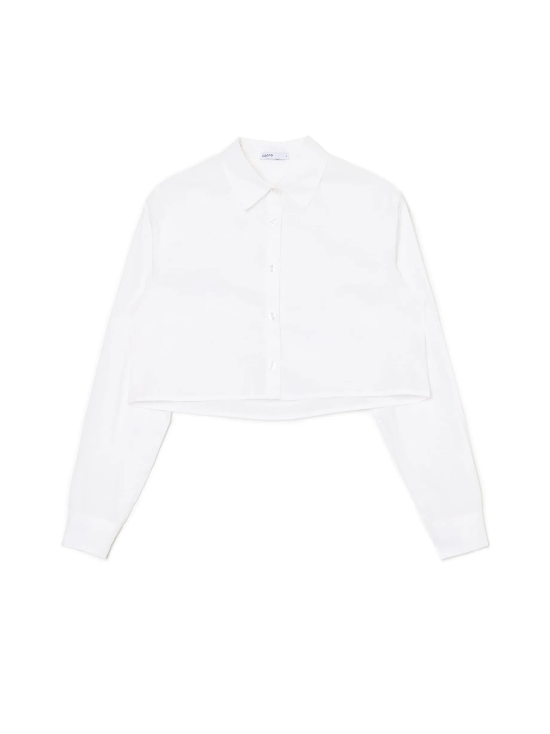 Damska koszula typu crop top z długimi rękawami, uszyta z białej bawełny. Nowoczesna forma klasyki na mniej lub bardziej oficjalne eventy. 100% bawełny krótszy krój zapięcie na jednorzędowe guziki długie rękawy zakończone mankietem z guzikiem klasyczny kołnierzyk