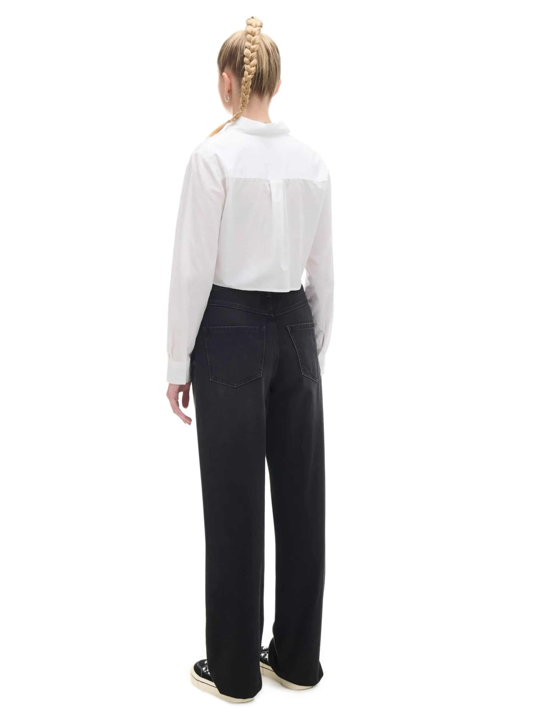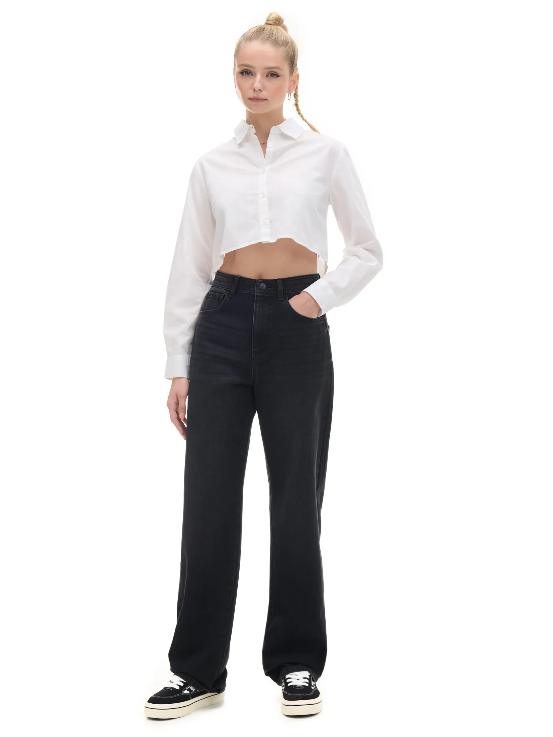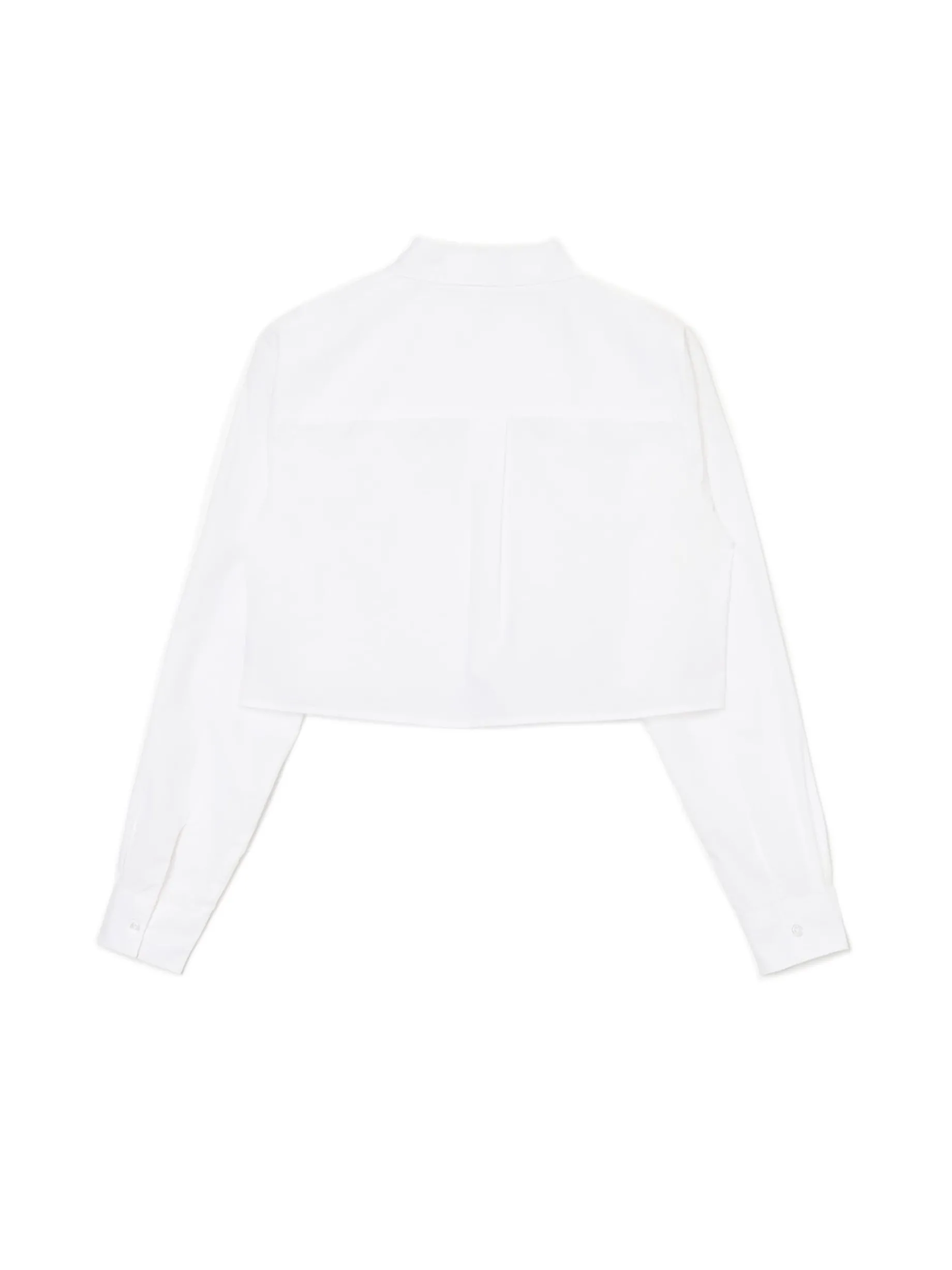 Damska koszula typu crop top z długimi rękawami, uszyta z białej bawełny. Nowoczesna forma klasyki na mniej lub bardziej oficjalne eventy. 100% bawełny krótszy krój zapięcie na jednorzędowe guziki długie rękawy zakończone mankietem z guzikiem klasyczny kołnierzyk