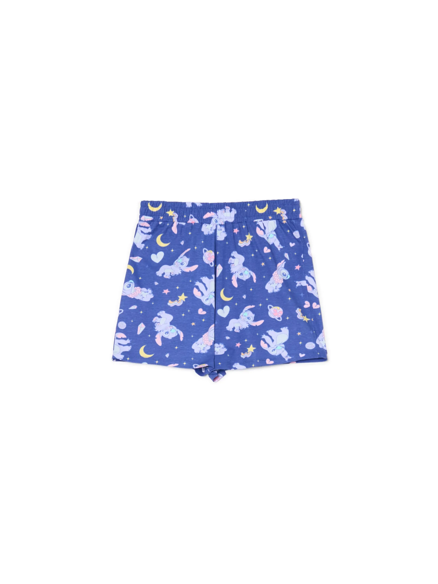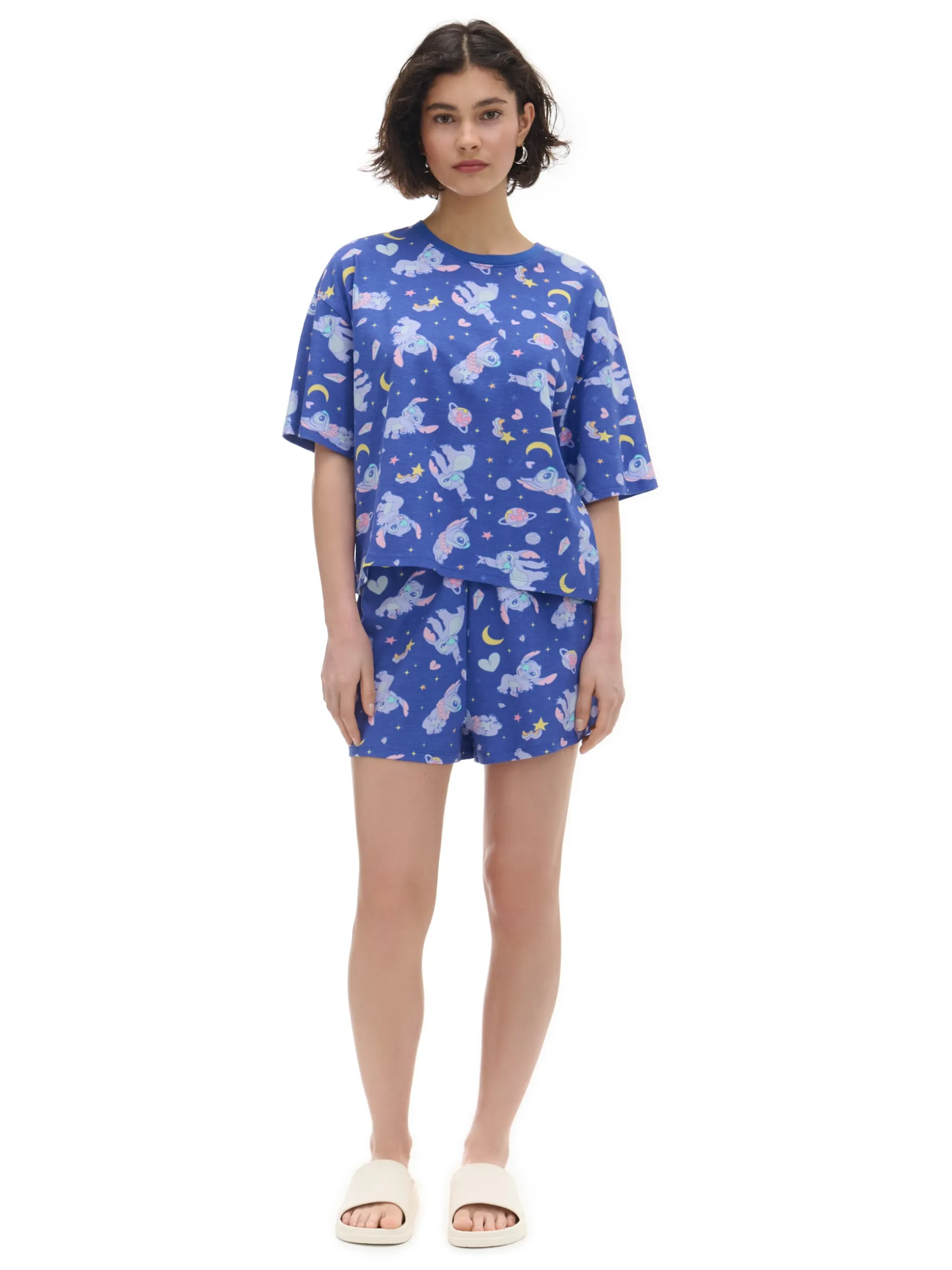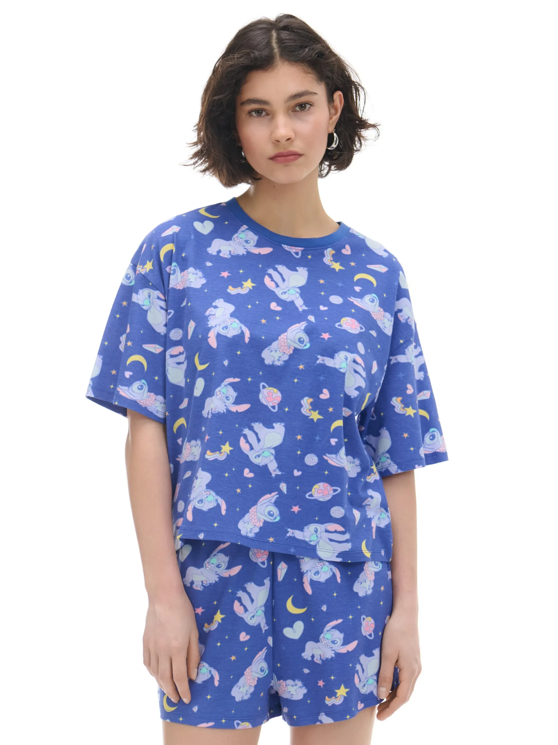 Lekka damska piżama, uszyta z bawełnianej dzianiny. luźna koszulka z krótkim rękawem szorty z gumką w pasie na całości nadruk z motywem Stitcha ©Disney