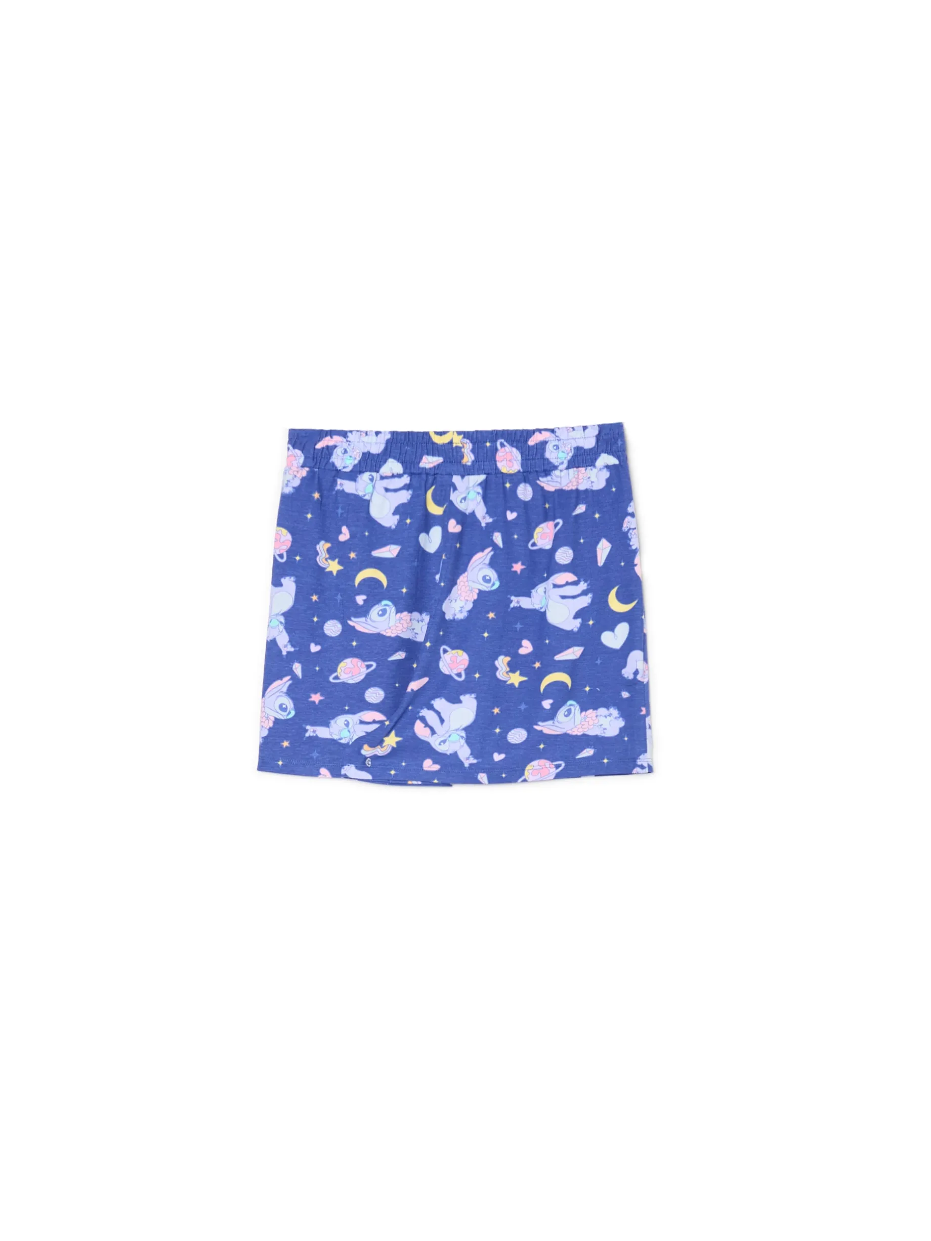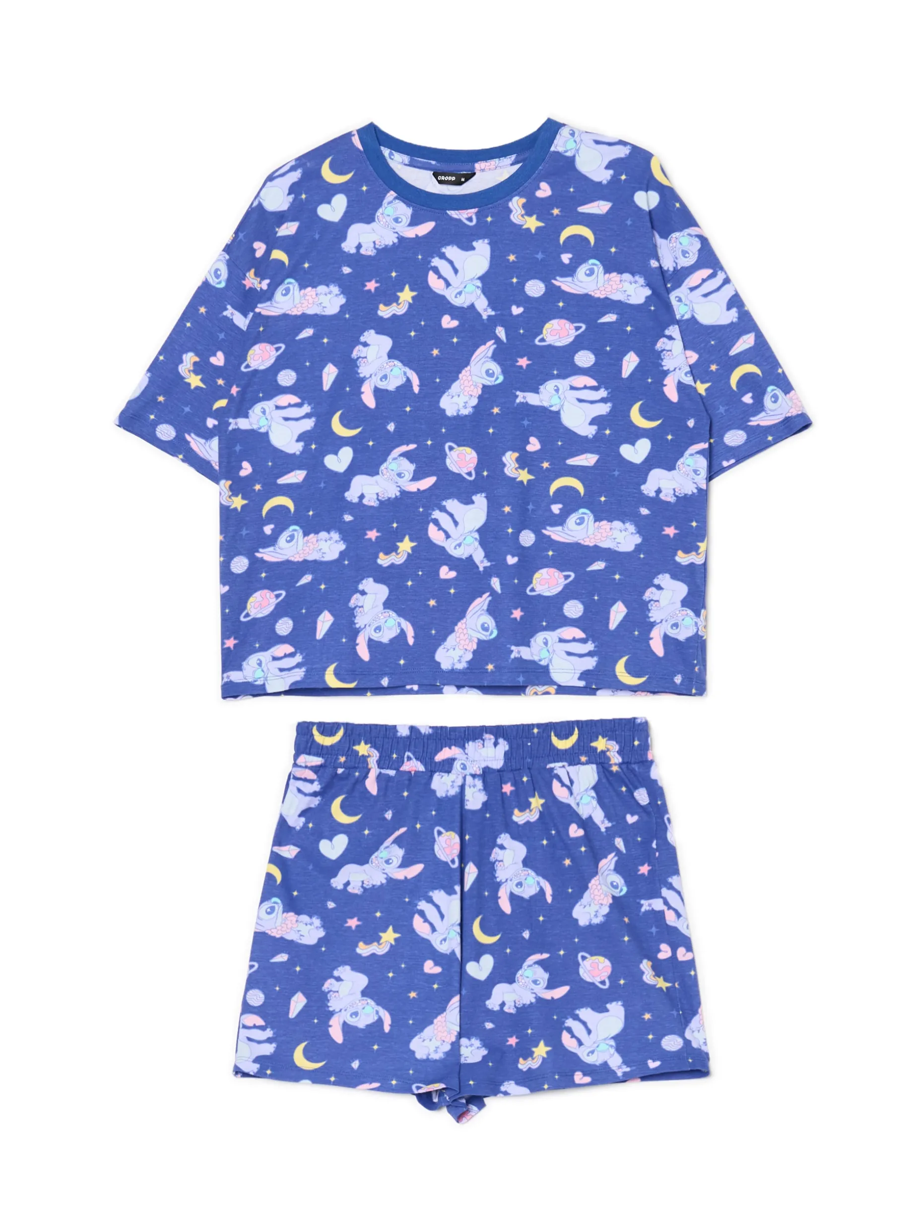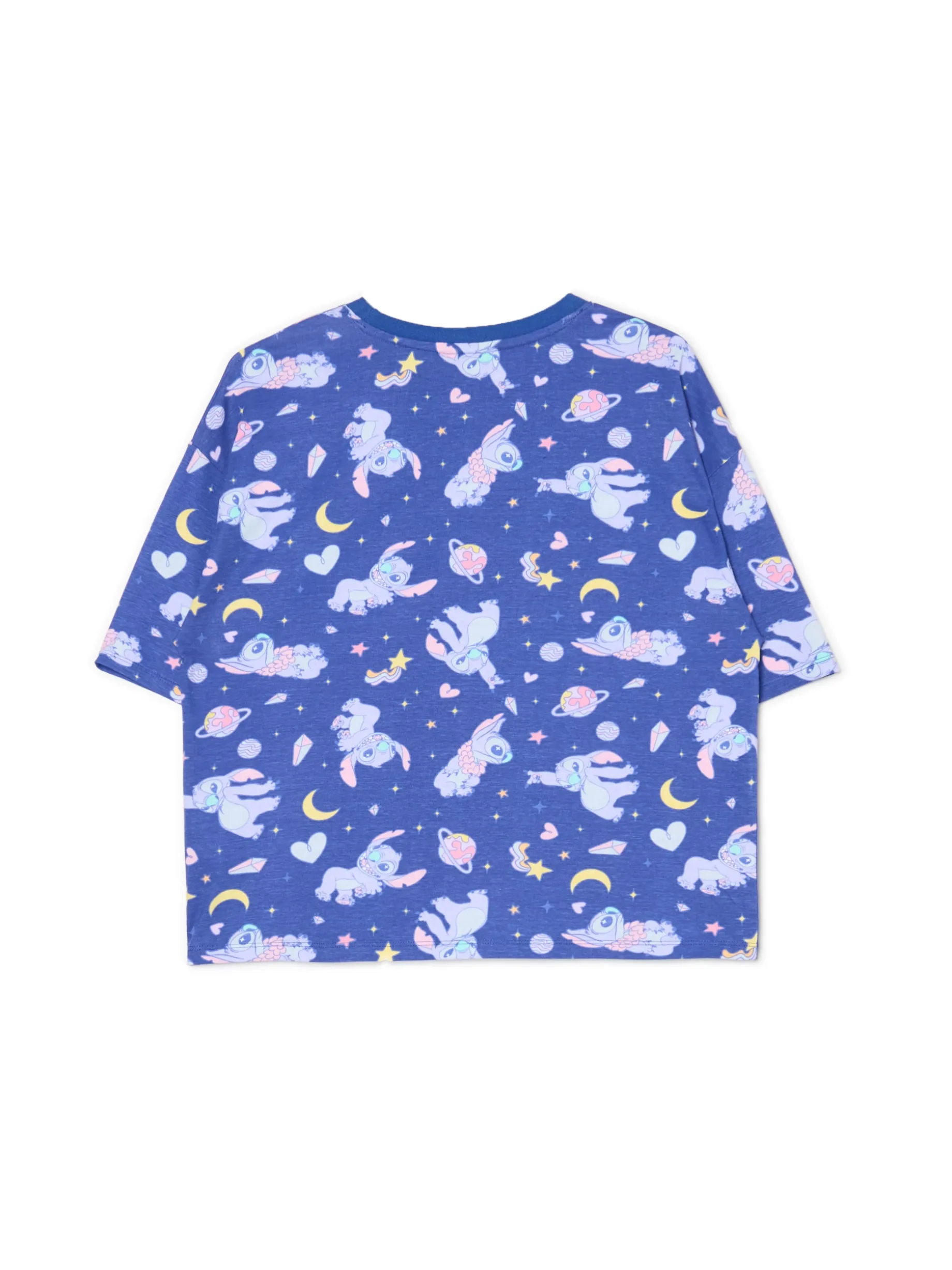 Lekka damska piżama, uszyta z bawełnianej dzianiny. luźna koszulka z krótkim rękawem szorty z gumką w pasie na całości nadruk z motywem Stitcha ©Disney